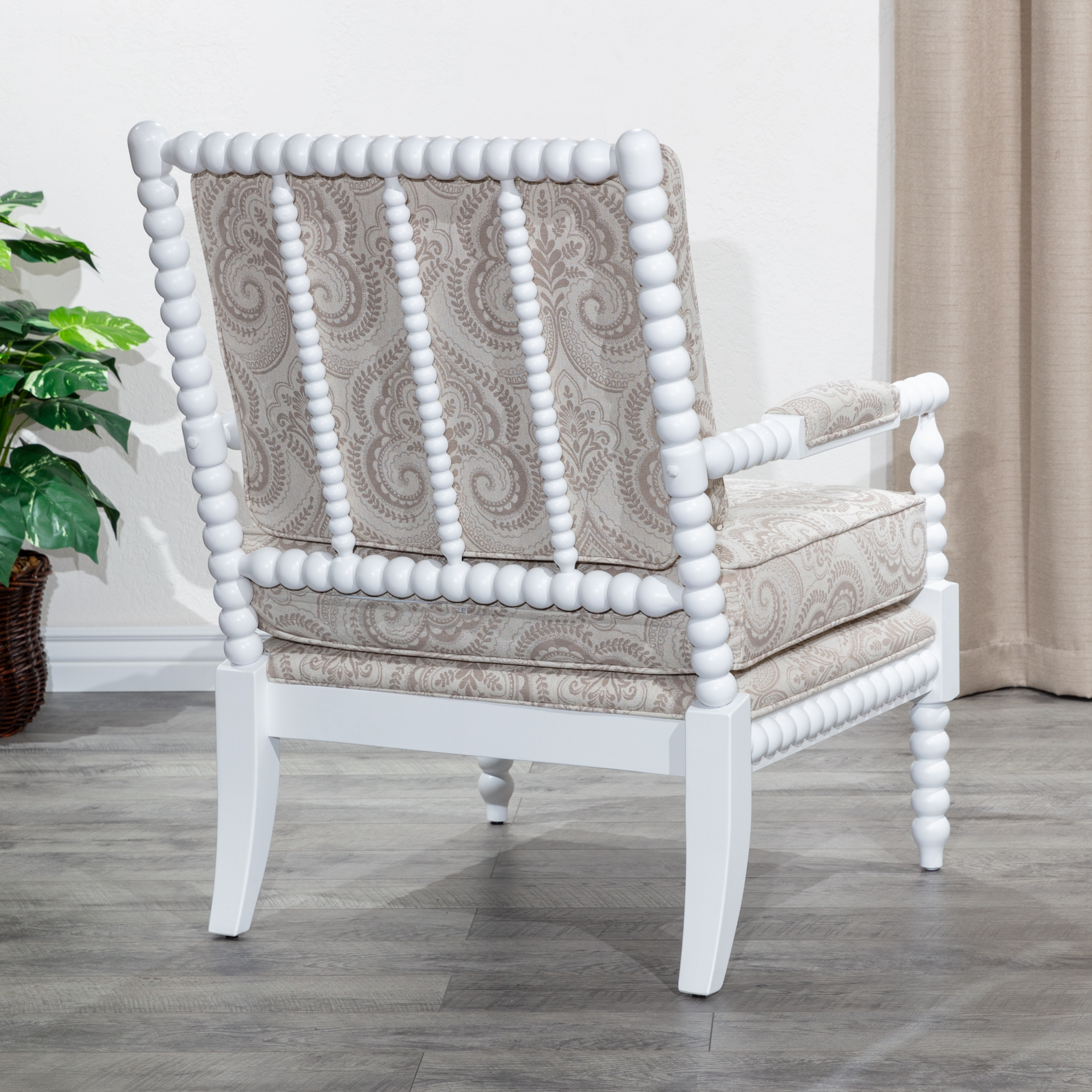 The chic and sophisticated Silverthorne Spindle Chair combines modern style and classic lines. This expertly crafted chair features a durable hardwood frame, padded armrest, fine wood finish, and a beautiful piping detail. The elegantly turned spindle elements and thick plush cushions create a graceful addition to any room.