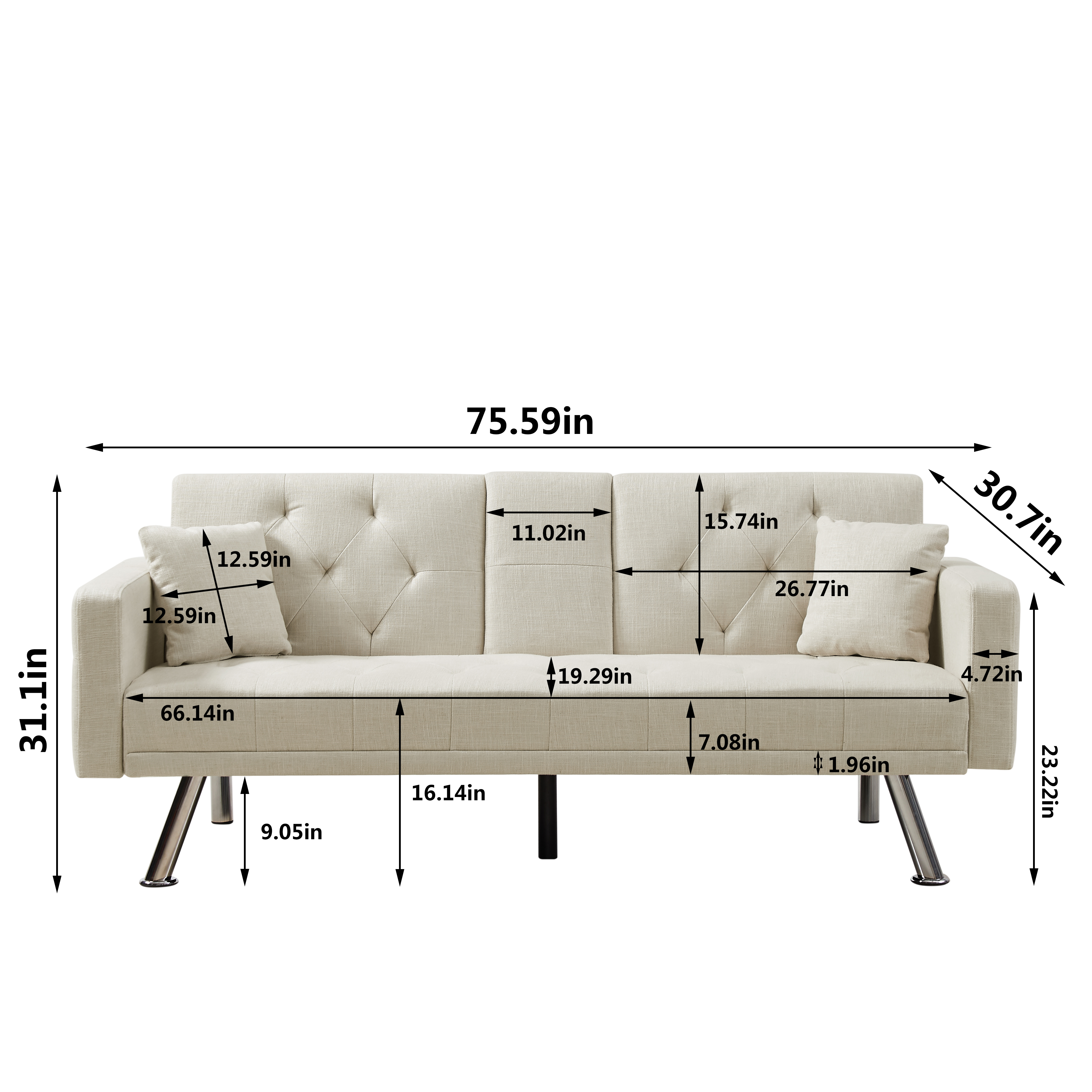 Square arm armrests, beige linen convertible sofa and daybed