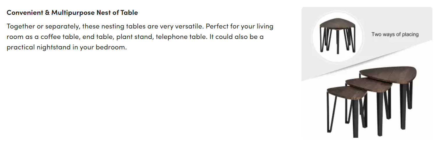 Convenient and multipurpose: Keep your glass of wine close by while reading a book, or need a table lamp at your bedside during the night? Simply one set can provide everything you need within reach with the 3 practical tables.