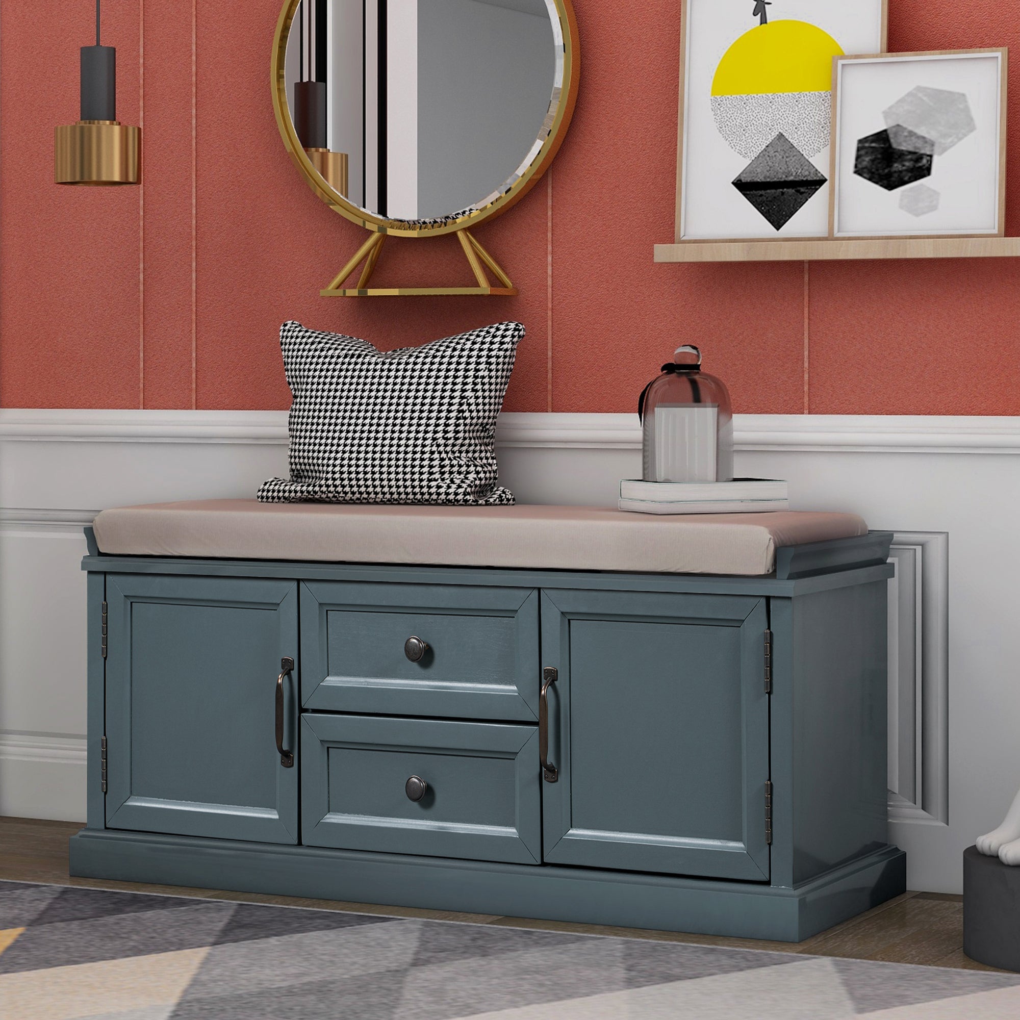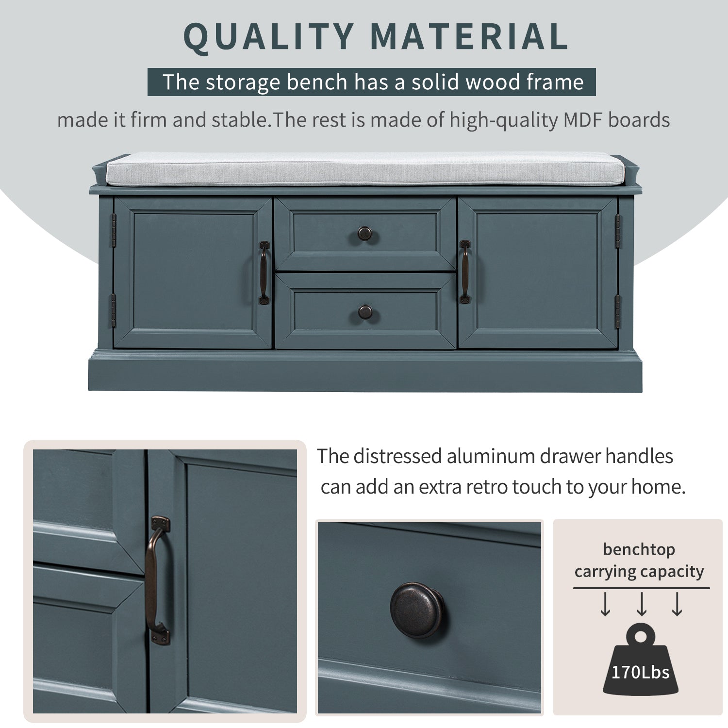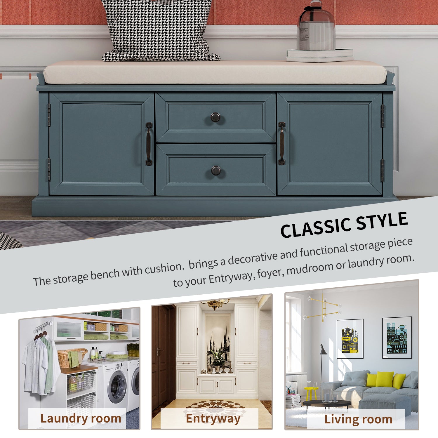 Classic Style: The storage bench with cushion brings a decorative and functional storage piece to your Entryway, foyer, mudroom or laundry room. The distressed aluminum drawer handles can add an extra retro touch to your home.