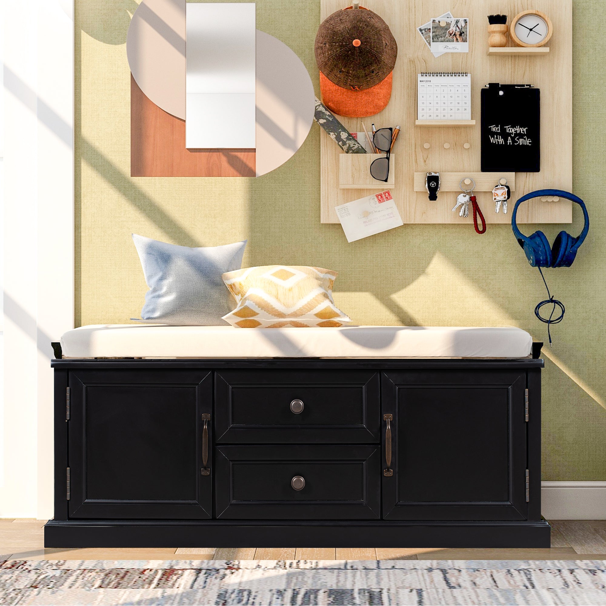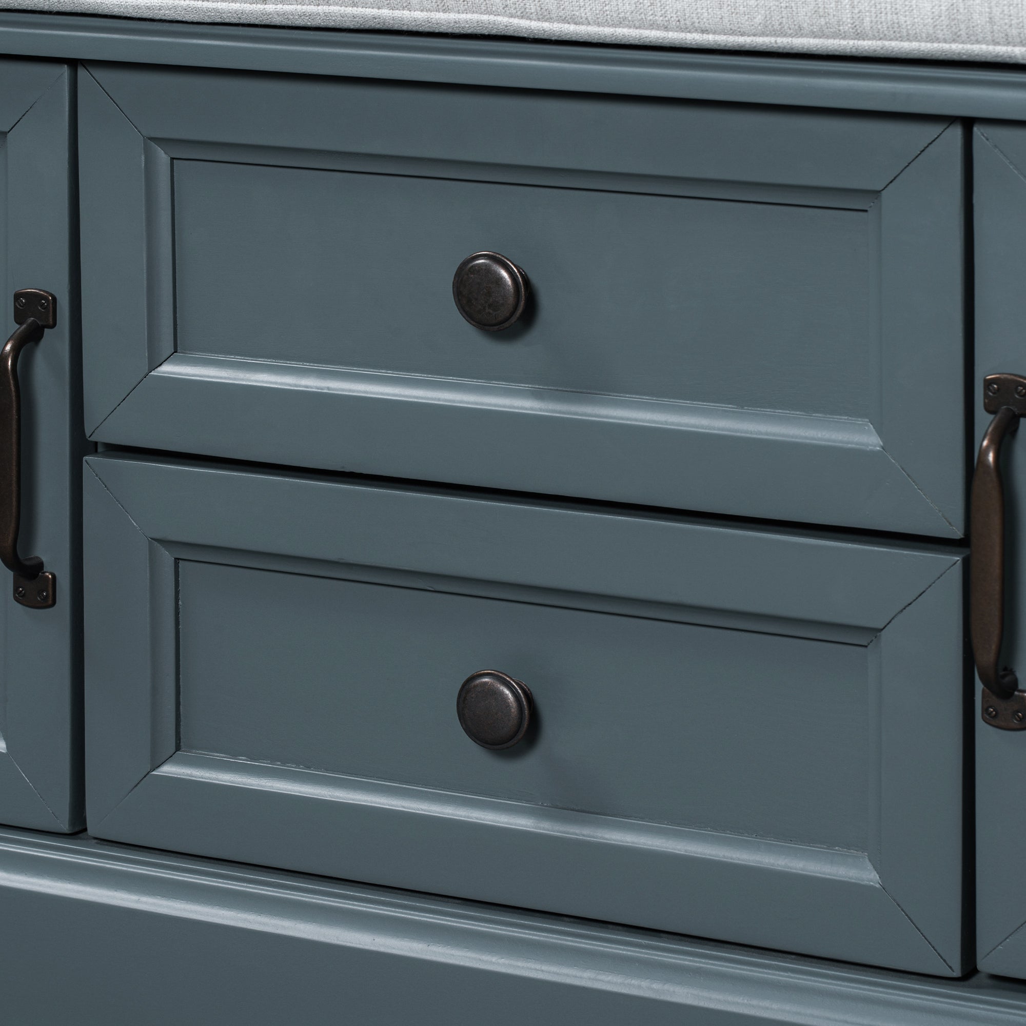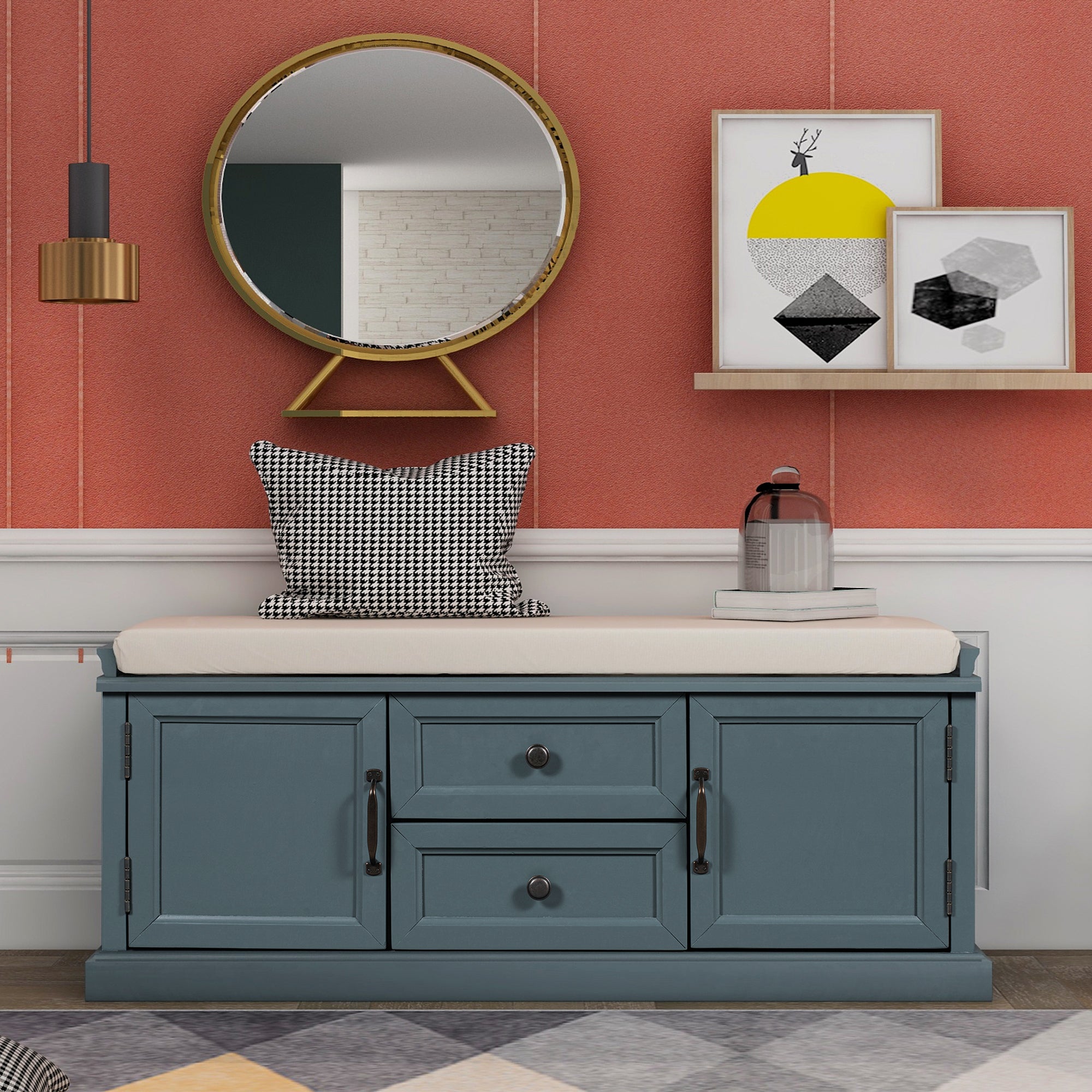 Classic Style: The storage bench with cushion brings a decorative and functional storage piece to your Entryway, foyer, mudroom or laundry room. The distressed aluminum drawer handles can add an extra retro touch to your home.