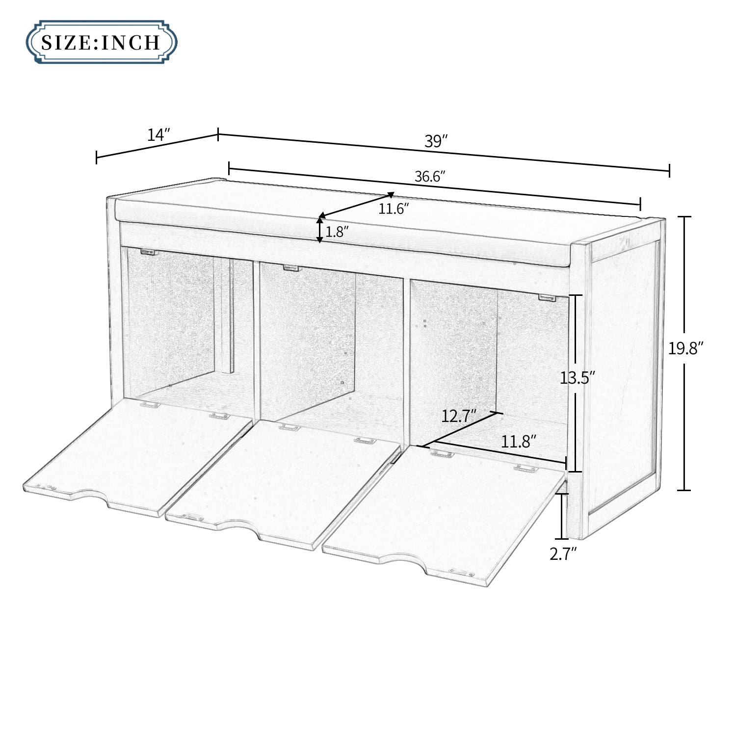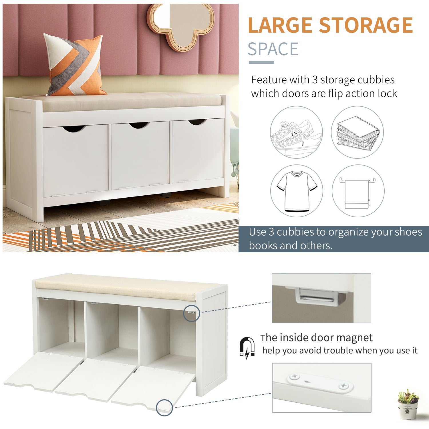 LARGE STORAGE SPACE: Feature with 3 storage cubbies which doors are flip action lock. Both the top arc-shaped vacancy and the inside door magnet help you avoid trouble when you use it. Use 3 cubbies to organize your shoes, books and others. Cubby Dimensions: 11.8"L x 12.7"W x 13.5"H.