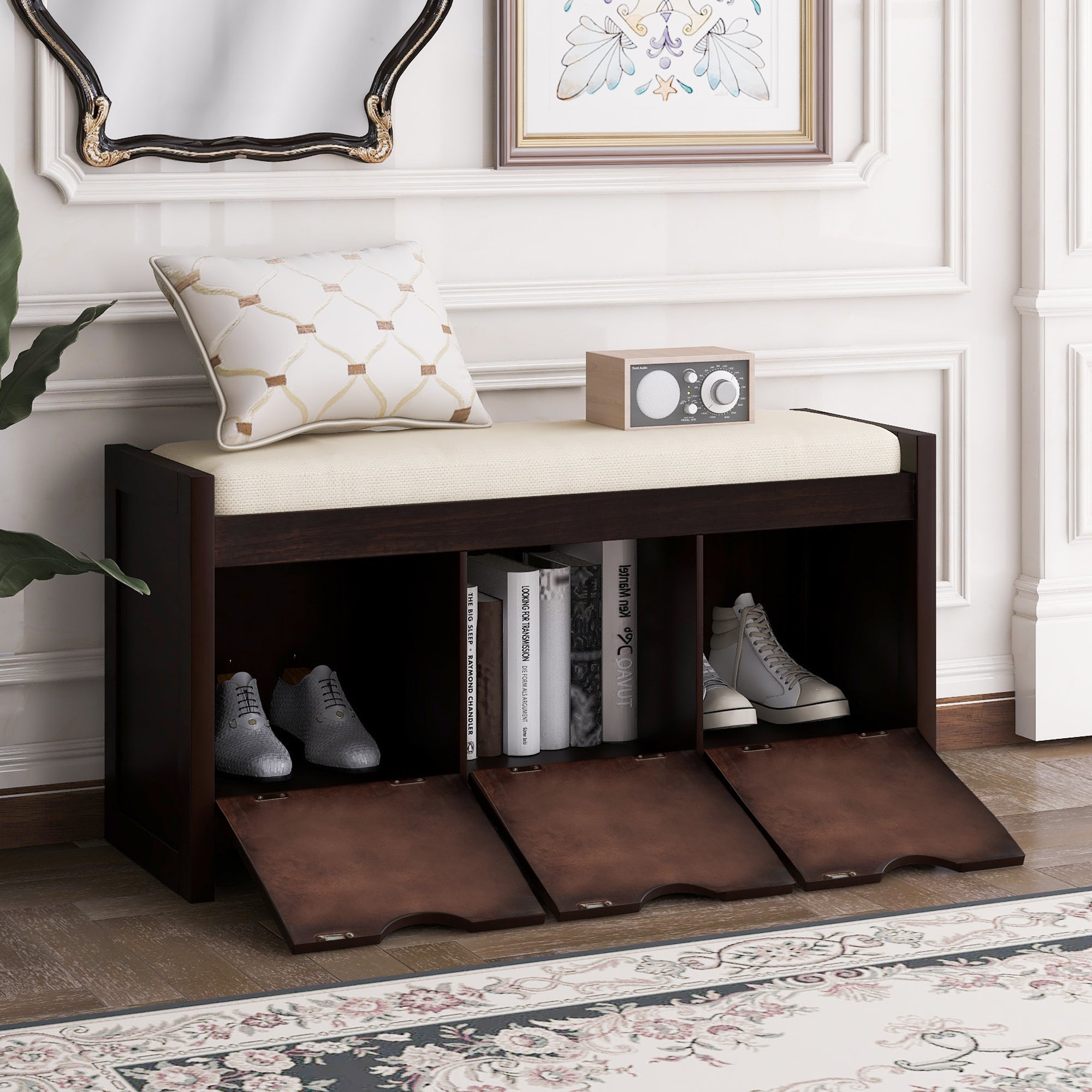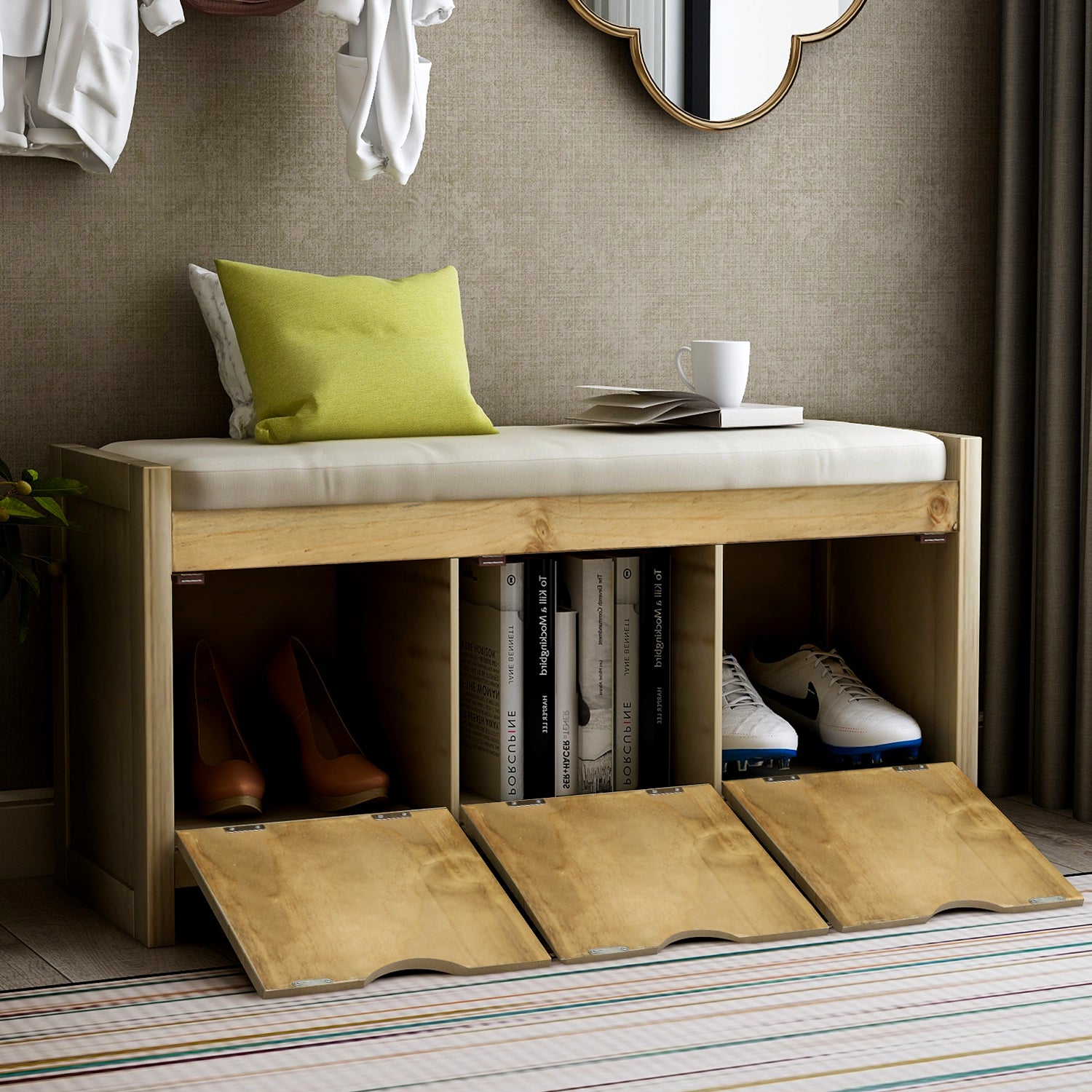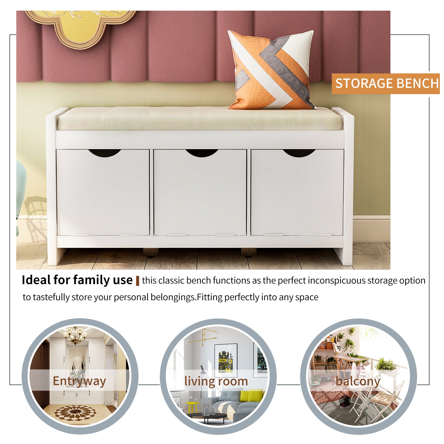 VERSATILE STORAGE BENCH: Ideal for family use, this classic bench functions as the perfect inconspicuous storage option to tastefully store your personal belongings. Combine the neutral finish and 3 roomy storage cubbies, this storage bench give your home an inviting look. Fitting perfectly into any space like entryway, living room and balcony.