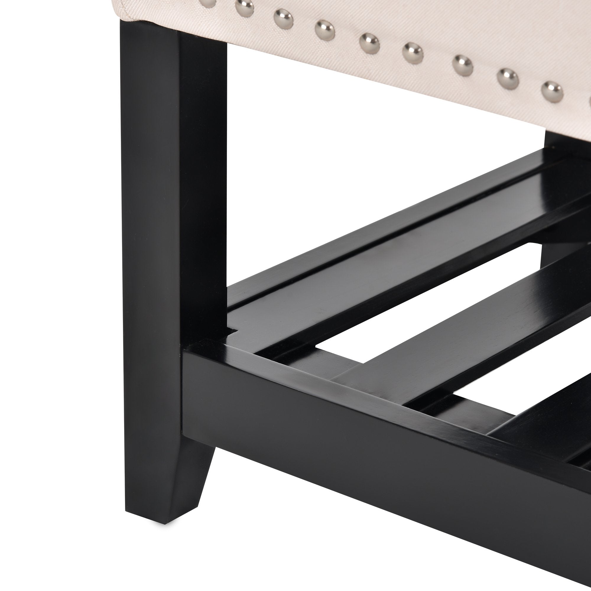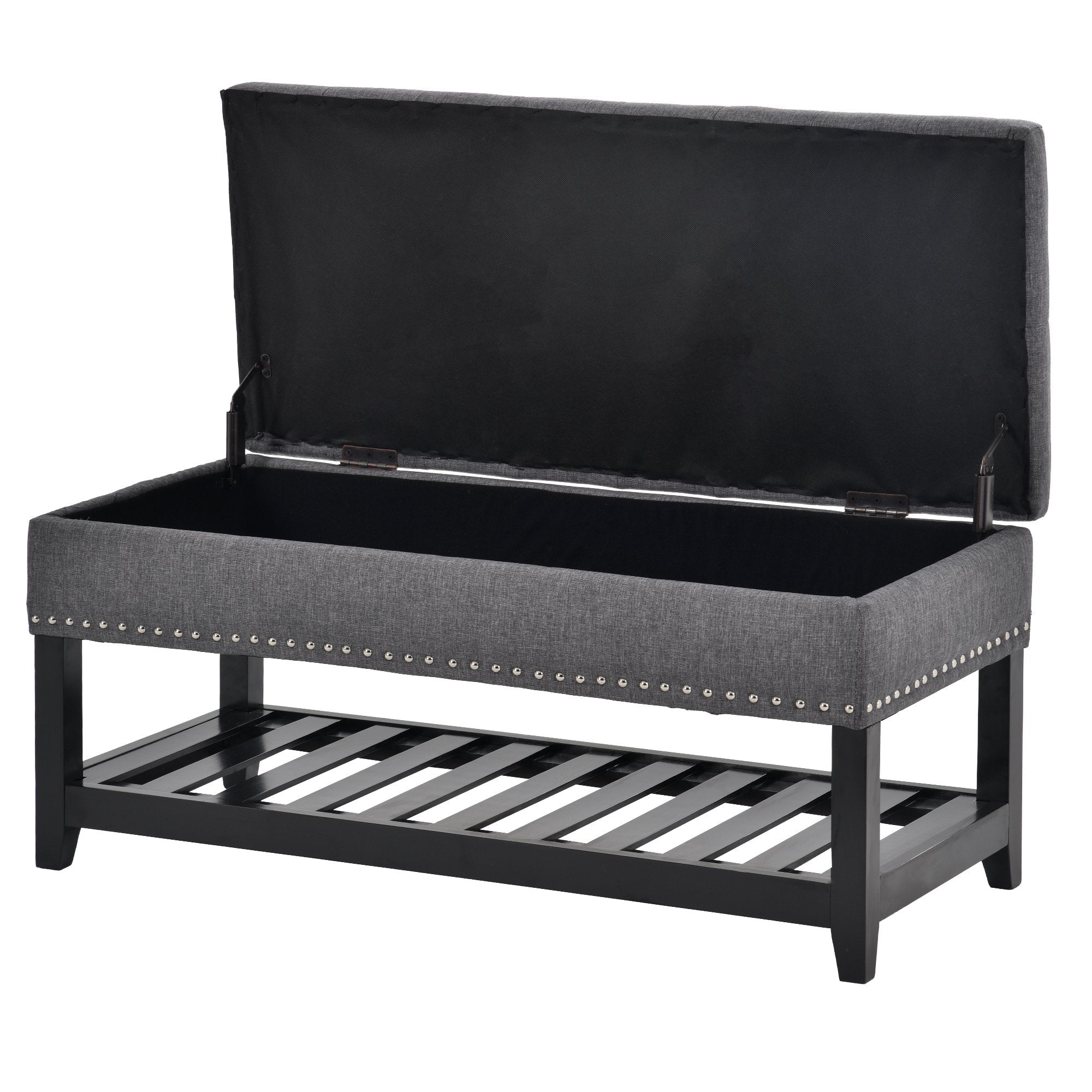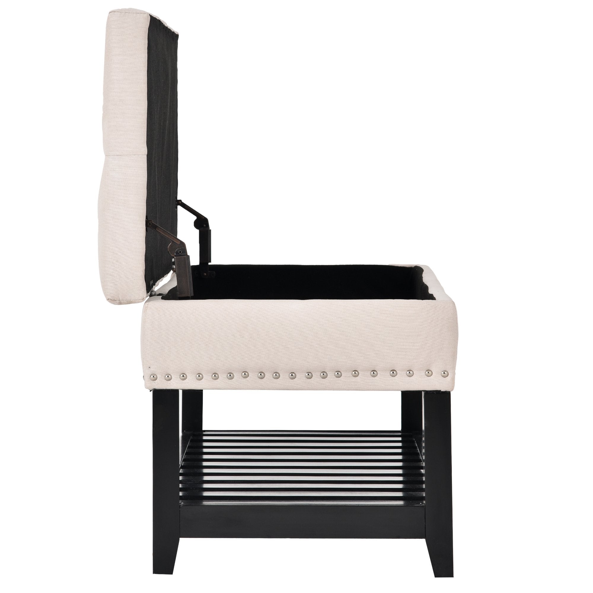 Traditional and modern art put together, to give your home a new look. This bench is made from Eucalyptus wood with rivets around and provides seating. Upholstery by polyester fabric and thick foam provides you utmost seating comfort. The inside storage space and and the shelf provide enough storage to bring convenience storage solution to the space that needs it most.
