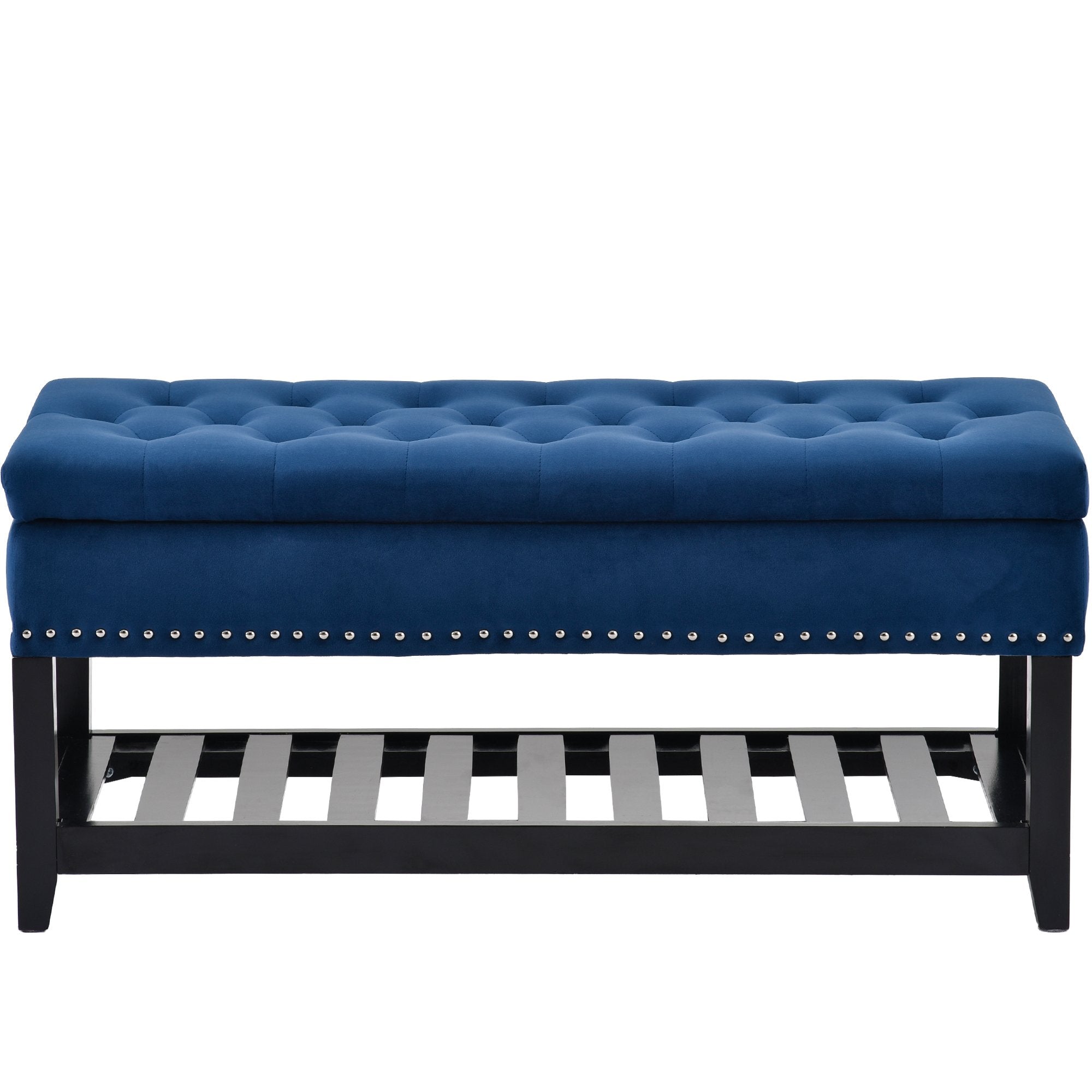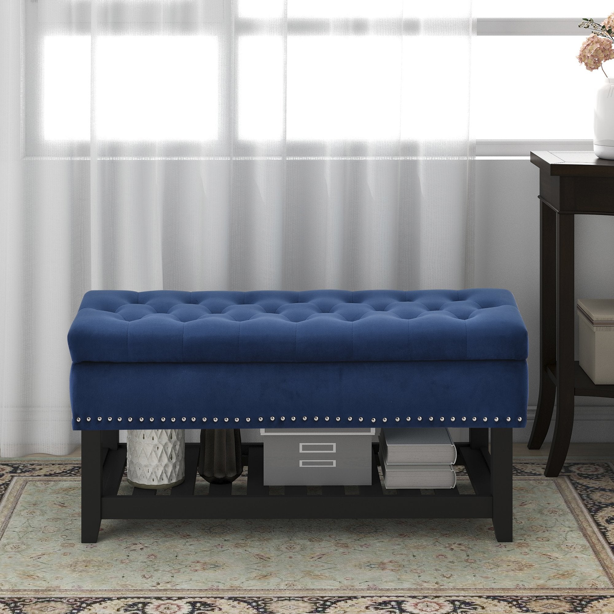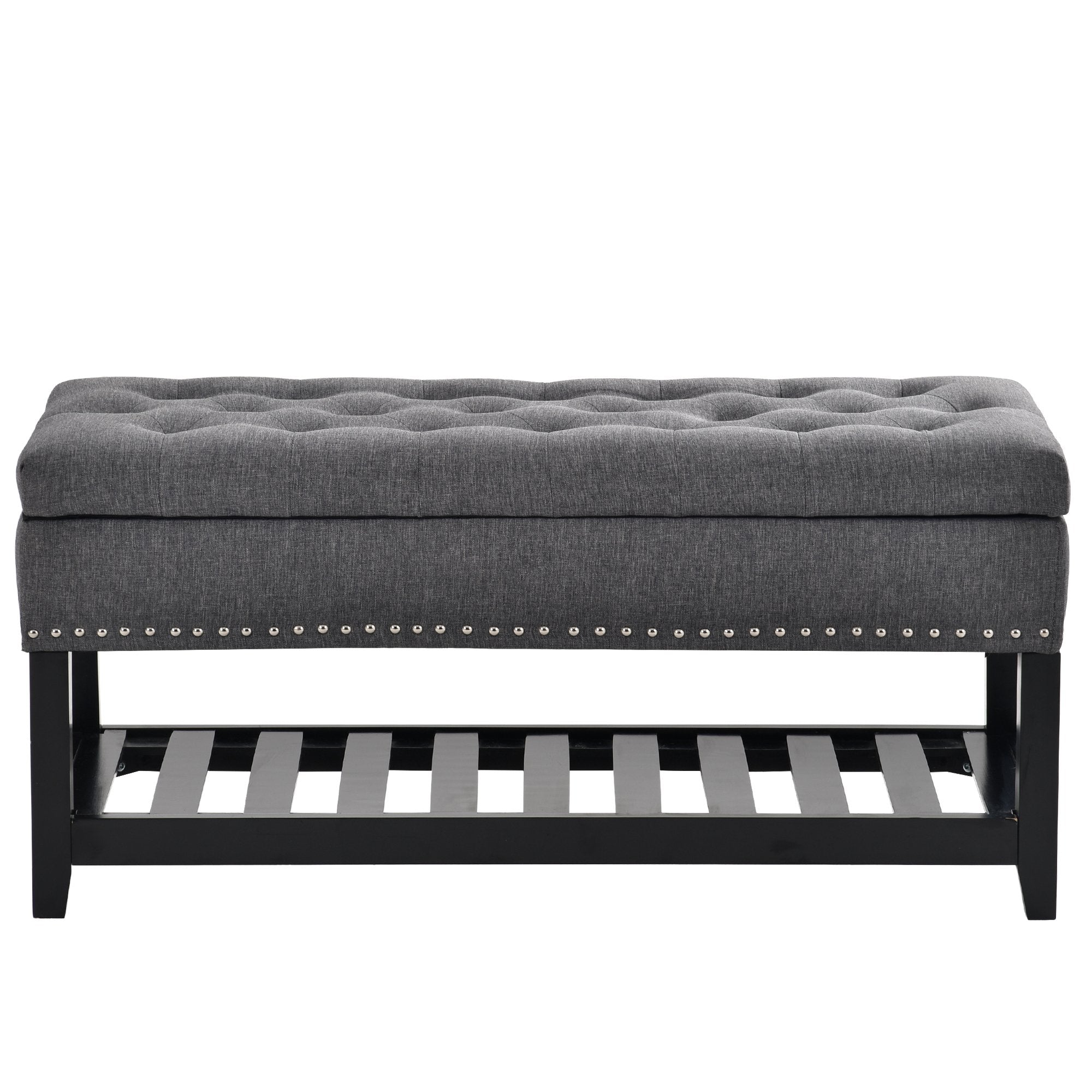 Traditional and modern art put together, to give your home a new look. This bench is made from Eucalyptus wood with rivets around and provides seating. Upholstery by polyester fabric and thick foam provides you utmost seating comfort. The inside storage space and and the shelf provide enough storage to bring convenience storage solution to the space that needs it most.