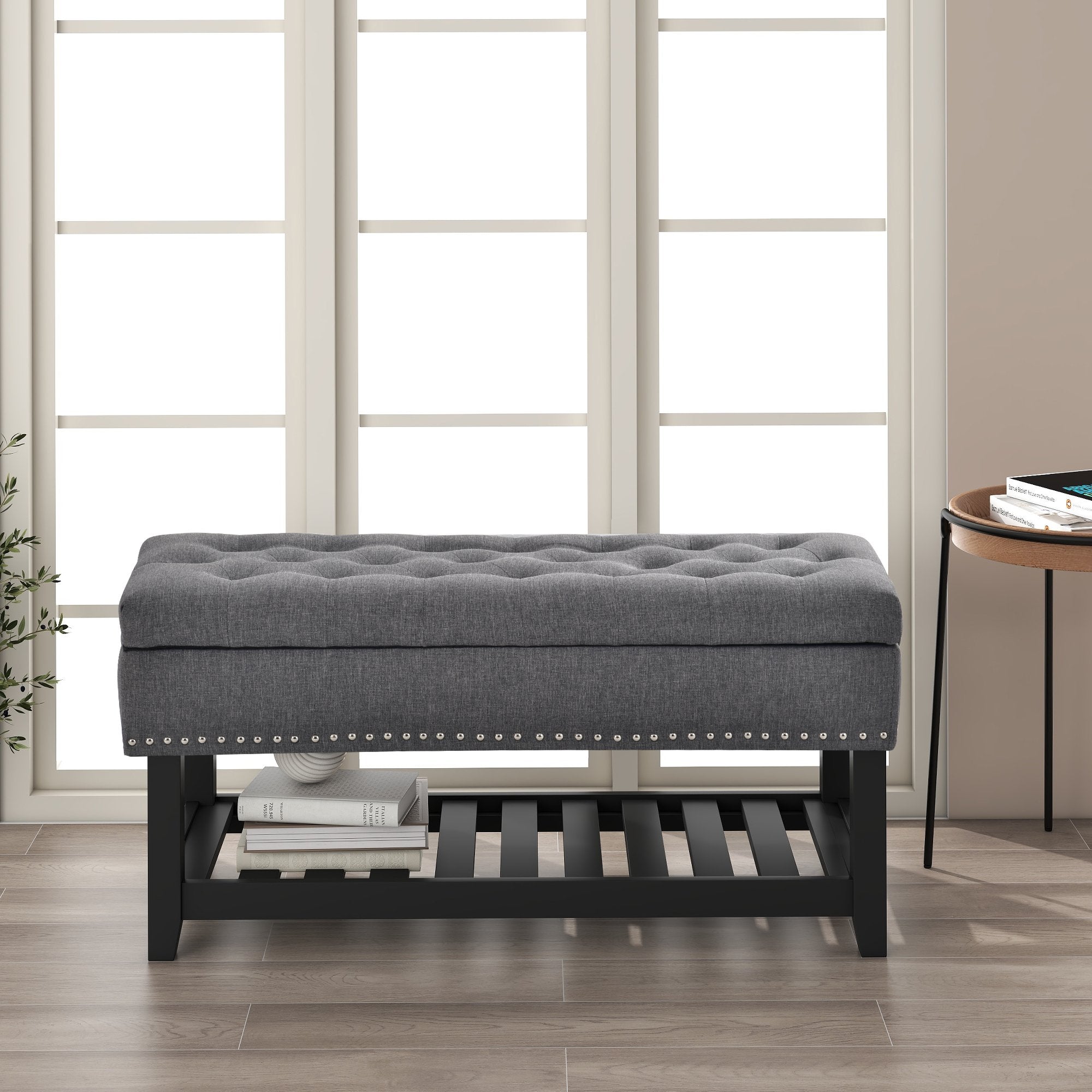 The button tufted upholstery fabric adds a layer of texture and visual interest to this bench.