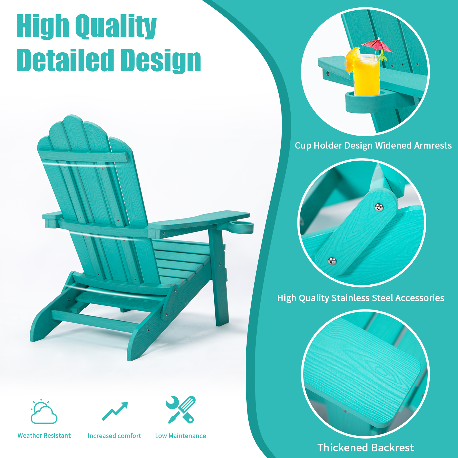 Durable and Strong - Made of Plastic Wood( polyethylene) for exceptional durability, with the realistic wood-like look. Adirondack chairs are weather proof and will not fade. It can withstand a variety of climate including hot sun, snow and strong wind and rain, and will not dent, crack, peel or rot like a wooden chair. It can be used outdoors for a long time.