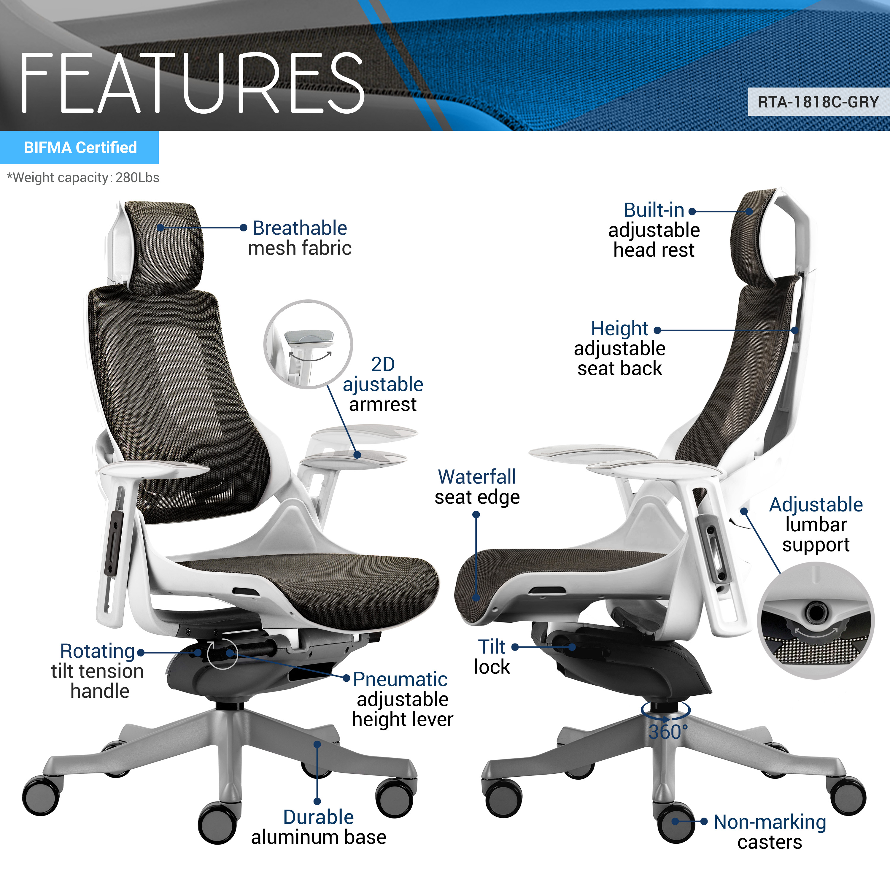 LONG DESCRIPTION : Techni Mobili has re-engineered how we sit today, introducing new materials in our new line of seating products. The new LUX chair features a breathable mesh material that allows air to circulate while you are sitting in comfort. Mesh office chairs allow you to be more productive throughout their workday with its comfort and ventilated design. This executive chair with adjustable height, headrest, tilting recline mechanism with tilt lock function plus 2D armrest will provide you with comfort and functionality. Built-in lumbar adjustable support and adjustable back height prevent back strain and muscle fatigue. Adjust the seat height using the pneumatic mechanism, conveniently located below the seat. The heavy-duty aluminum base with dual wheel casters makes it easy to roll across the floor. It comes semi-assembled out of the box. Whether you're studying, browsing online or working on a tight deadline, this ergonomic and stylish chair will keep you cool and comfortable throughout your busy day. It weighs upto 280lbs
