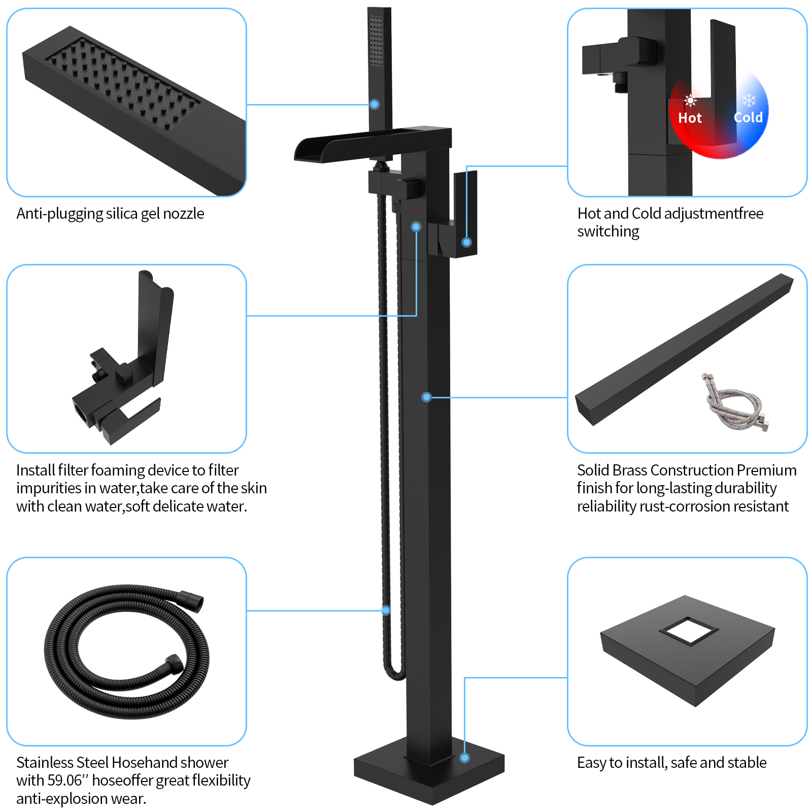 【Quality Assurance】The freestanding bathtub faucet is made of high-quality stainless steel and brass. The material is corrosion-resistant and easy to clean, providing protection for your health.