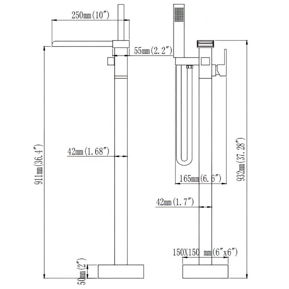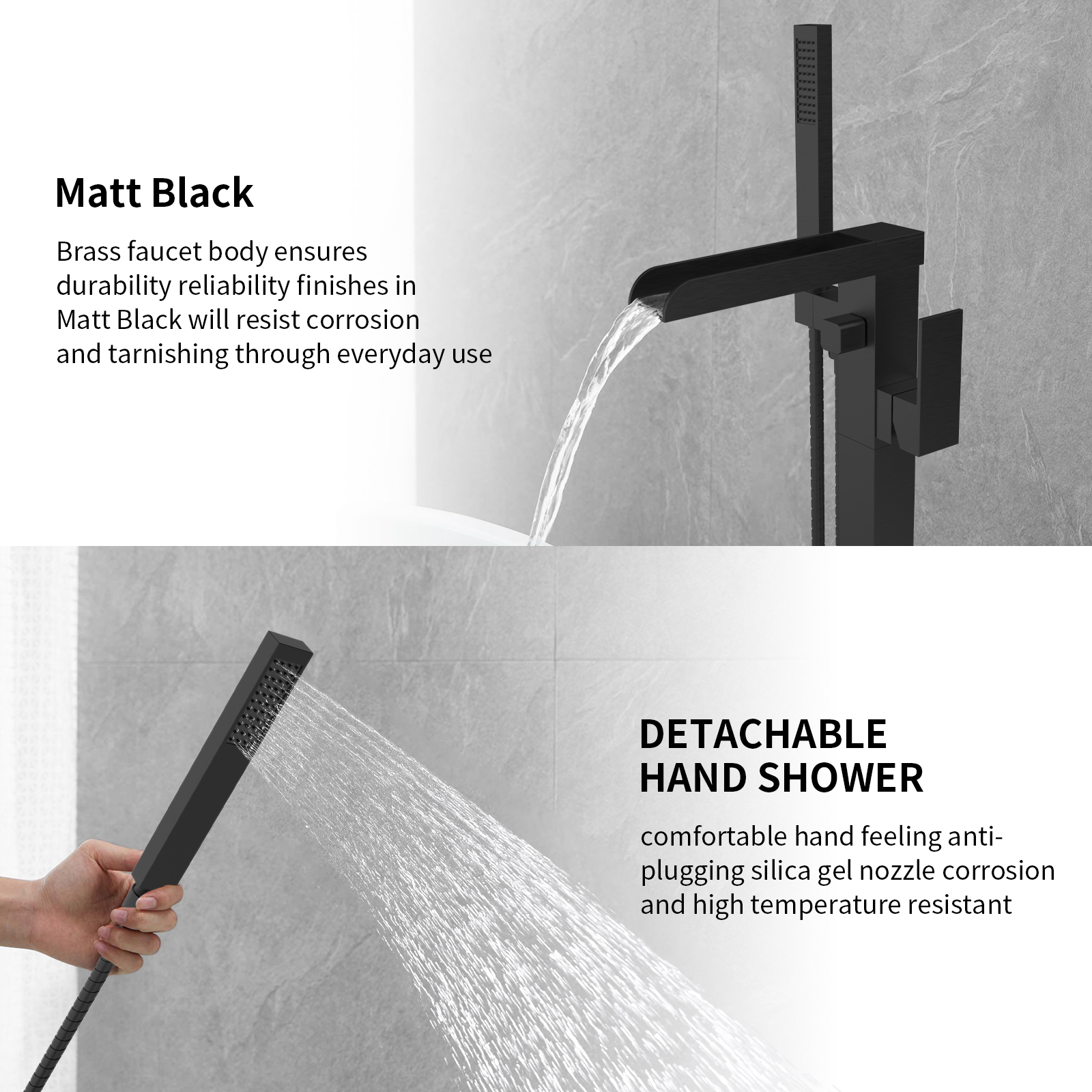 【Separate Hand Shower】Freestanding tub fillers feature a separate hand shower with a pivoting arm,allowing it to lean over the tub after use. When in use, it can rotate 360 degrees, and can be adjusted according to the angle you need. Not only that, but also perfect for rinsing off, washing loved ones and pets or keeping your tub clean.