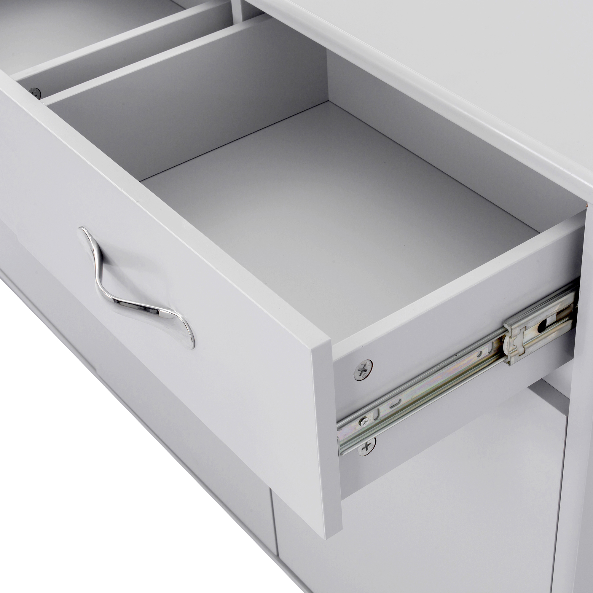 Material: E1 degree MDF board, the thickness of majority plates are 12 mm. Metal drawer slide, steel tube legs.