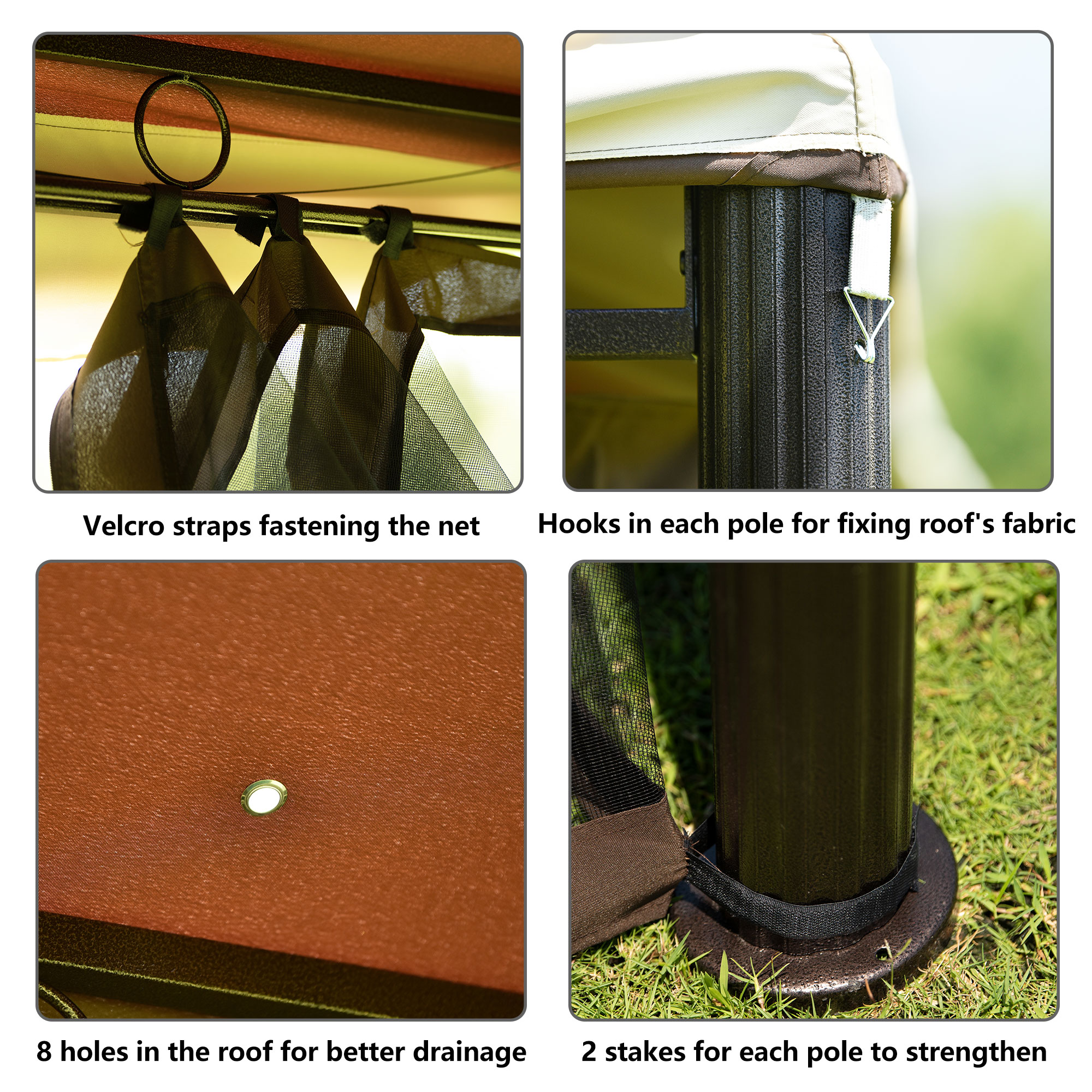 Our gazebo roofs are covered with 180g/㎡ polyester coated with PU painting for water resistance. Designed with 2-tier roofs, it improves the air circulation while keeping stable in windy days. 8 built-in holes in the canopy offers better drainage to avoid water accumulation in the raining. To fix the roof, there is a hook in each corner for strengthing.