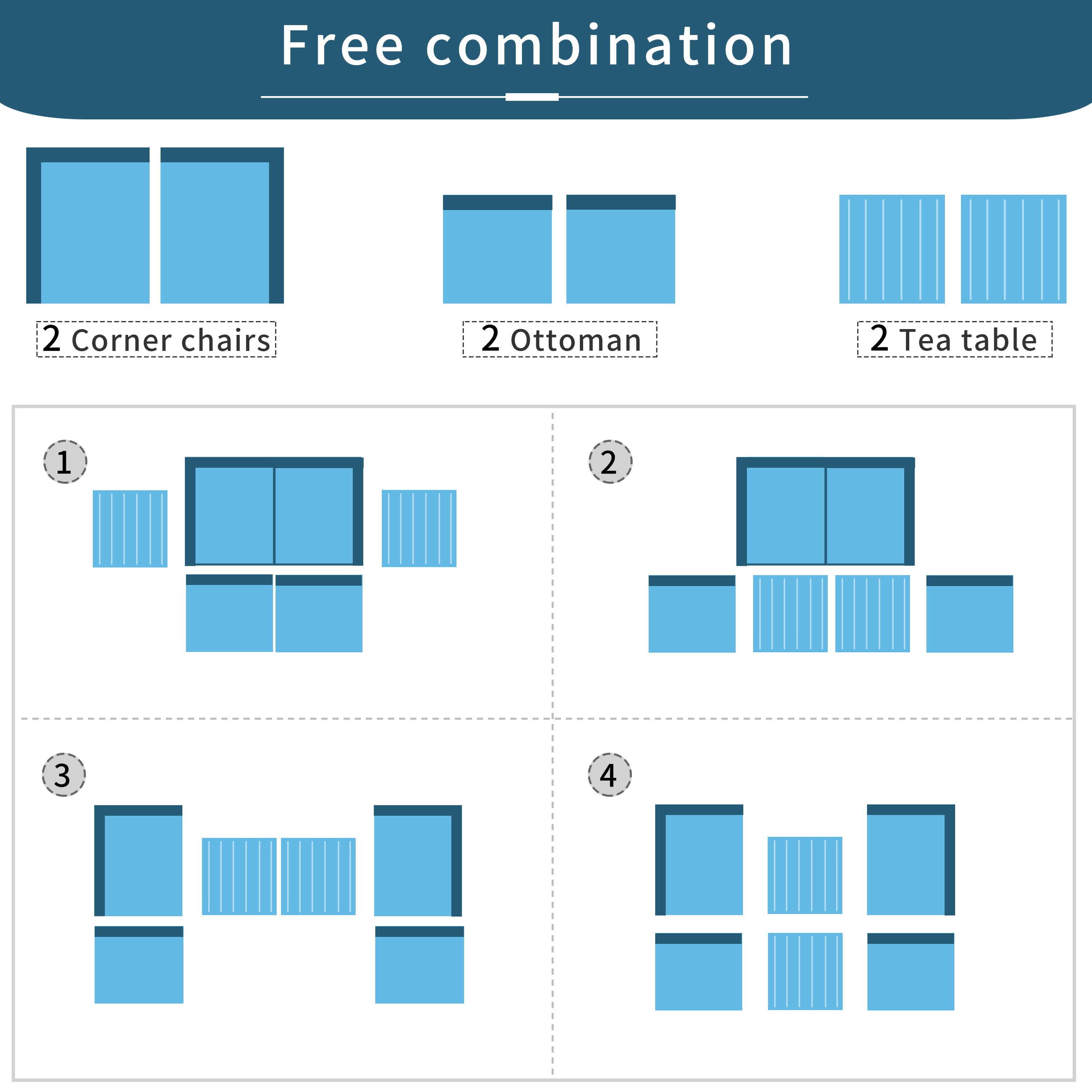 Pieces Included | 2 corner sofas, 2 ottomans, 2 coffee table and 4 cushions+2pillows(color pillows not included)