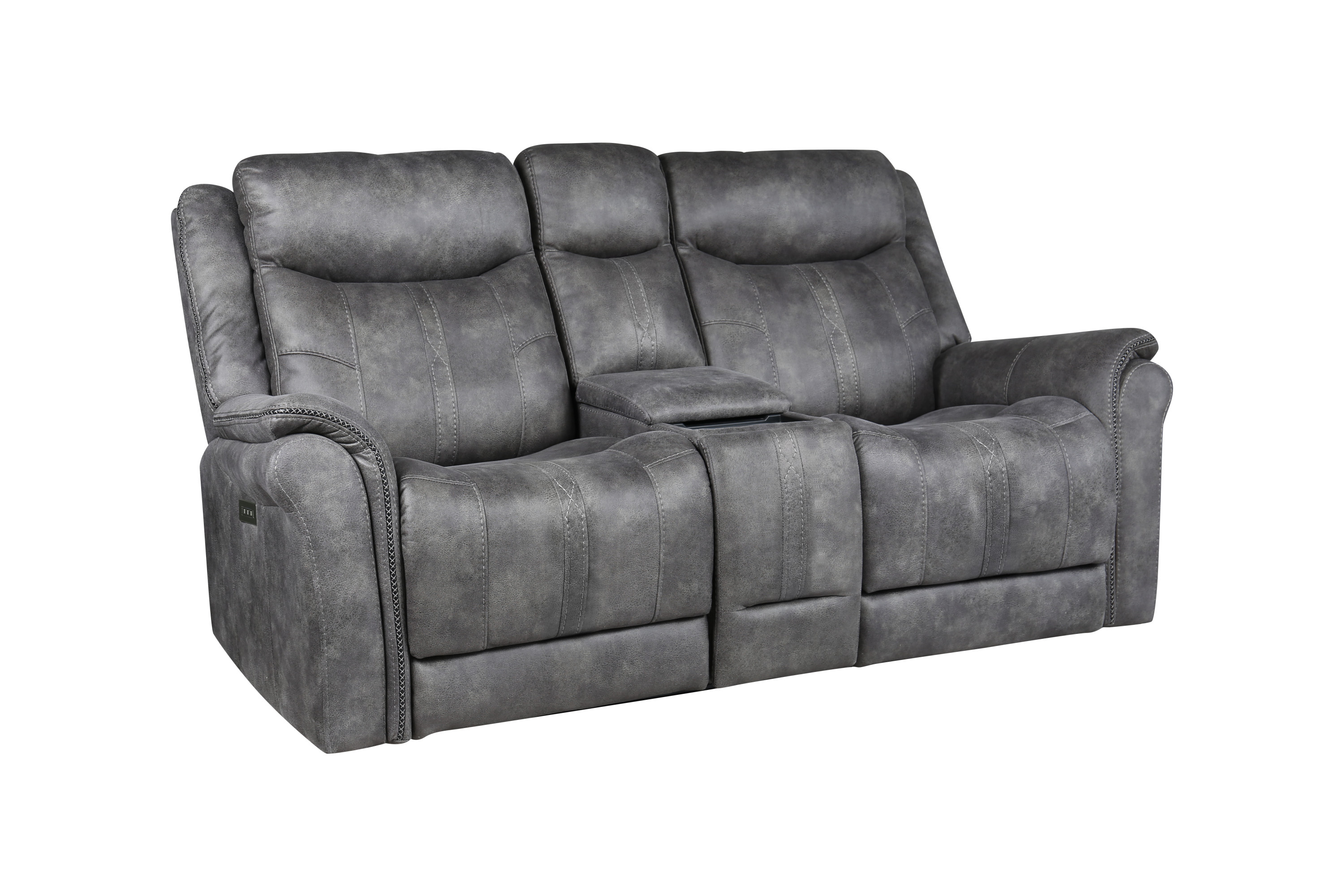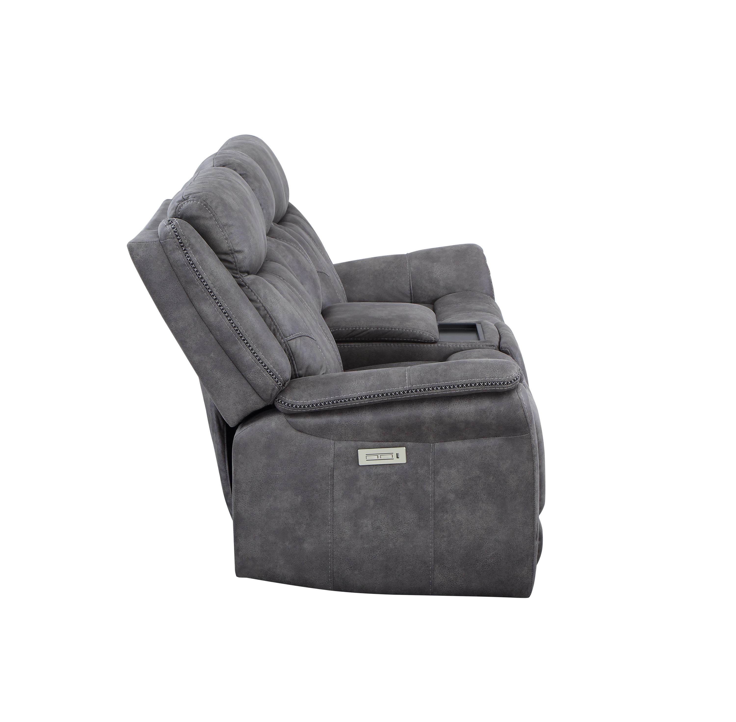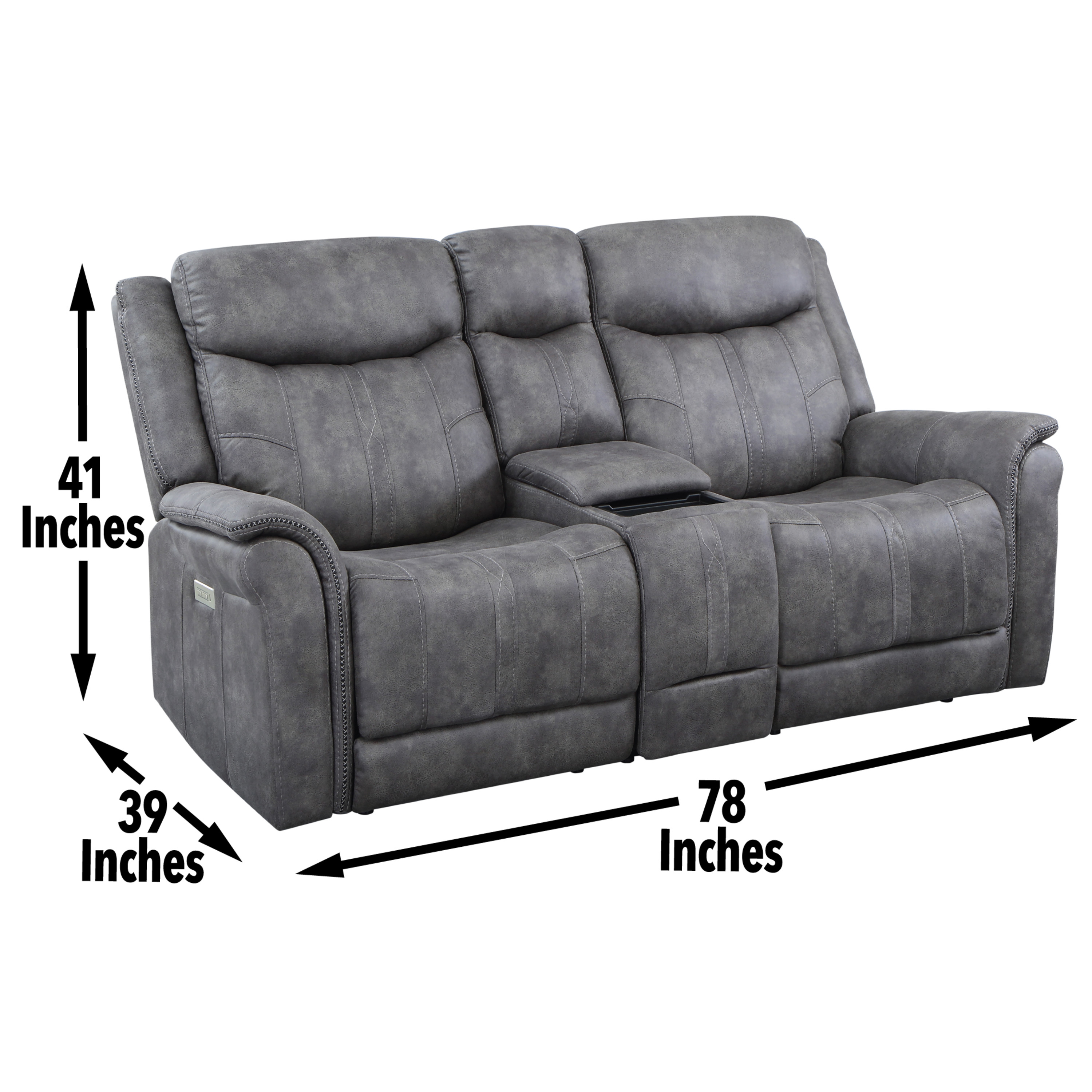 DimensionsCarton Dimensions L 88.5 x W 31.1 x H 26 Features-Styling details include overstuffed arms, contrasting baseball stitching and tapered arm treatment-Power headrest to place head in optimal spot while reclined-Power footrest-USB recharging port-Concealed cupholders pop-out when needed Product DescriptionExperience the perfect blend of traditional and modern elements with the Morrison Pwr/Pwr Console Loveseat. This exceptional piece showcases a transitional design that seamlessly combines timeless elegance with contemporary comfort. Its cool gray faux-suede cover serves as a neutral backdrop, effortlessly complementing most color schemes and adding a touch of sophistication to your living space.Prepare to indulge in ultimate comfort with the butter-soft touch of the Morrison Loveseat. Its plush seating invites you to sink in and relax, while the power footrest and power headrest functionalities allow you to customize your seating position for optimal support and relaxation. Every moment spent on this loveseat is a testament to unrivaled comfort and durability.