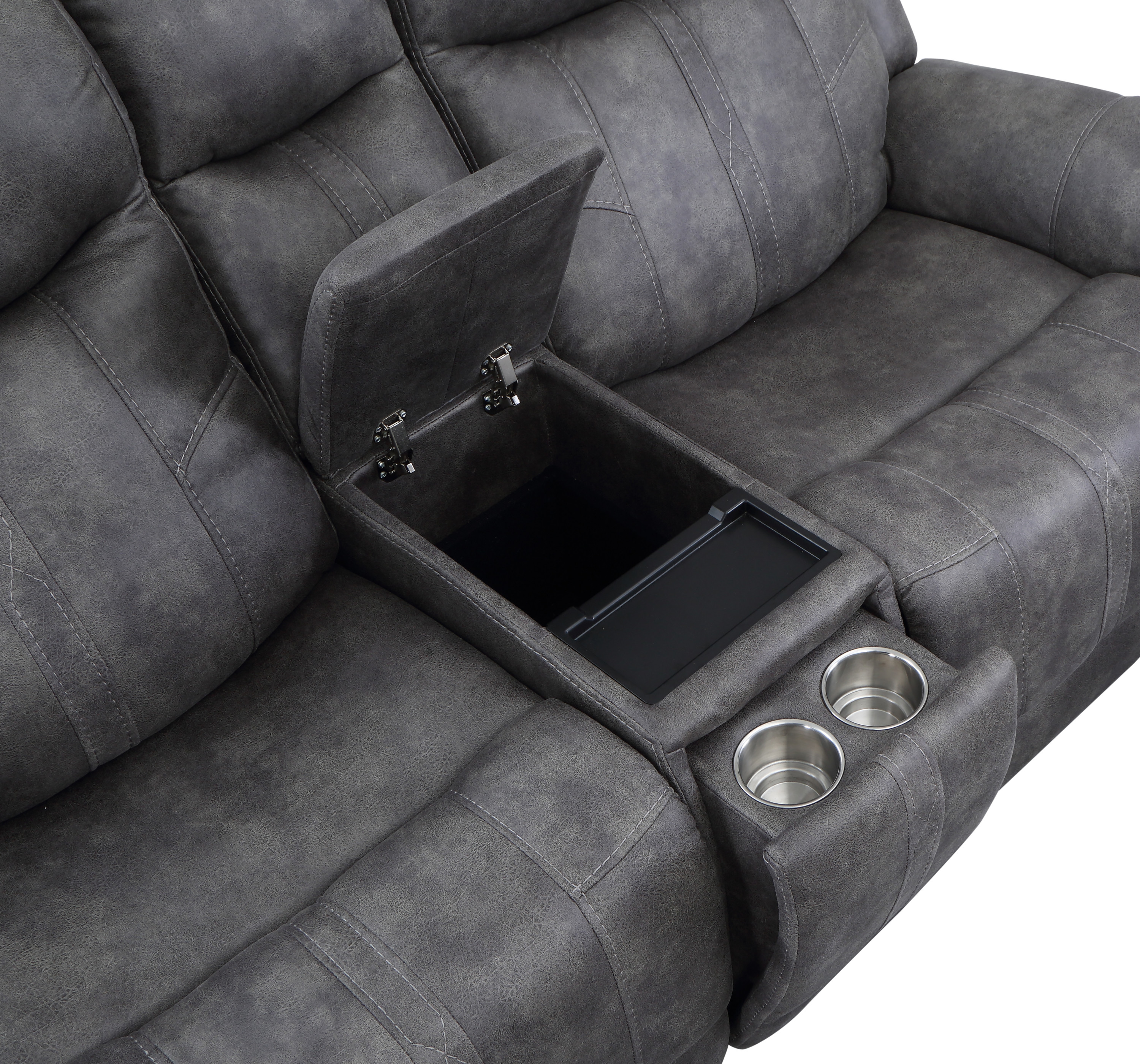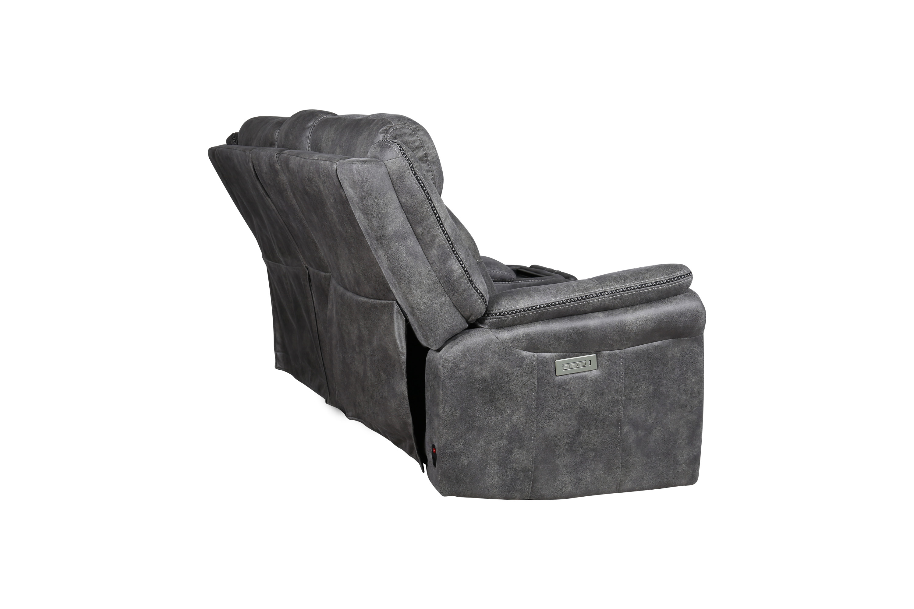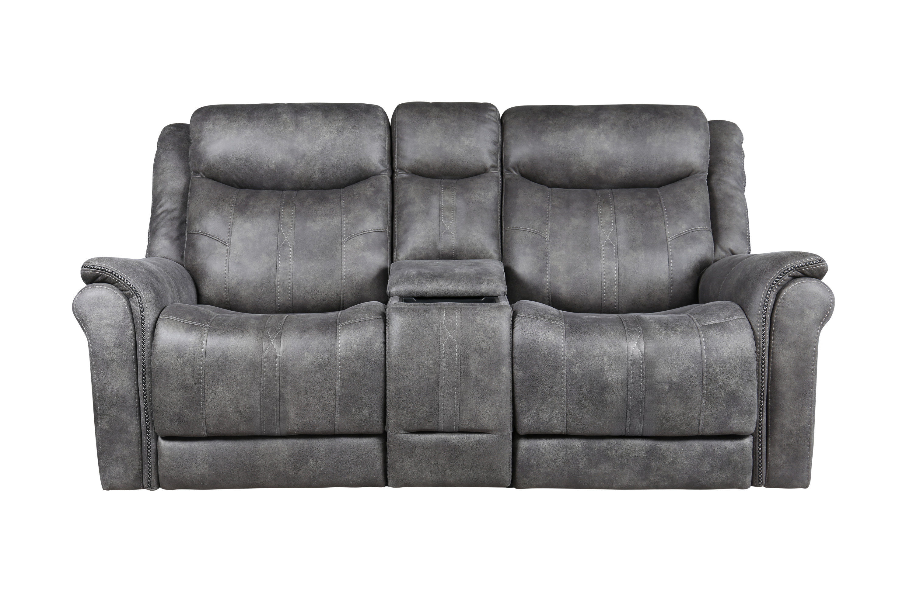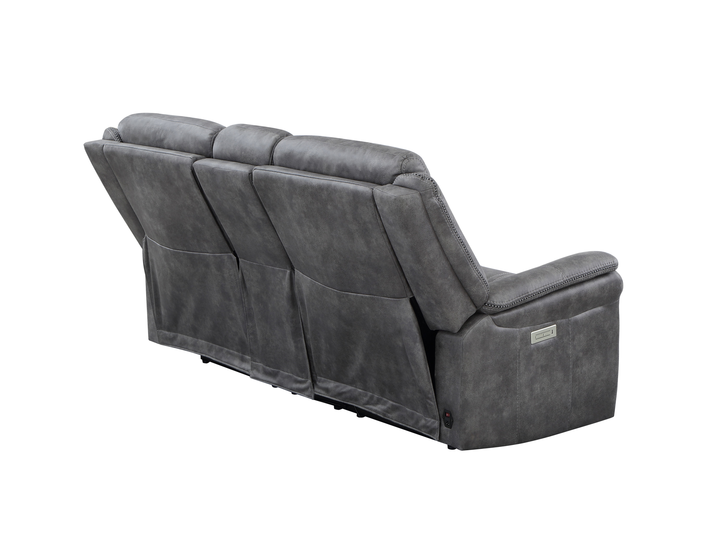 DimensionsCarton Dimensions L 88.5 x W 31.1 x H 26 Features-Styling details include overstuffed arms, contrasting baseball stitching and tapered arm treatment-Power headrest to place head in optimal spot while reclined-Power footrest-USB recharging port-Concealed cupholders pop-out when needed Product DescriptionExperience the perfect blend of traditional and modern elements with the Morrison Pwr/Pwr Console Loveseat. This exceptional piece showcases a transitional design that seamlessly combines timeless elegance with contemporary comfort. Its cool gray faux-suede cover serves as a neutral backdrop, effortlessly complementing most color schemes and adding a touch of sophistication to your living space.Prepare to indulge in ultimate comfort with the butter-soft touch of the Morrison Loveseat. Its plush seating invites you to sink in and relax, while the power footrest and power headrest functionalities allow you to customize your seating position for optimal support and relaxation. Every moment spent on this loveseat is a testament to unrivaled comfort and durability.