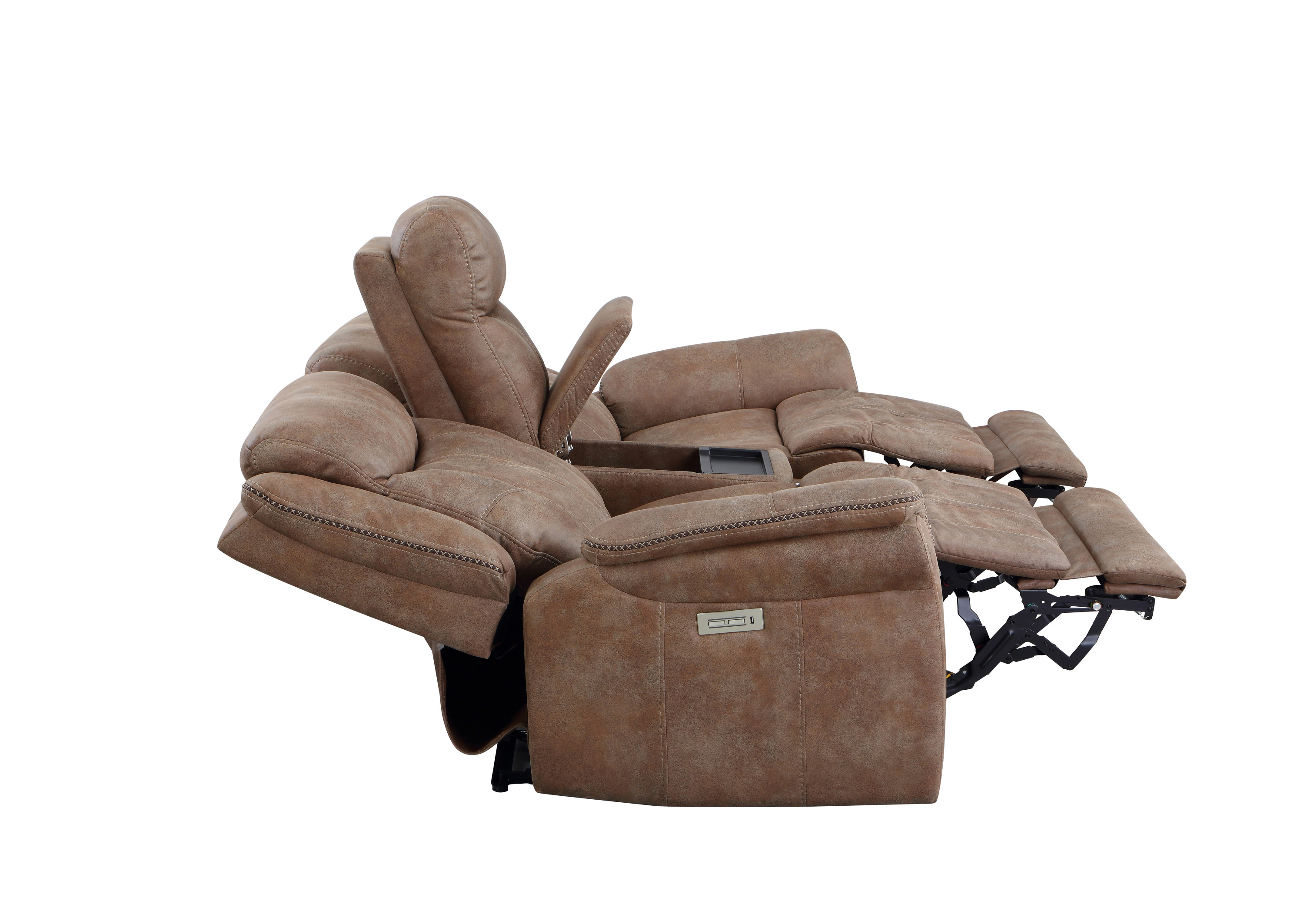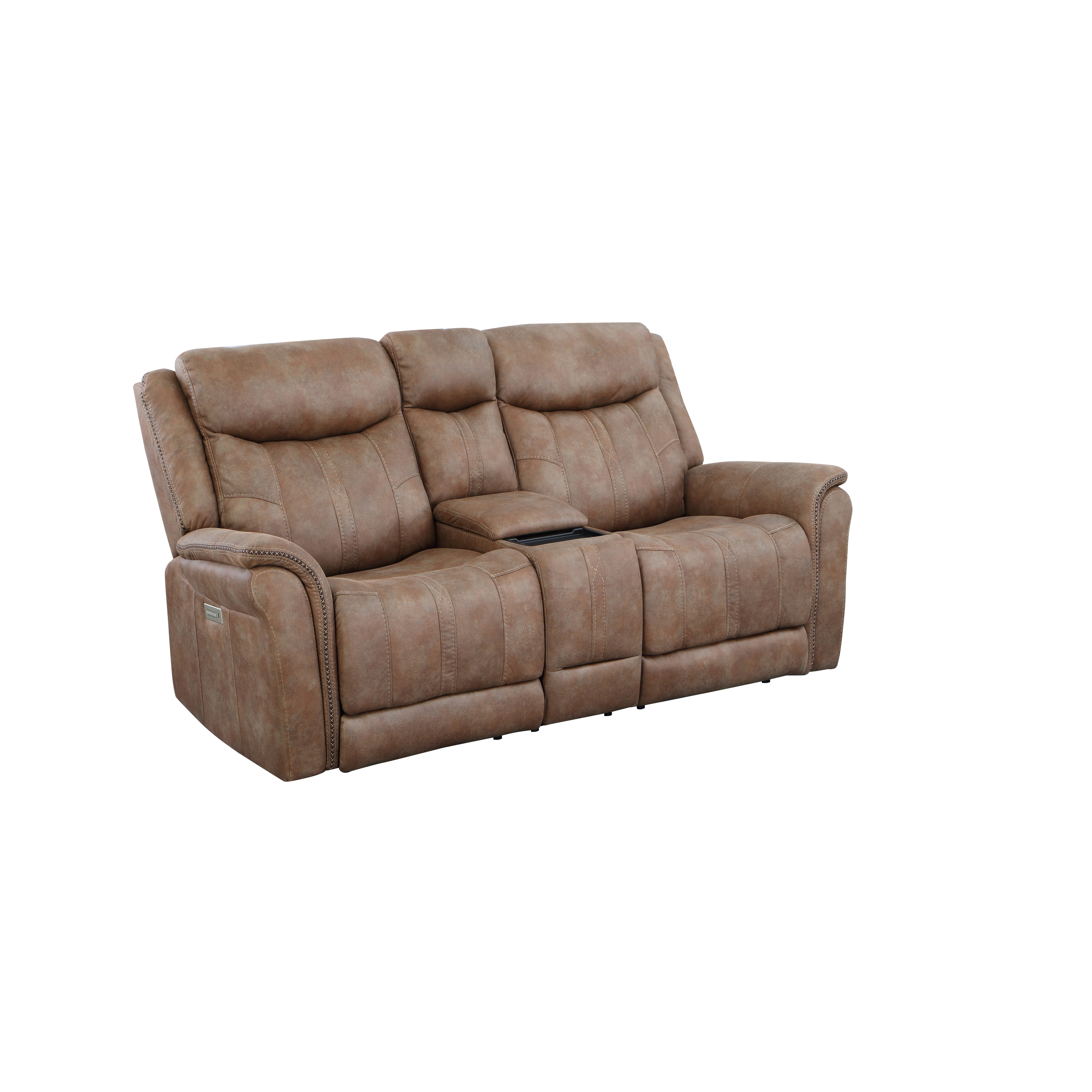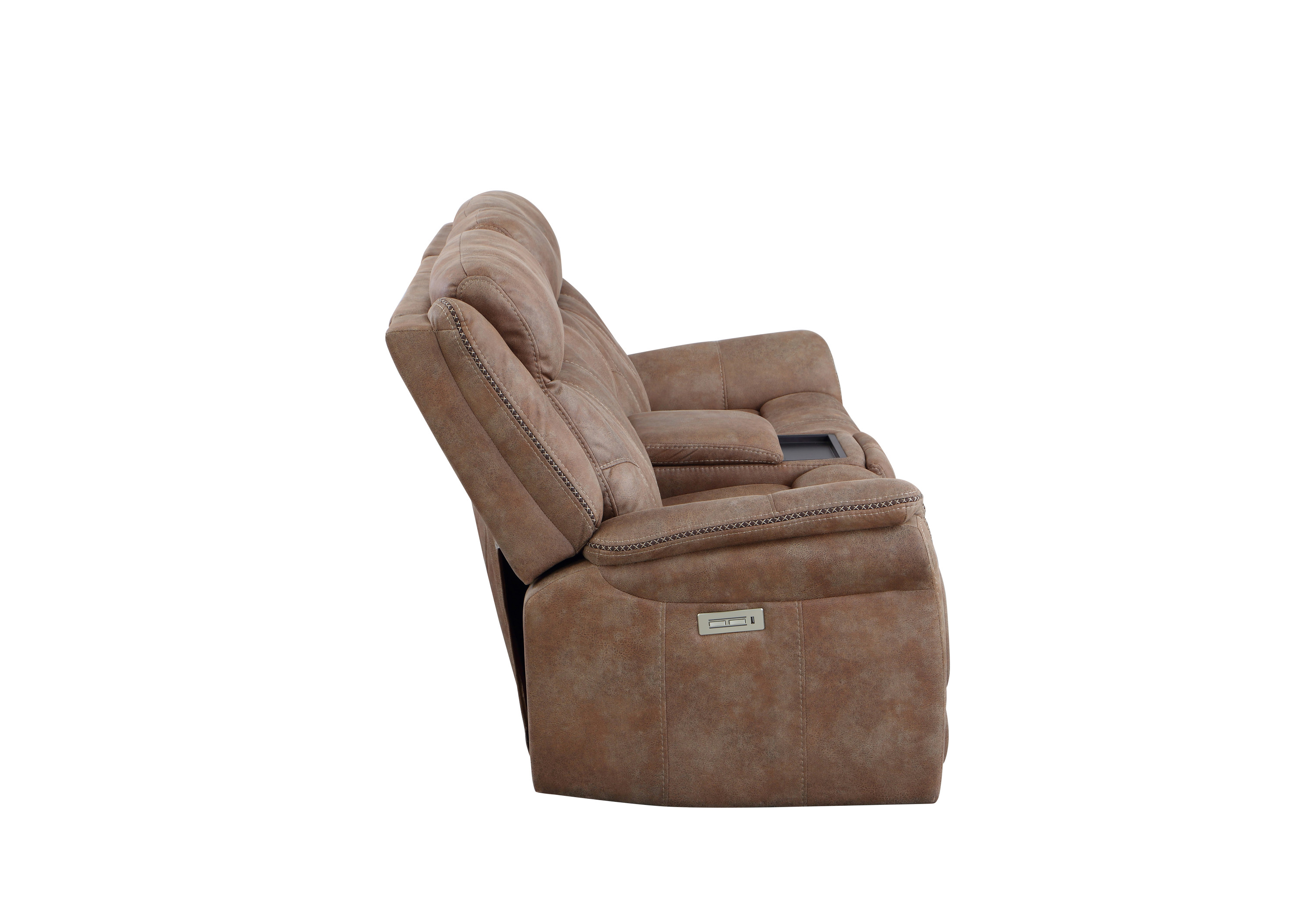 DimensionsCarton Dimensions L 88.5 x W 31.1 x H 26 Features-Styling details include overstuffed arms, contrasting baseball stitching and tapered arm treatment-Power headrest to place head in optimal spot while reclined-Power footrest-USB recharging port-Concealed cupholders pop-out when needed Product DescriptionEmbrace the perfect blend of traditional and modern elements with our console loveseat. Designed with a warm camel faux-suede cover that is butter-soft to the touch, this loveseat exudes both comfort and style. The power footrest and power headrest features ensure a comfortable seating experience for extended periods. Concealed cupholders pop out with a quick touch, allowing you to enjoy your favorite beverages without any hassle. The built-in console provides a convenient storage solution for remotes and other essentials. Elevate your living space with this durable and stylish console loveseat that is built to last.