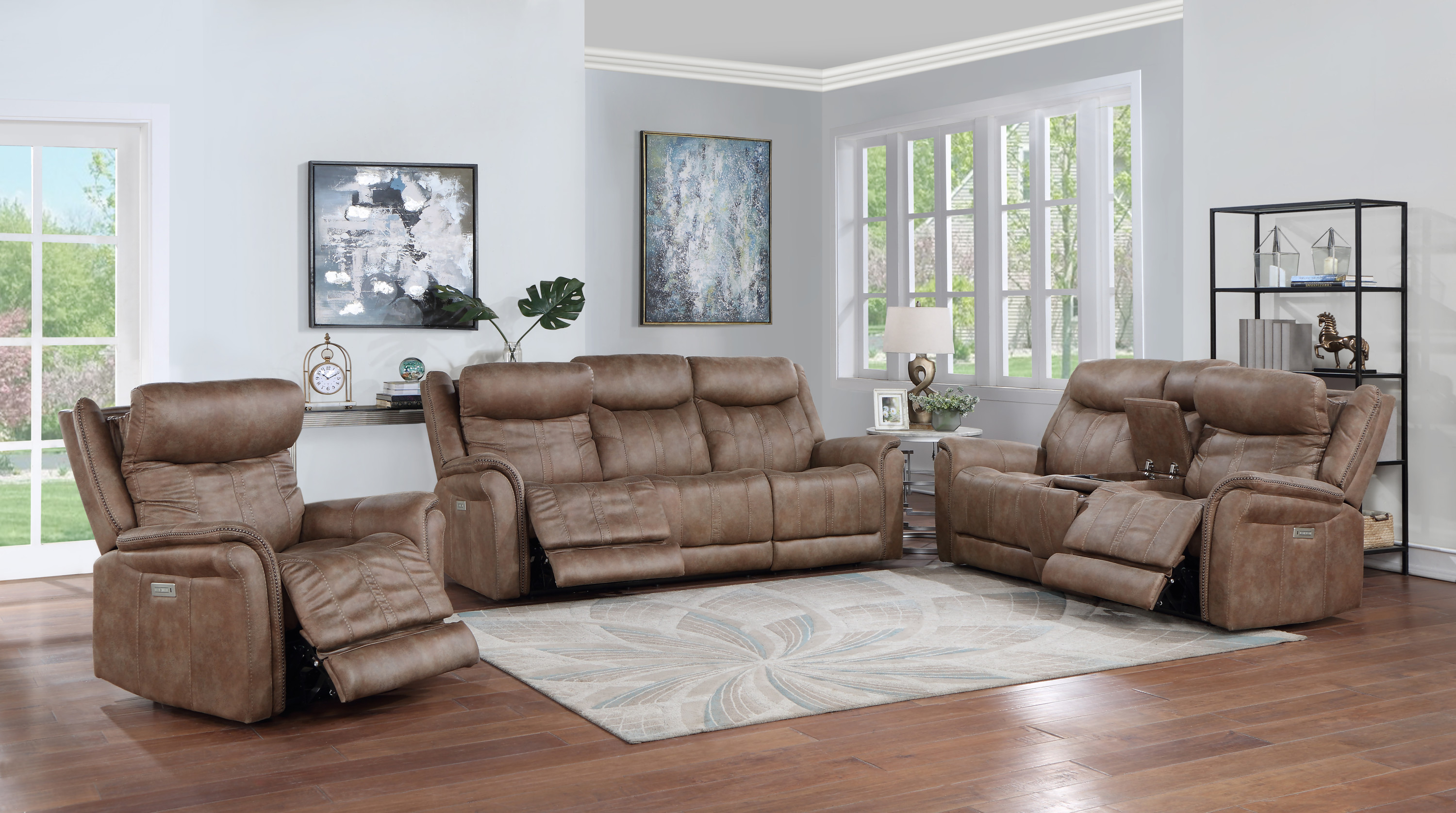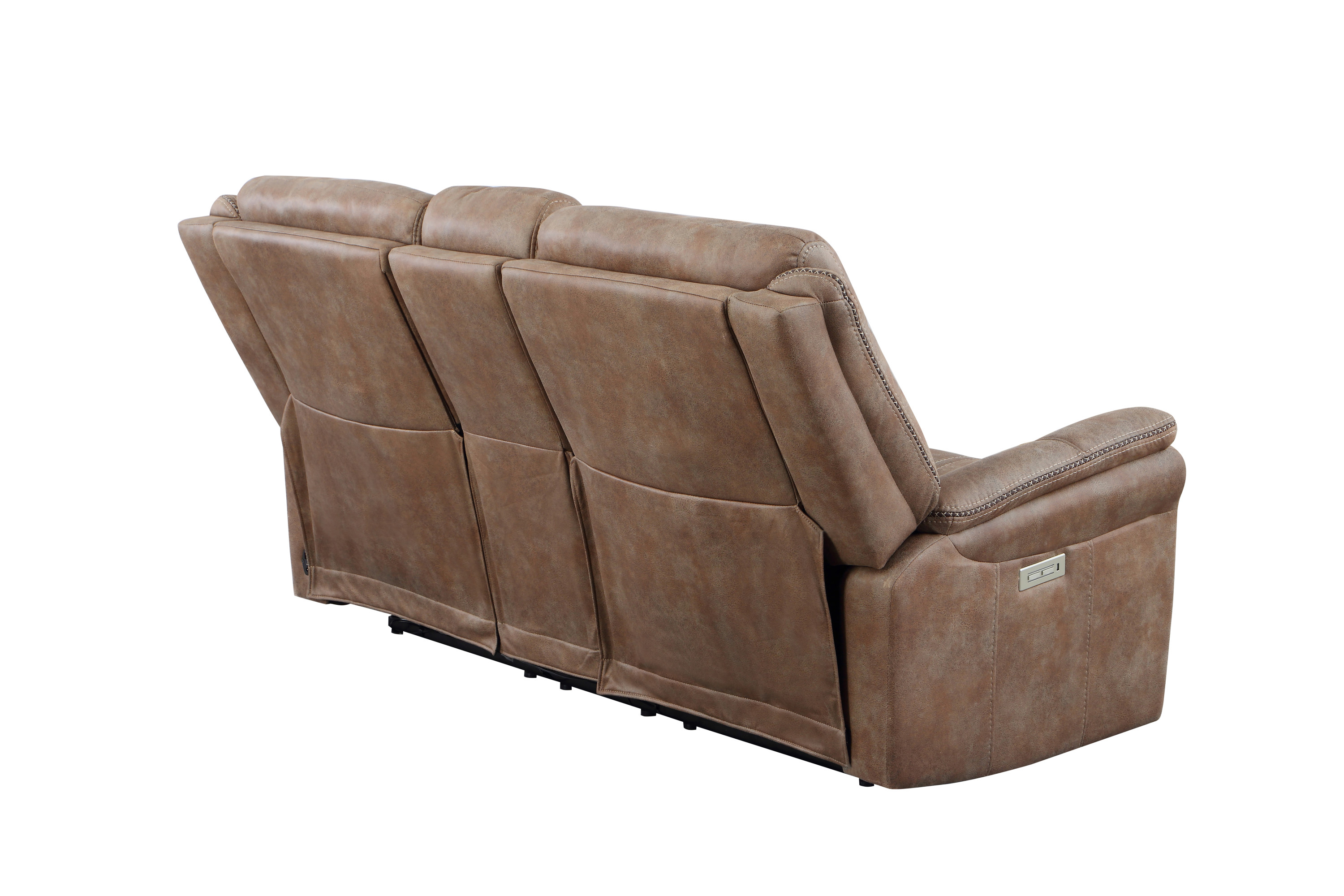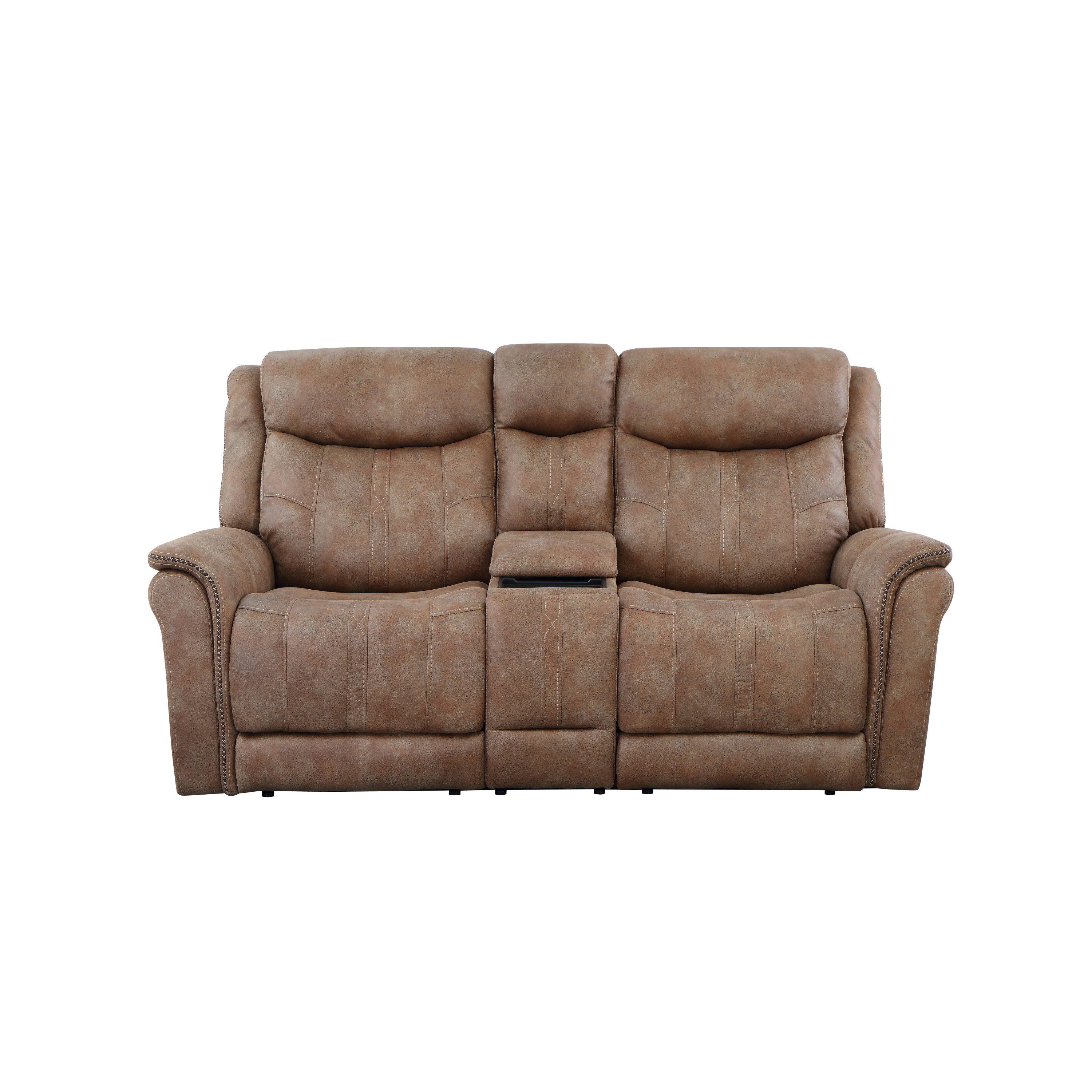 DimensionsCarton Dimensions L 88.5 x W 31.1 x H 26 Features-Styling details include overstuffed arms, contrasting baseball stitching and tapered arm treatment-Power headrest to place head in optimal spot while reclined-Power footrest-USB recharging port-Concealed cupholders pop-out when needed Product DescriptionEmbrace the perfect blend of traditional and modern elements with our console loveseat. Designed with a warm camel faux-suede cover that is butter-soft to the touch, this loveseat exudes both comfort and style. The power footrest and power headrest features ensure a comfortable seating experience for extended periods. Concealed cupholders pop out with a quick touch, allowing you to enjoy your favorite beverages without any hassle. The built-in console provides a convenient storage solution for remotes and other essentials. Elevate your living space with this durable and stylish console loveseat that is built to last.