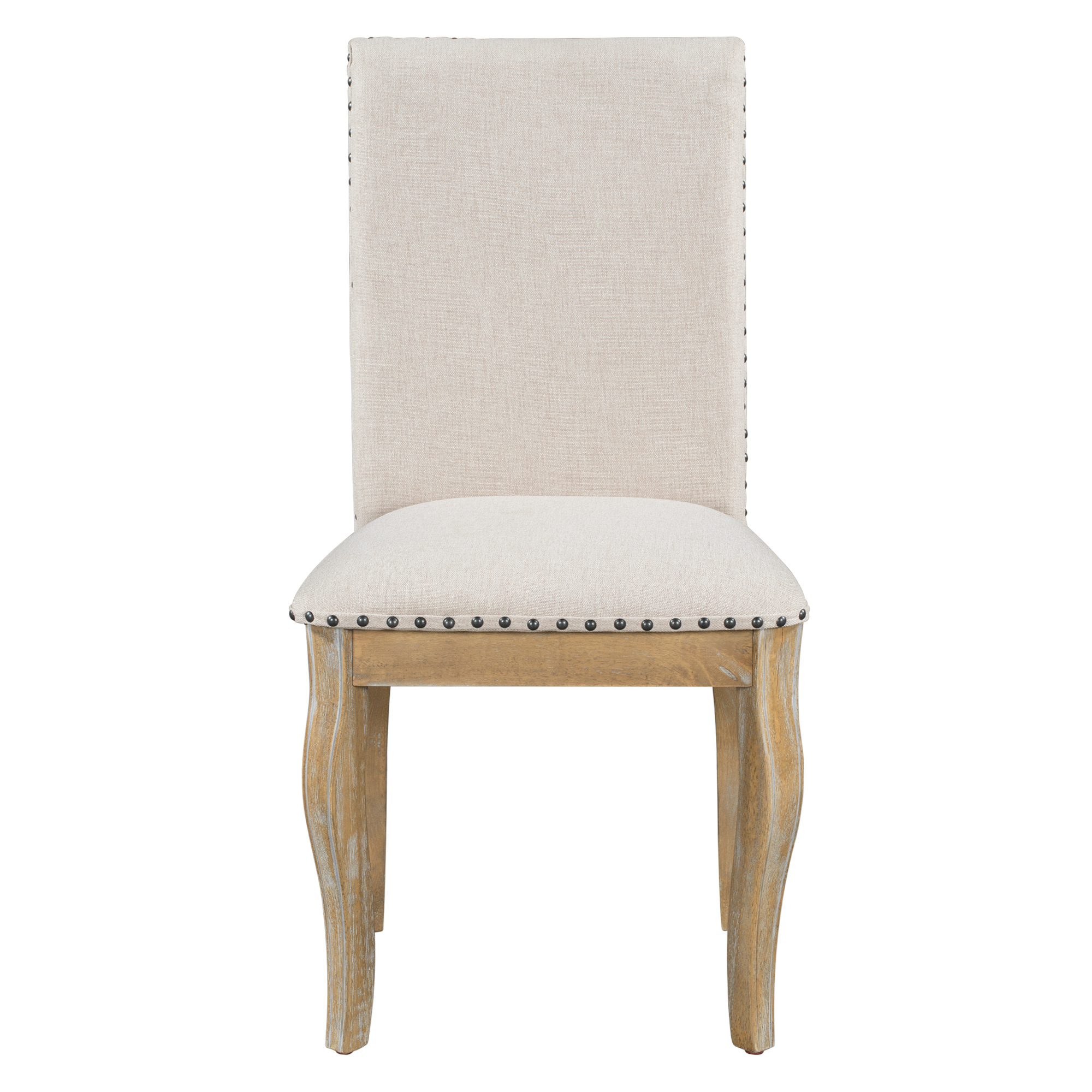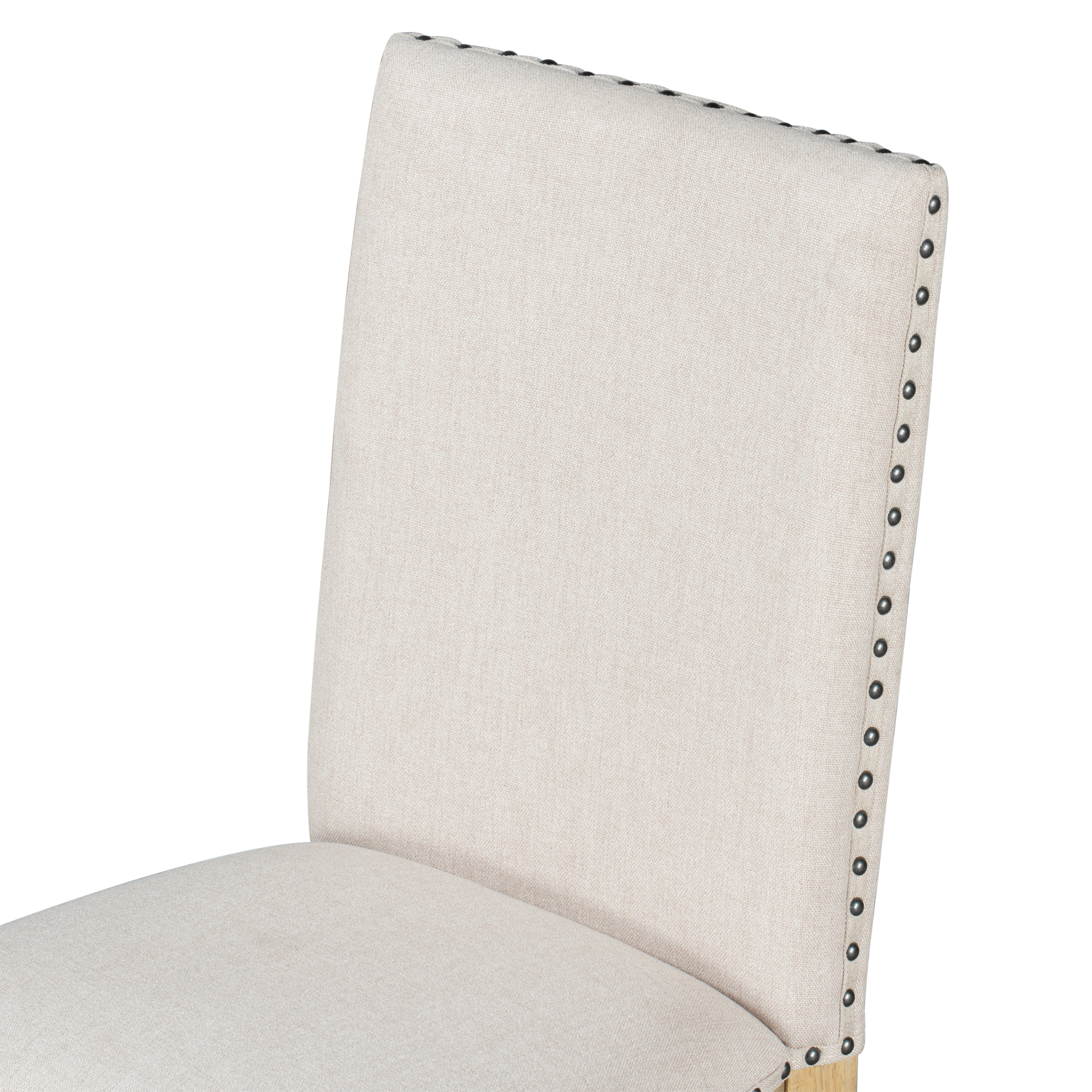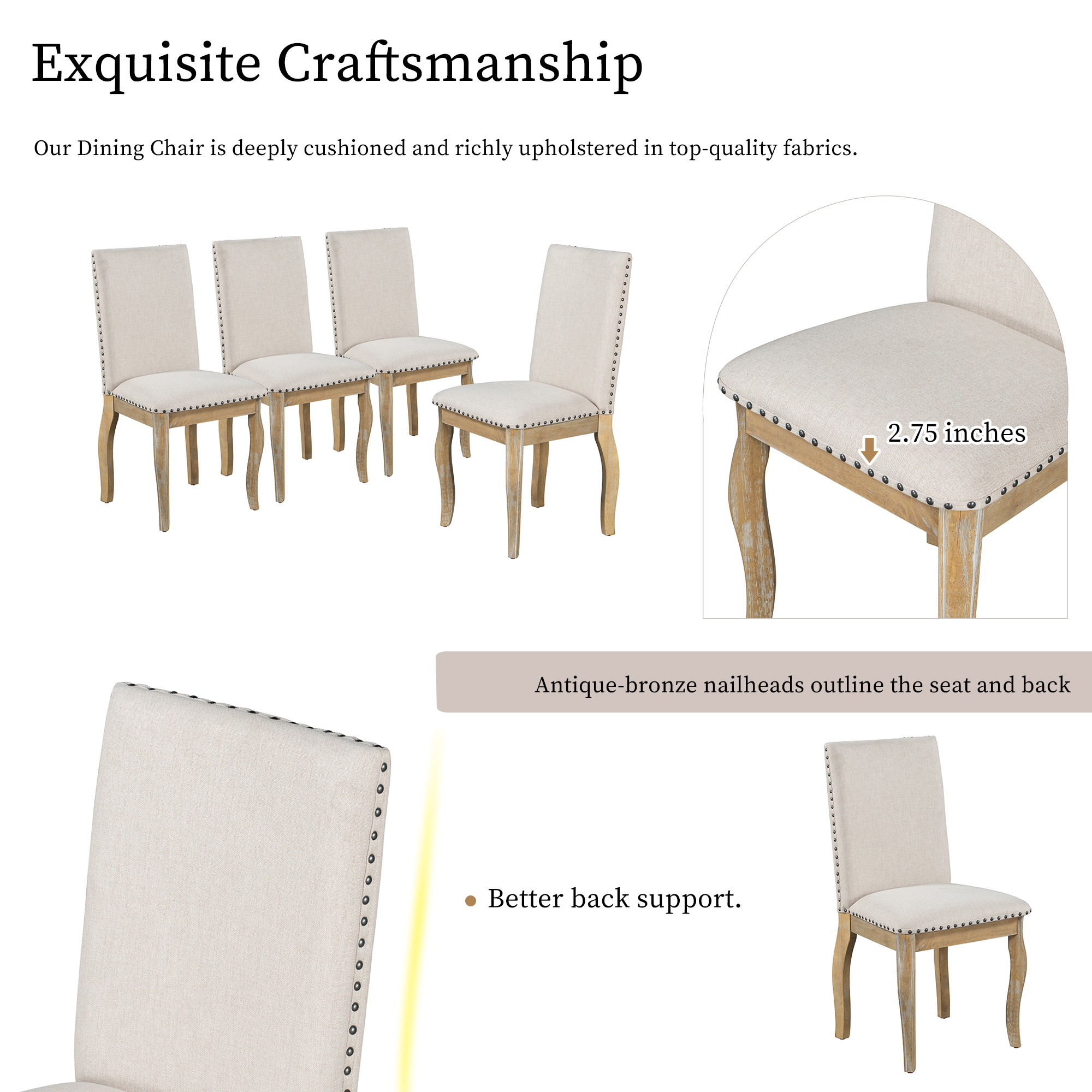 Our Dining Chair is deeply cushioned and richly upholstered in top-quality fabrics. Antique-bronze nailheads outline the seat and back. Comfortably seats up to 4 people. The thickness of cushion of chairs is 2.75 inches to guarantee wonderful using experiences.4. Comfortable Experience