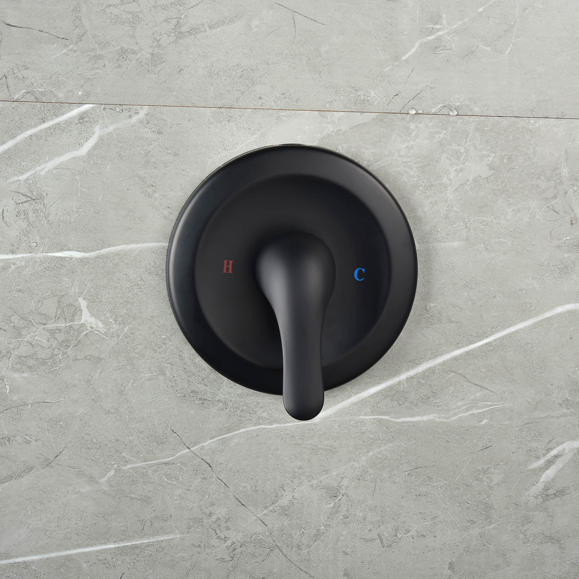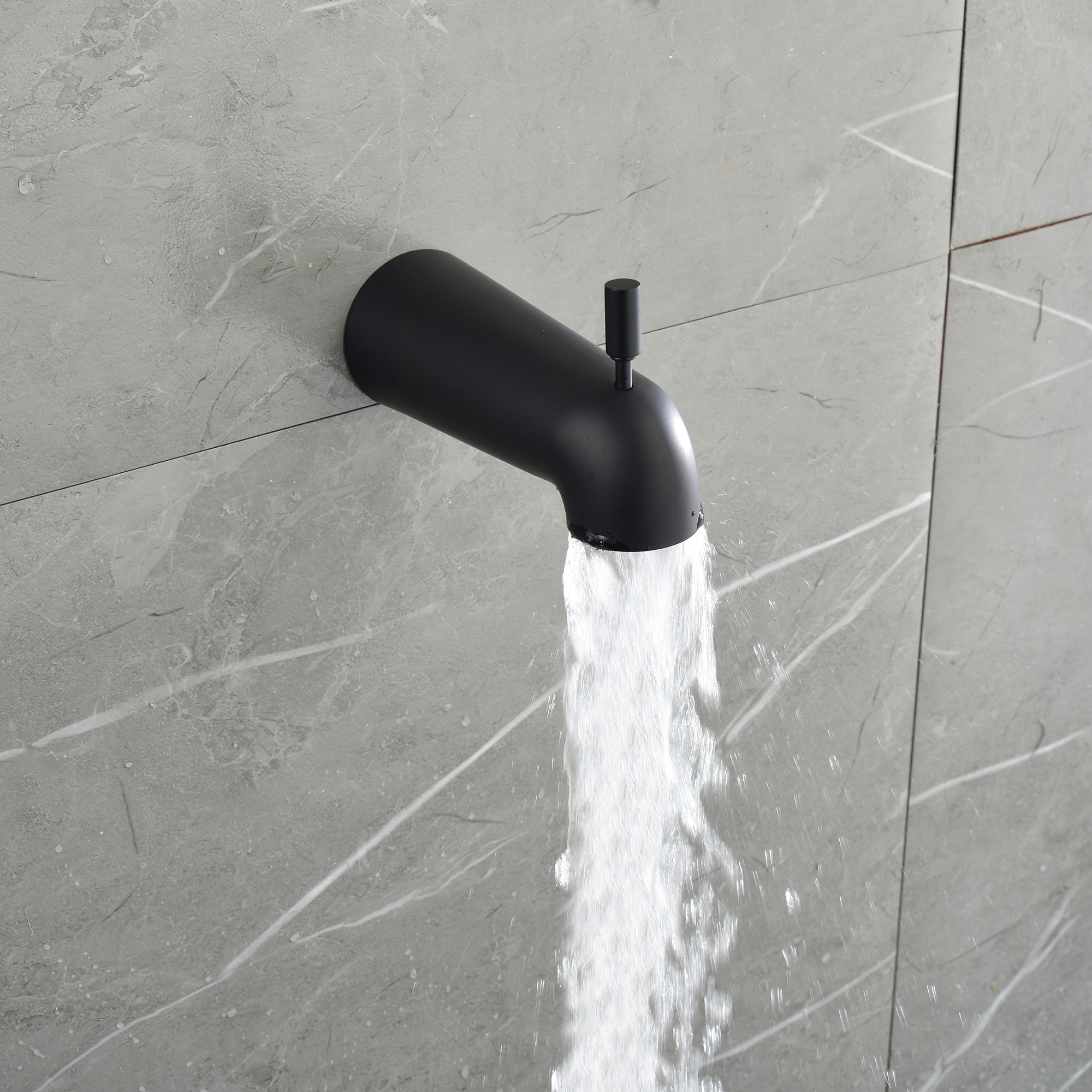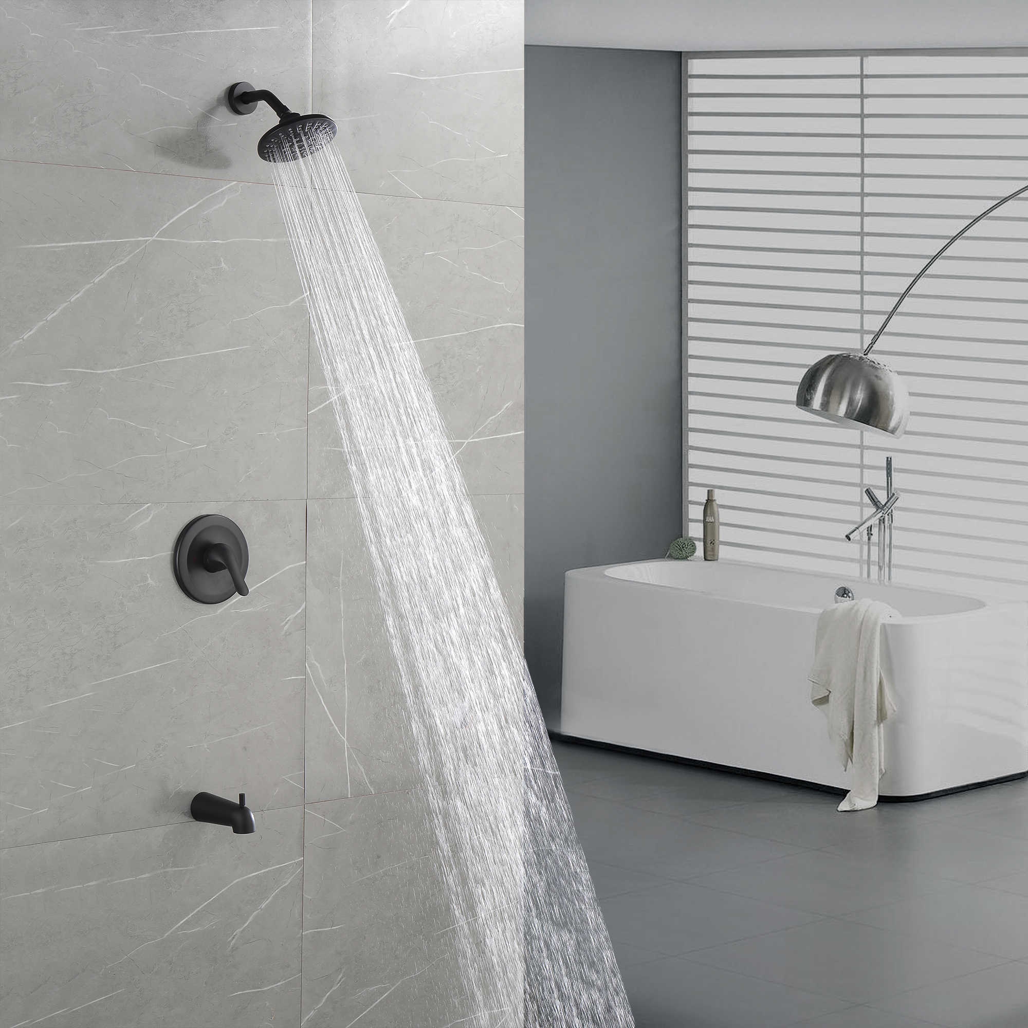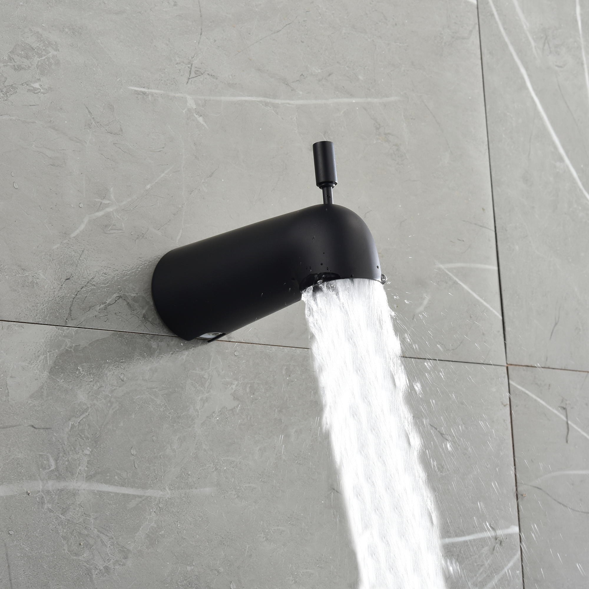 The shower fixtures include the black bathtub faucet. Turning on the single handle switch means the water came out from the black tub spout first, and putting up the bathtub switch means turning off the tub water.