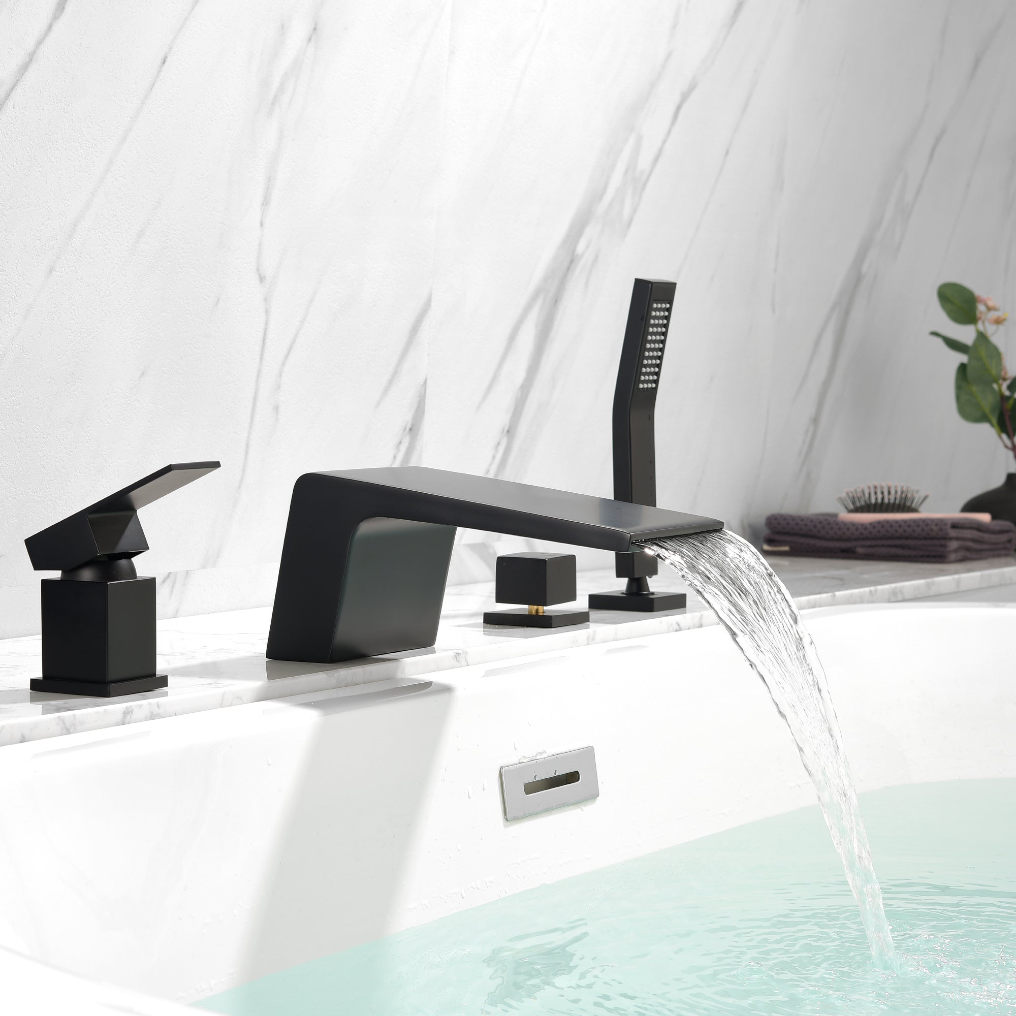 This is a modern Deck Mount Roman Tub Faucet with a minimal, streamline design and elegant hand shower that makes bathing a truly pleasurable experience. 4 Hole installation. This tub faucet requires low maintenance and is easy to clean.