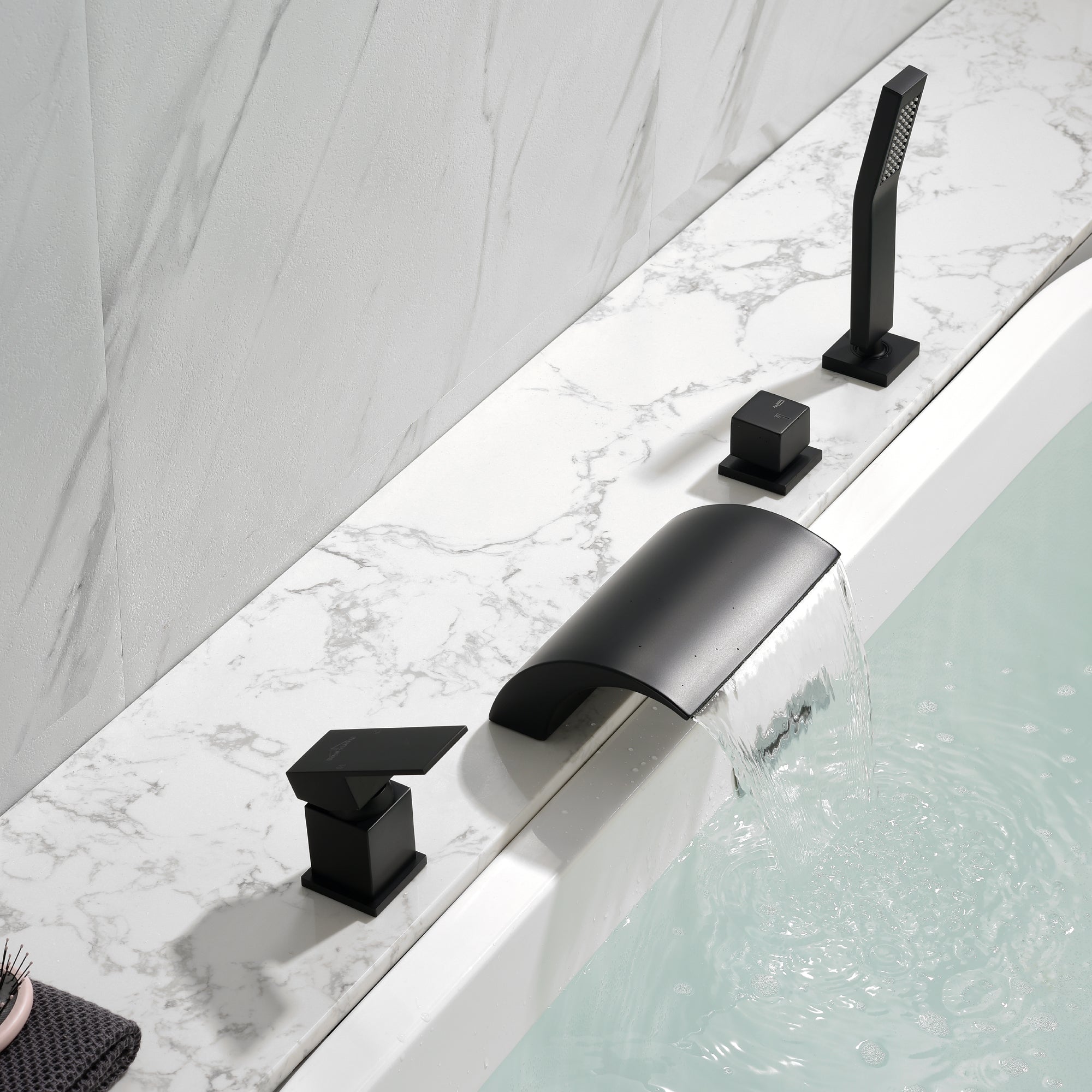 This is a modern Deck Mount Roman Tub Faucet with a minimal, streamline design and elegant hand shower that makes bathing a truly pleasurable experience. 4 Hole installation. This tub faucet requires low maintenance and is easy to clean.