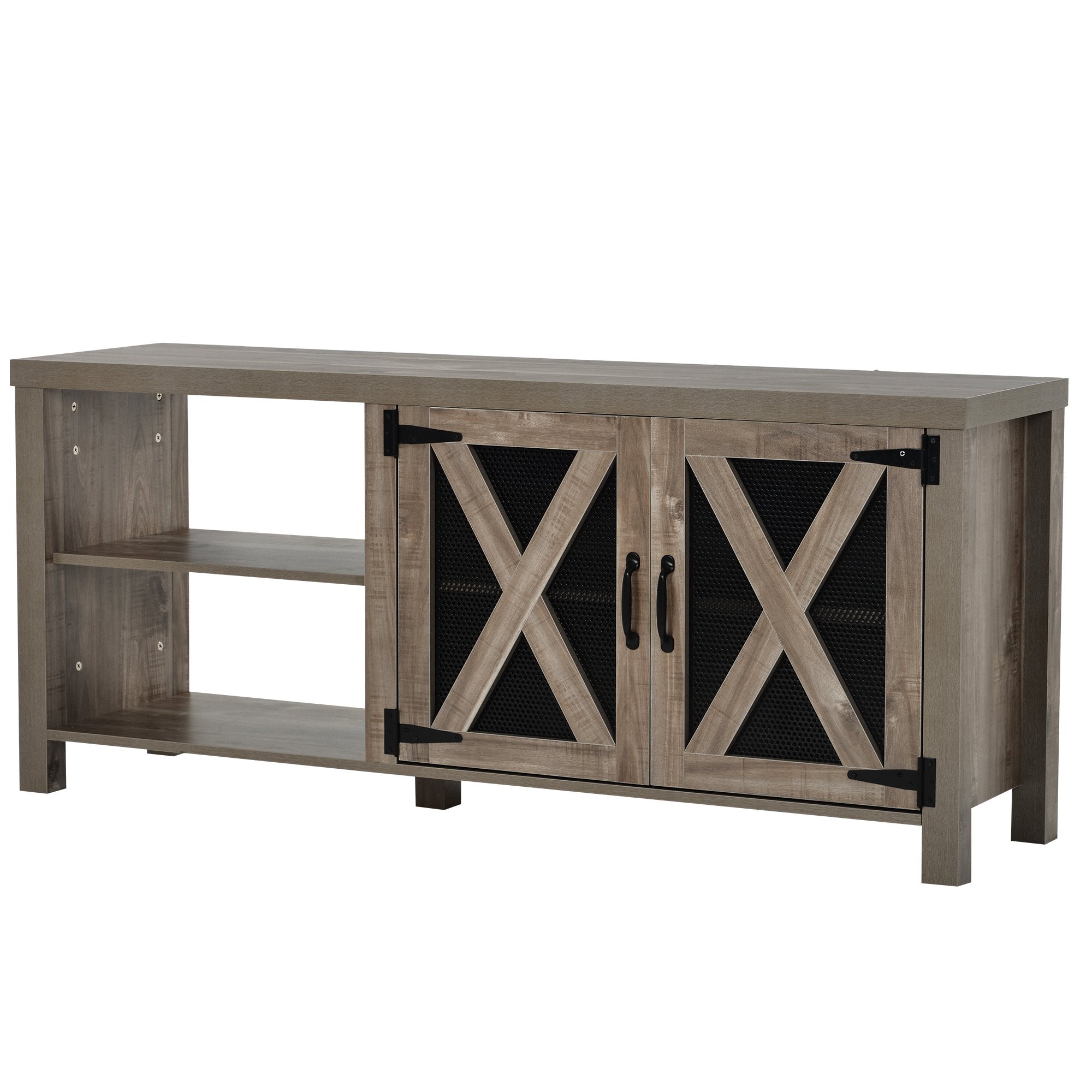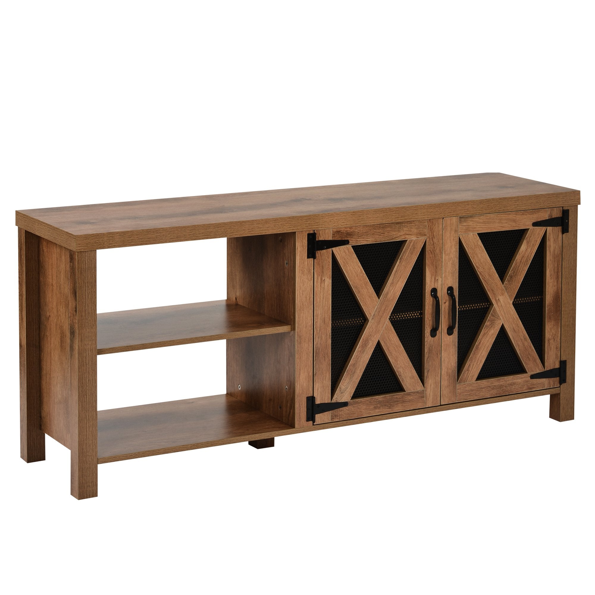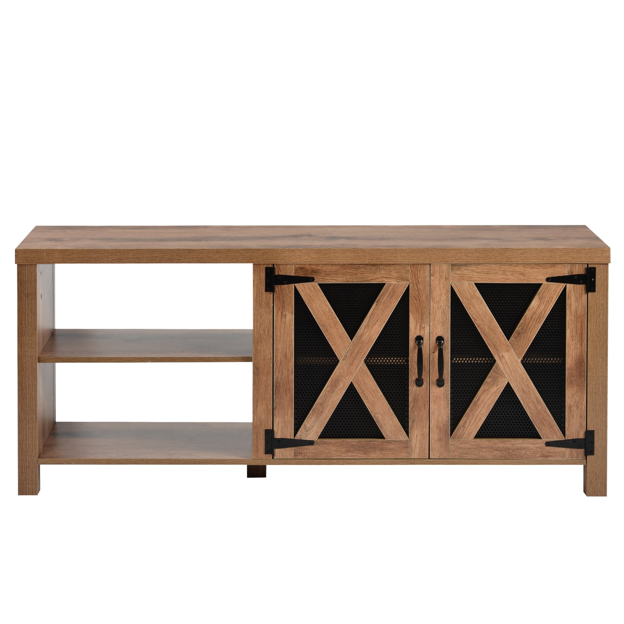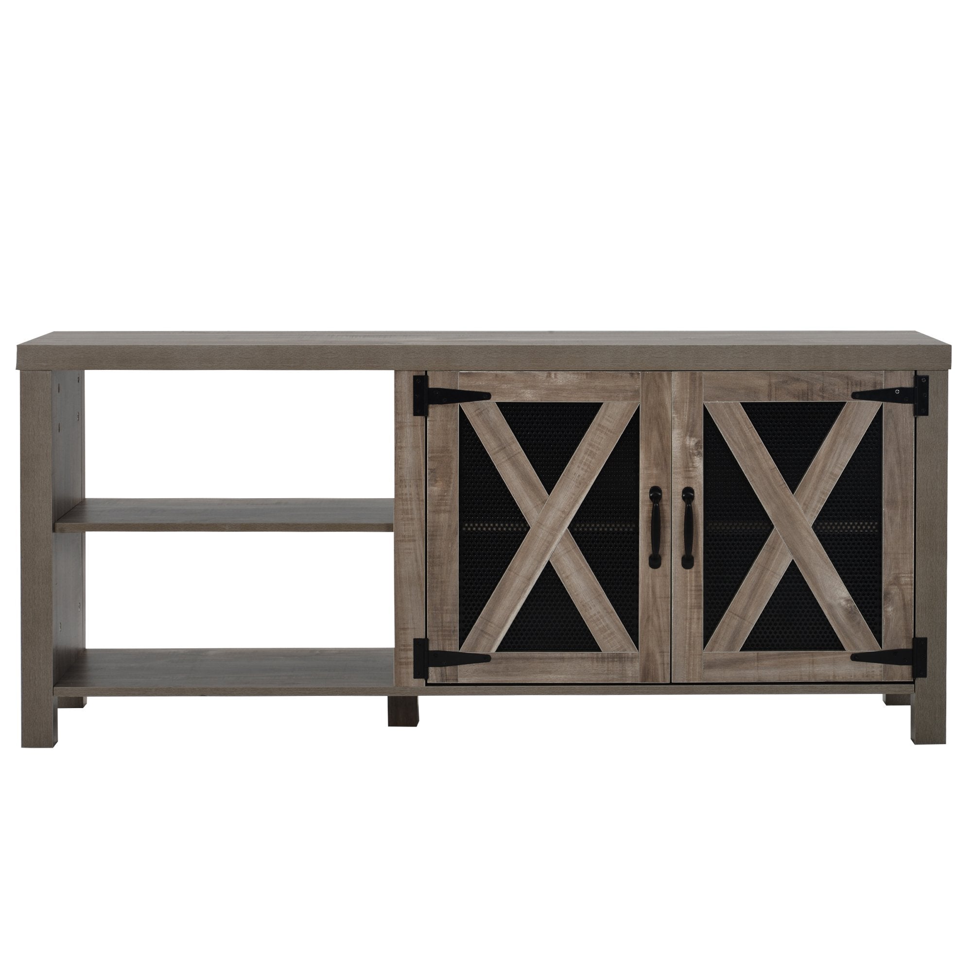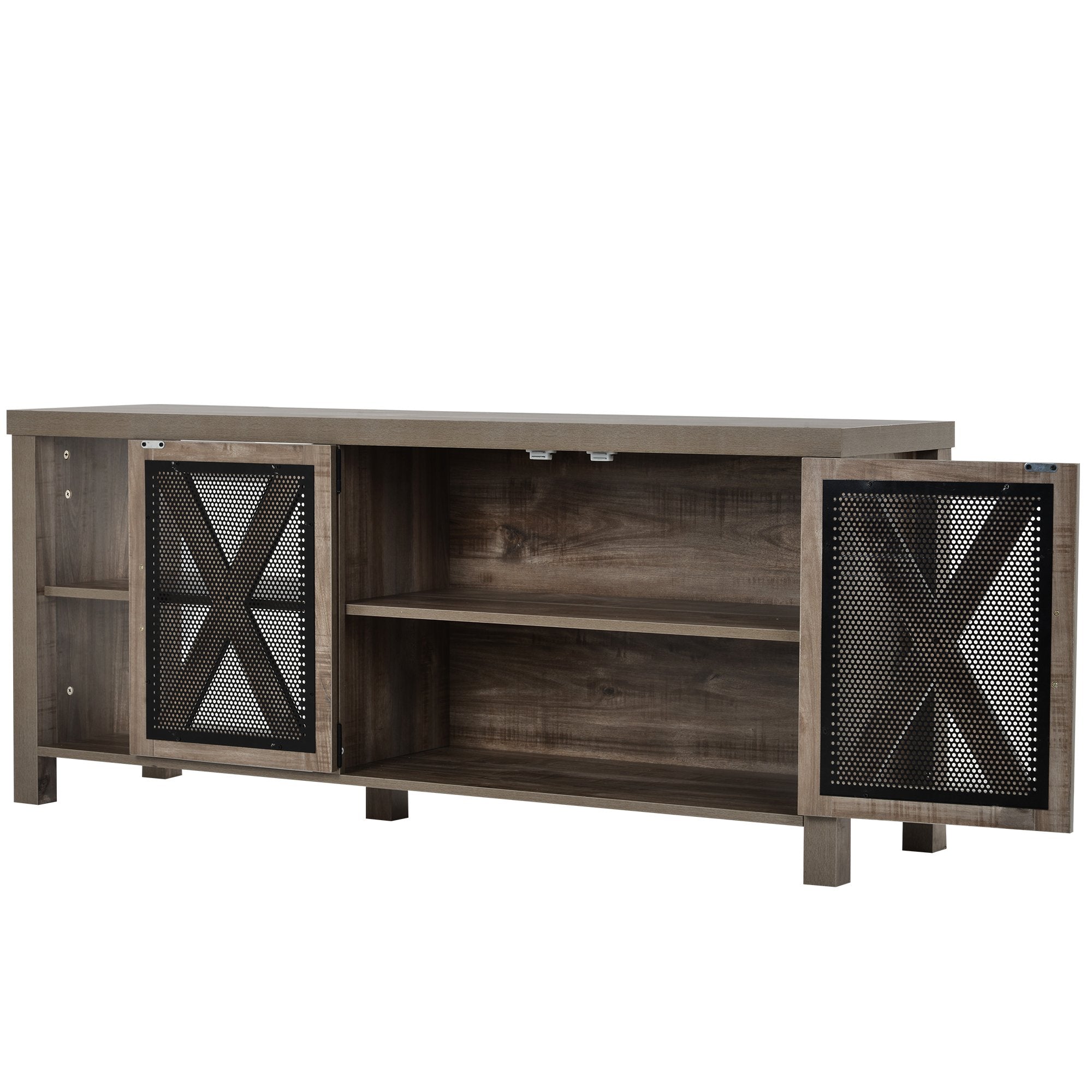 Update the look of your home with this rustic TV stand. With closed storage space behind mesh x-frame cabinet doors and open storage space to fit your media, electronics, and décor. The exposed hinges and mesh metal accents create a feeling that you'll love having in your home, whether in your living room, bedroom, or kitchen. This versatile console provides additional storage space and can be used as a storage cabinet or buffet.