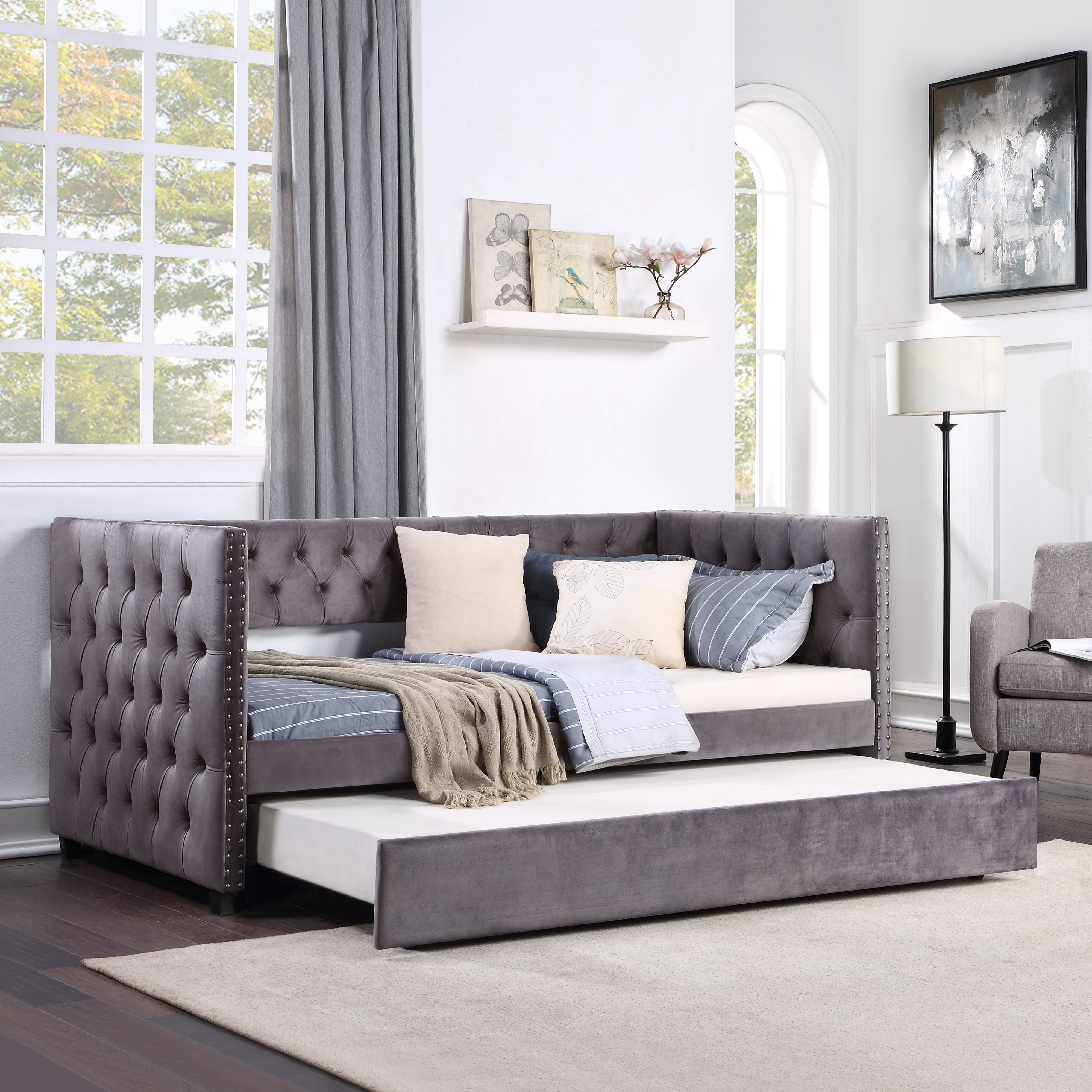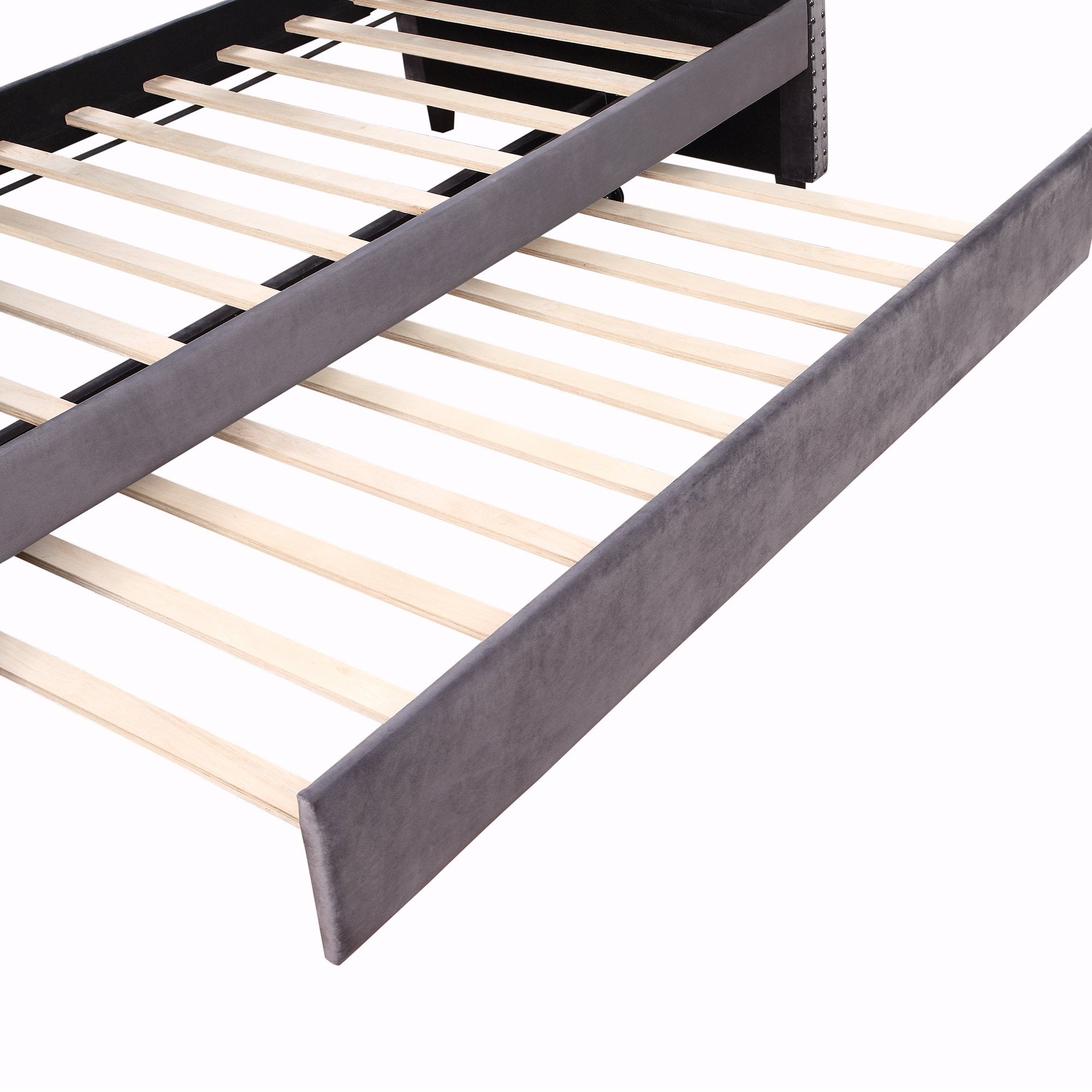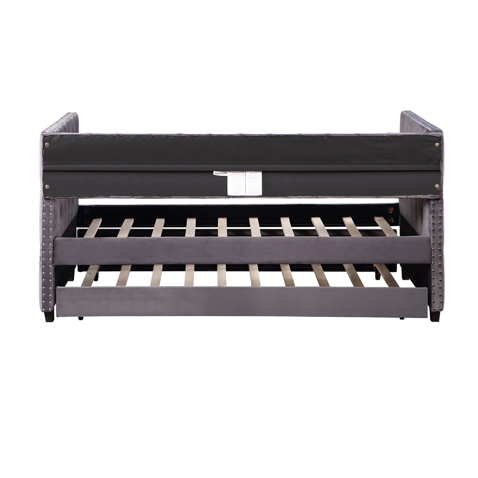 Twin Daybed with Trundle, Upholstered Tufted Sofa Bed with Nailhead Trim, Gray