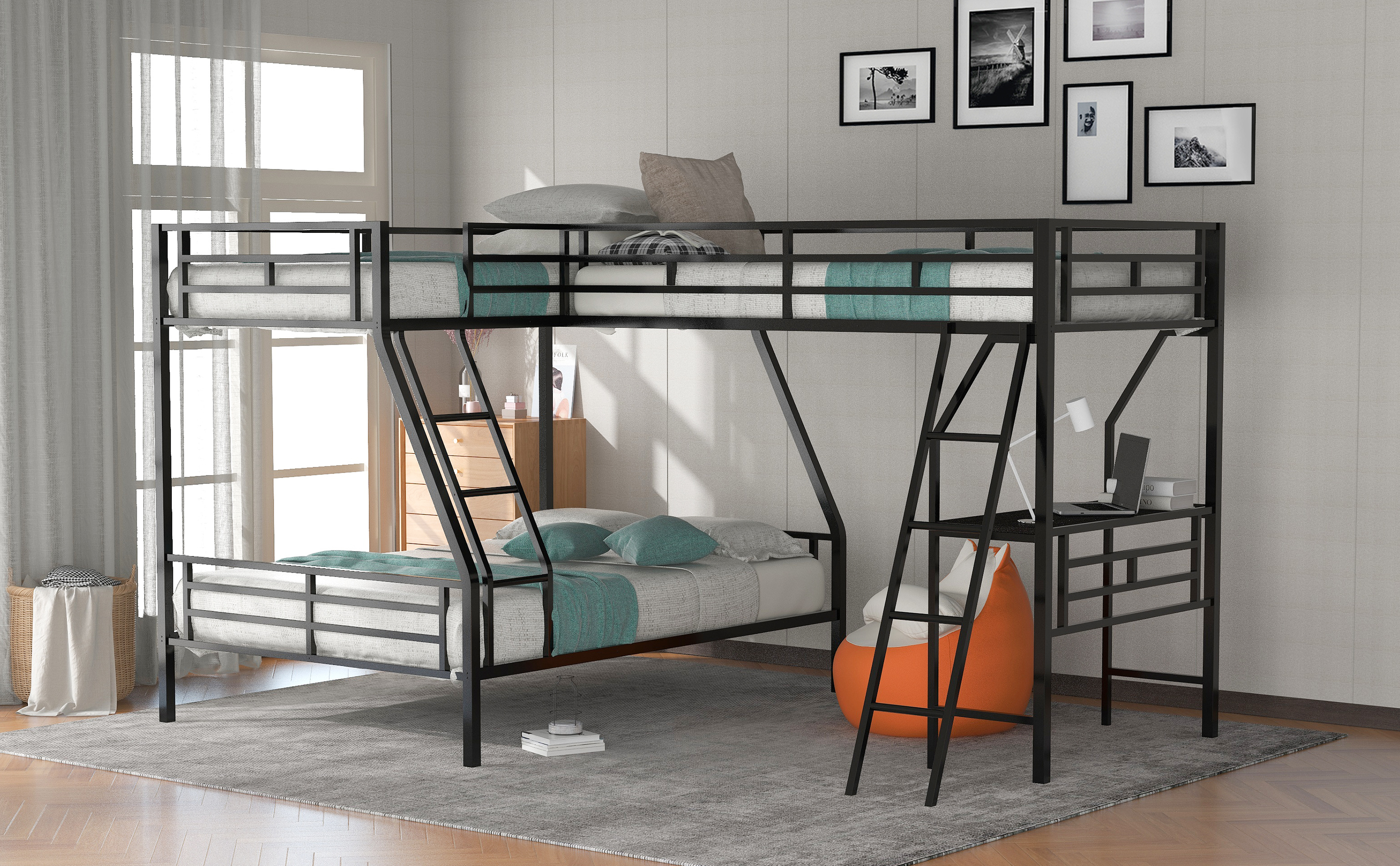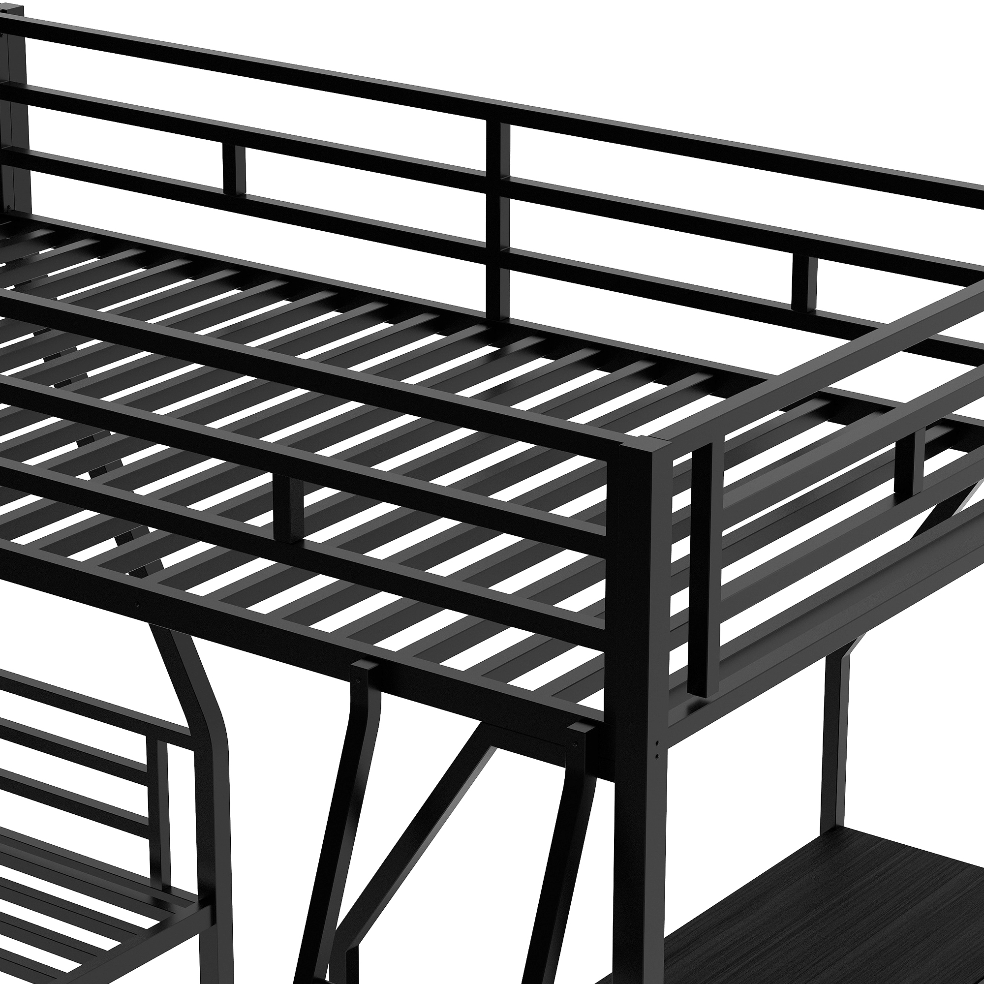 ①[Twin over Full Loft Bed with Desk] Strong metal frame that includes an integrated ladder, full-length guardrails、secured metal slats to ensure security and stability. Solid wooden desk and ladder is beneficial and comfortable. No additional box spring or foundation required.