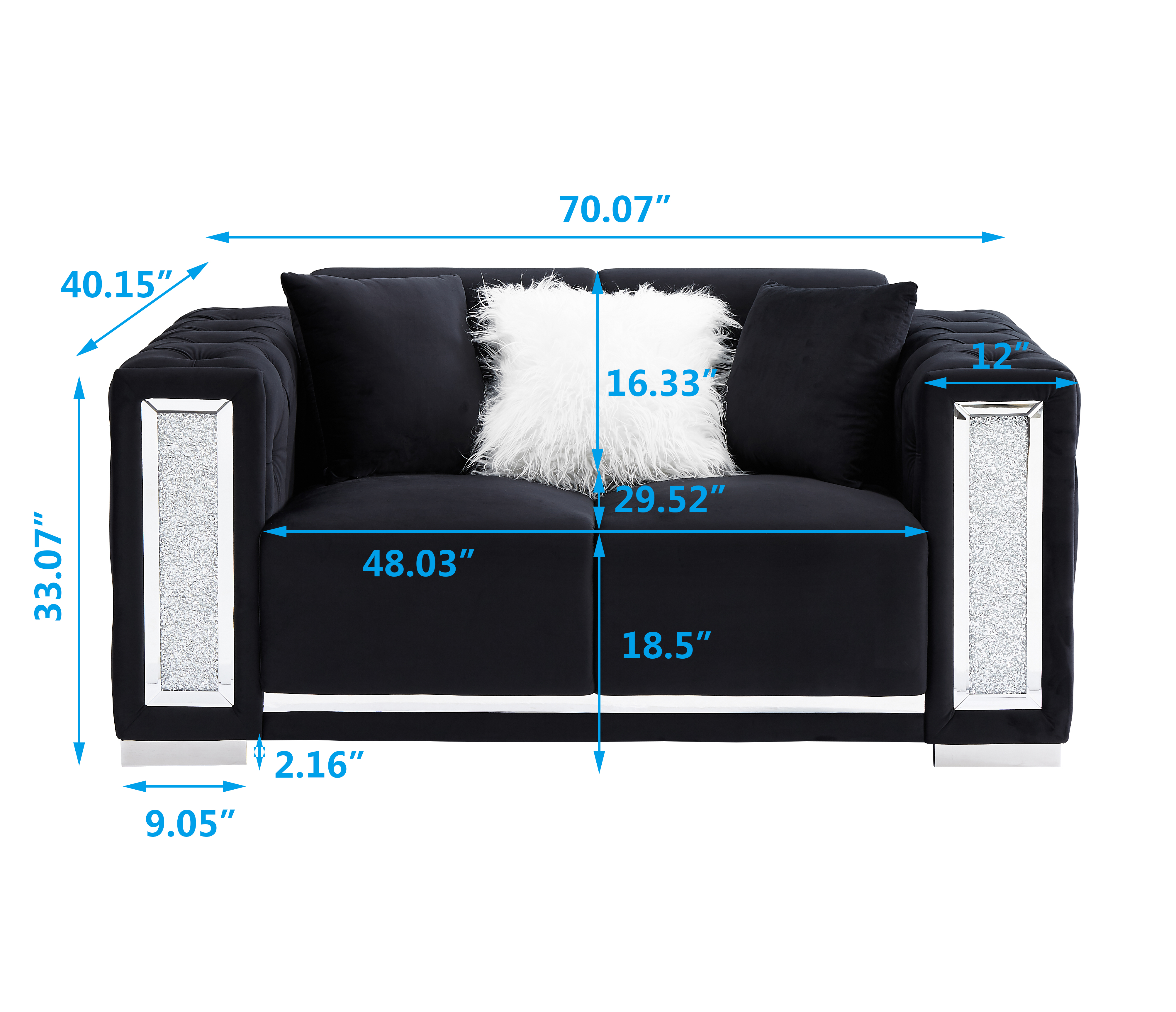 The loveseat sofa set is covered in soft velvet with tufting on the outside and inside of the armrests and backrest. Pocketed coil cushions make this set comfortable and durable, hardware feetfeature Product Type: Sofa Number of seats: 2 Upholstery material: Dutch velvet Seat padding material: foam Seat Construction: Pocketed Coil Springs and Twist Springs Backfill material: foam Frame material: solid + artificial wood Leg Material: Hardware Feet Leg color: silver Arm type: square arm Back Type: Removable seat cushion :NO Include toss pillows yes, 3Product Size:70.07"*40.15"*33.07" Net weight: 158.68 lbsPackage dimensions: 70.86"*40.55"*32.28" Gross Weight: 174.77 lbs Regular product maintenance and dust removal. Gently clean with a clean, slightly damp cloth. Professional cleaning isrecommended. Avoid direct sunlight. Never use harsh chemicals for cleaning. 600 lbs Country of Origin China Requires adult assembly : yes Suggested number of people: 2