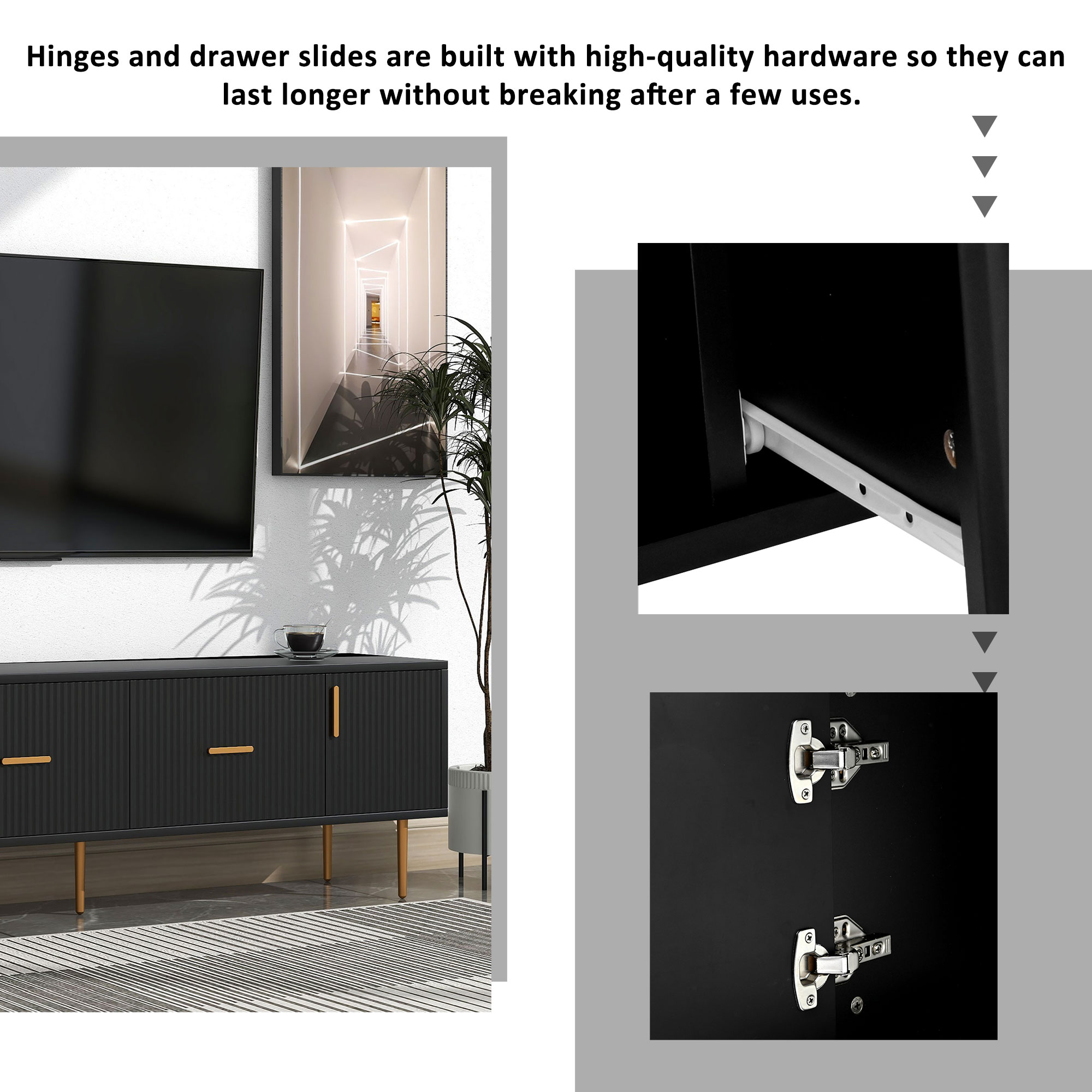 [DURABLE] This modern TV Stand is constructed of high quality materials, making it highly durable and resistant to wear and tear.