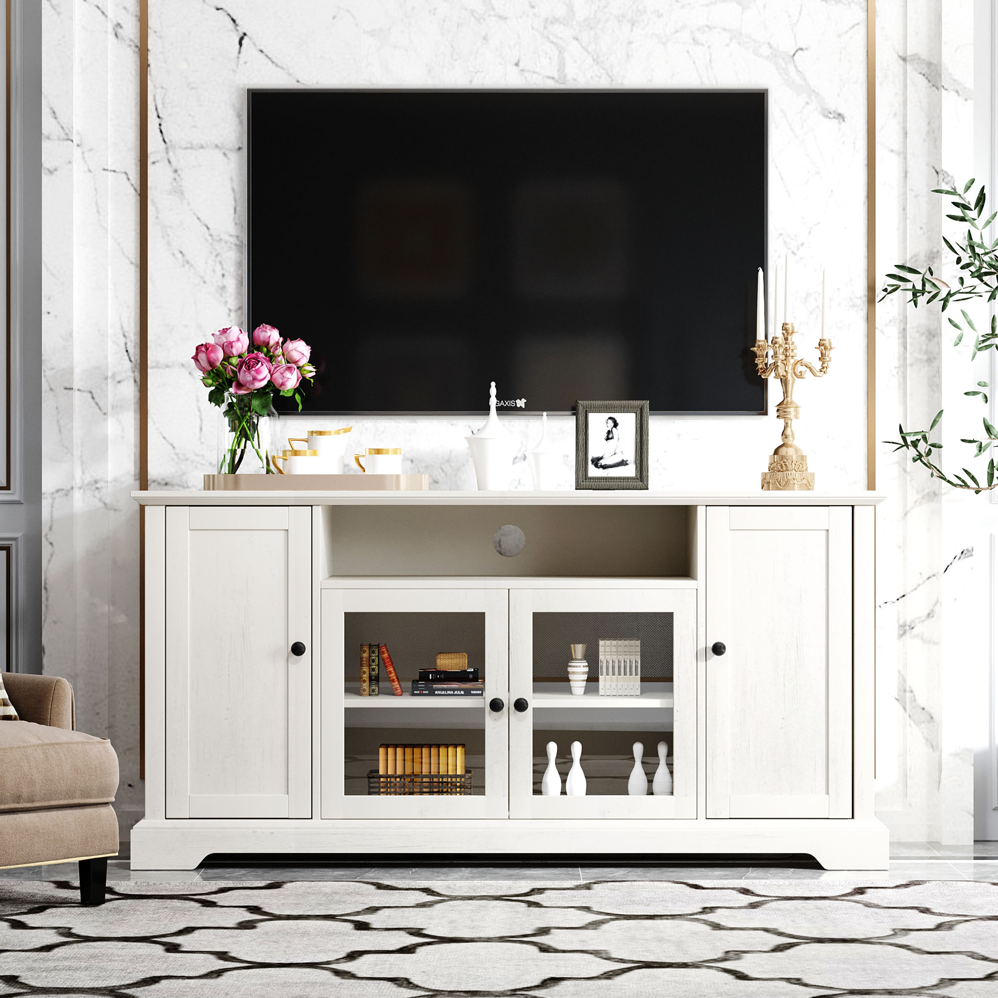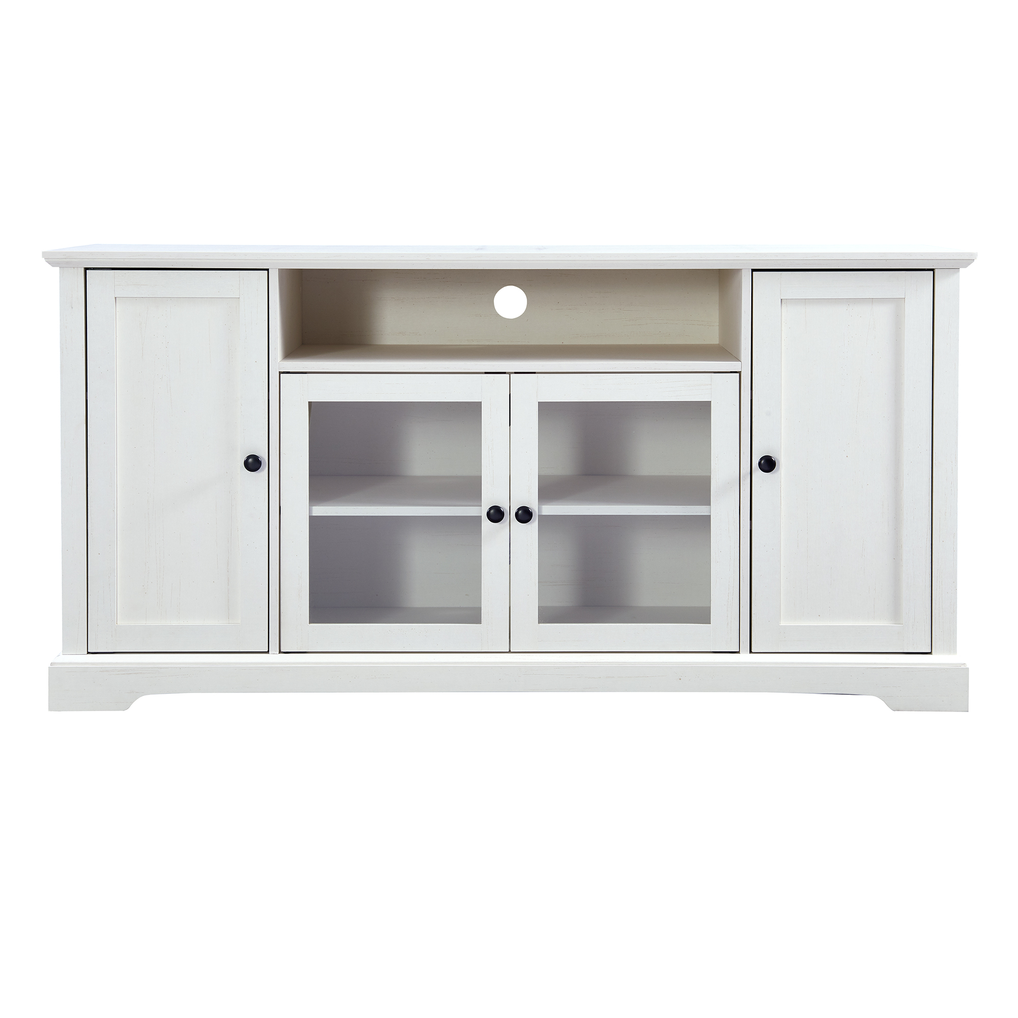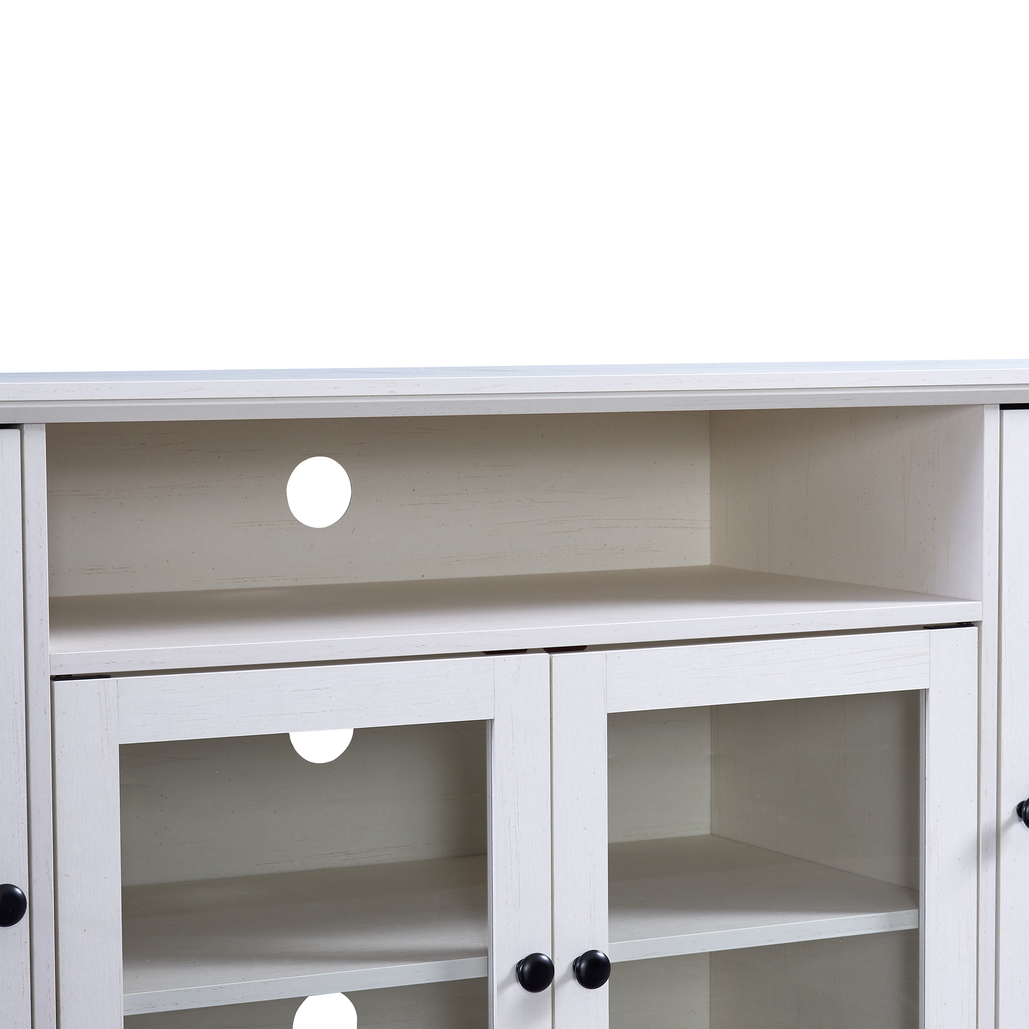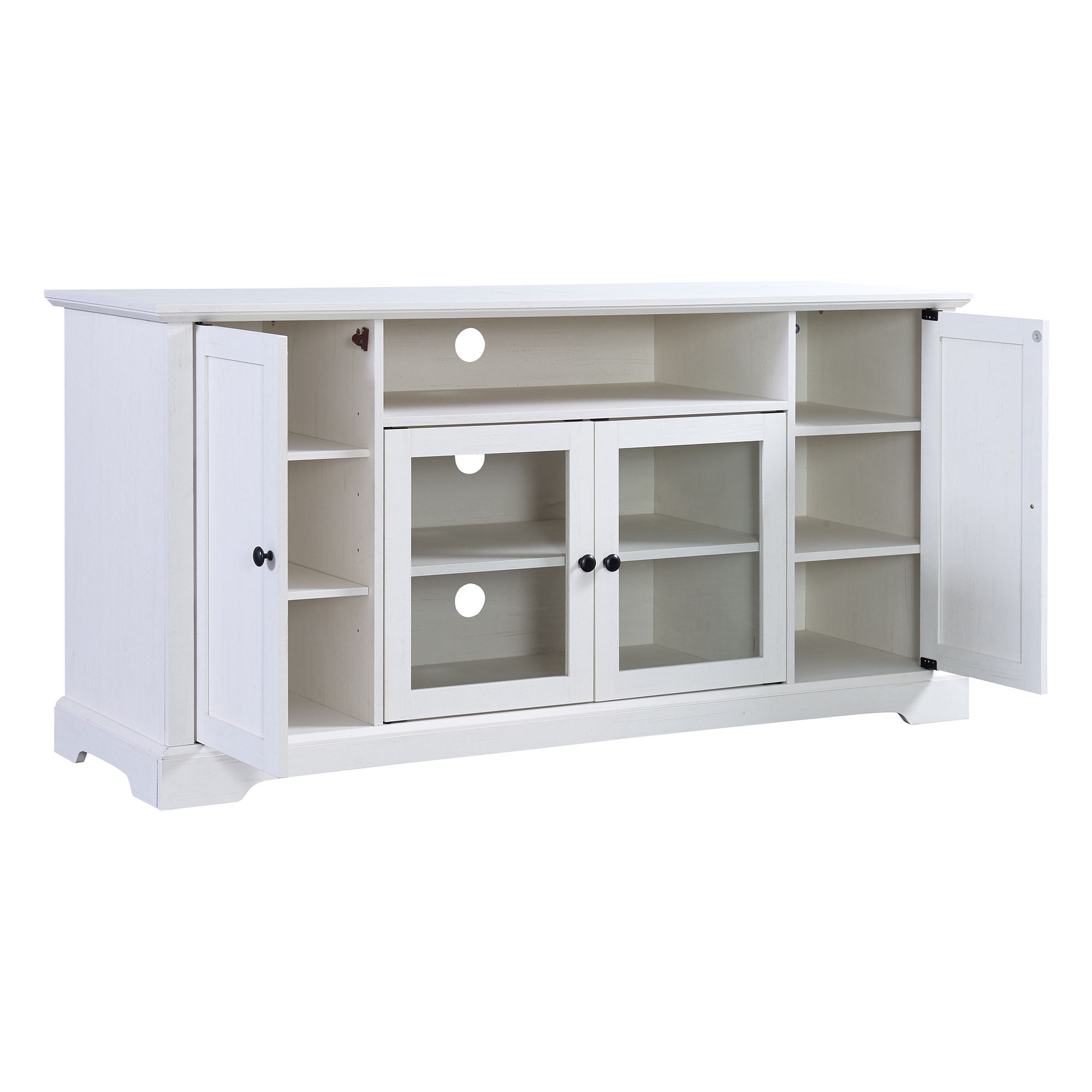Integrate a transitional feel into your living room with this highboy console. This console is a practical piece ideal for storing room essentials, from your movies to your books and decor, as it has open and closed shelving.Functioning as a TV stand and entertainment center, this media console can accommodate most flat panel TVs up to 65 inches and have three cable managements feature in the back for a tidy appearance.Side cabinets feature adjustable shelving so you can easily fit your items inside, with tempered glass doors for a stylish look.