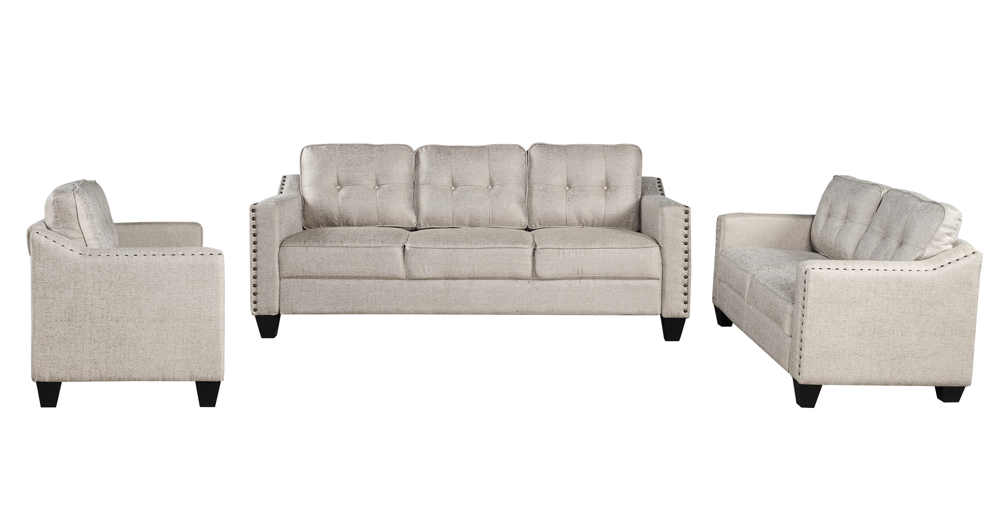 This 3-piece sectional sofa set includes a 3-seat sofa, loveseat, and armchair, capable of fitting up to six adults comfortably. Contemporary design is merged with fashion allure with the elegant silhouette paired with the decorative nail head trim detailing. With a simple but modern style, enjoy having a touch of graceful charm in your living space. This set is available in two rich upholstery tones to select from that are soft to the touch with the beige upholstery option featuring eye-catching gilded pattern fabric. Thick padded set and back cushions feature fabric piping and dimpled tufting, providing both a polished appearance and heightened comfort. Crafted with a solid wood frame, this set is sure to serve your family for an extended period of time. This set comes complete with a one-year warranty, if you have any questions, comments, or concerns, please contact our customer service representatives.