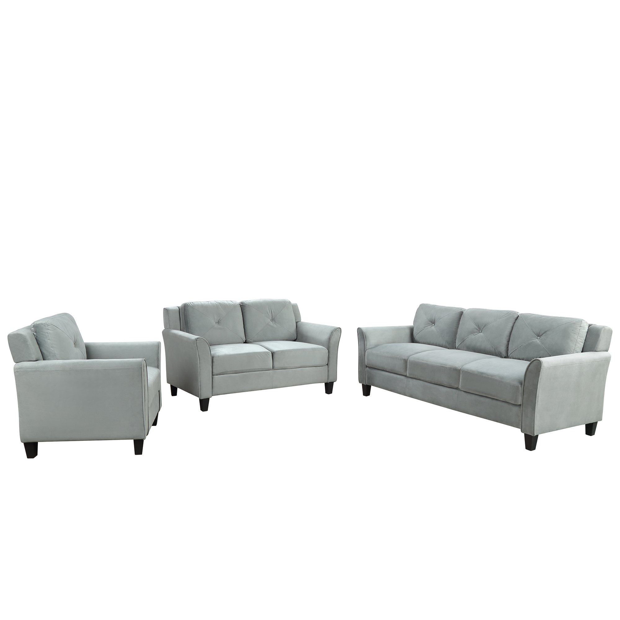 Add traditional charm to your home without breaking the bank with this 3-piece sofa set that will add the perfect upgrade to your living room that you have been looking for. Complete with one three seater sofa, one loveseat and one sofa chair, you can seamlessly fill the empty spaces in your living room to help make your house feel like home instantly. Lean back into soft polyester blend upholstery and the generously stuffed high density foam cushions for heightened comfort with the seat cushions complete with thick spring reinforcements for anti-sagging wear and a slight pleasant rebound when sitting. Constructed with a high grade mixed wood frame, this sofa set has been built for a high weight capacity so you and guests can sit back and relax with a peace of mind.