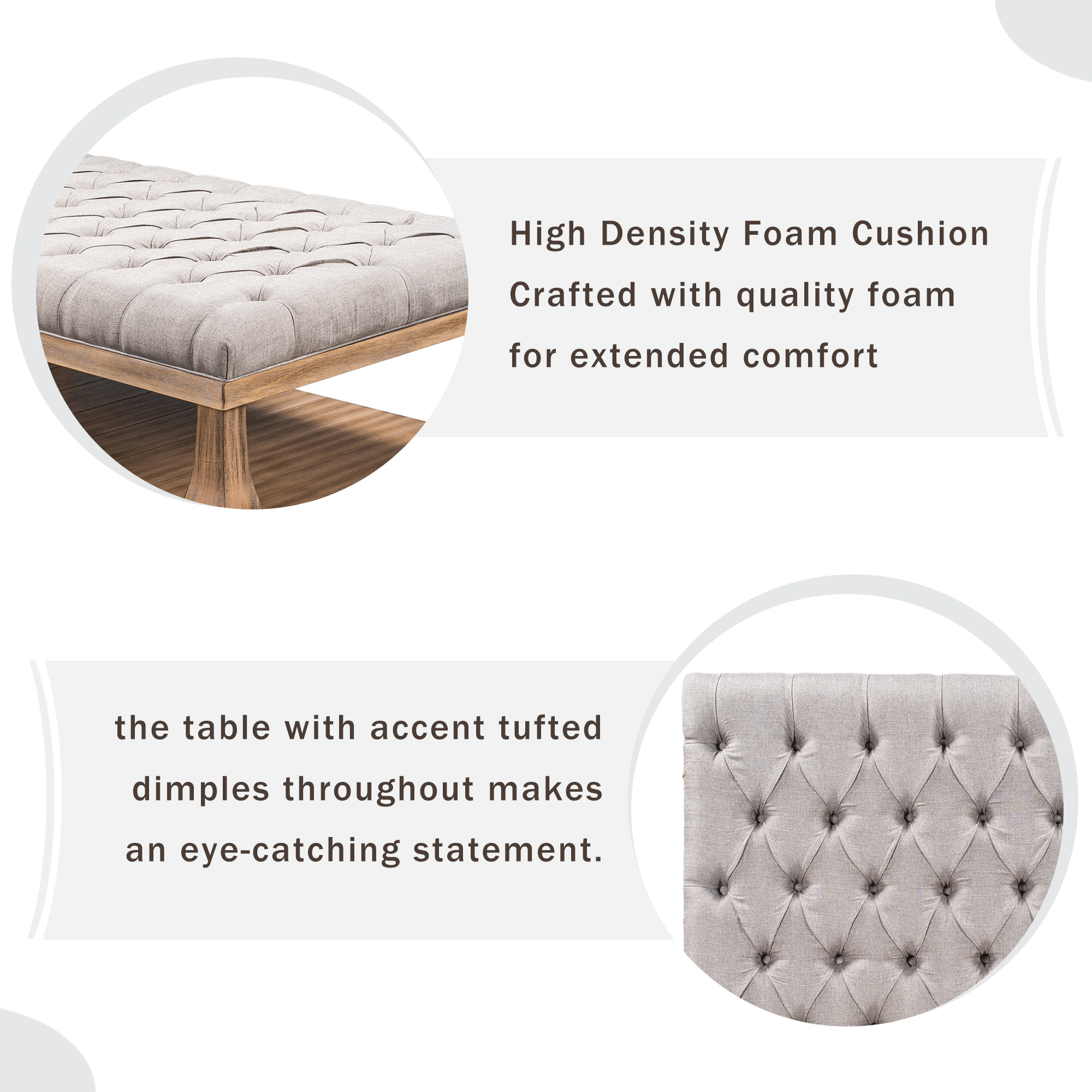 The high density cushion seat is crafted with quality foam for extended comfort while featuring accent tufted dimples throughout making an eye-catching statement. Velvety soft polyester upholstery is available in flattering neutral gray or beige tones. Take a breather and relax on this bench and use it to upgrade your room aesthetic.