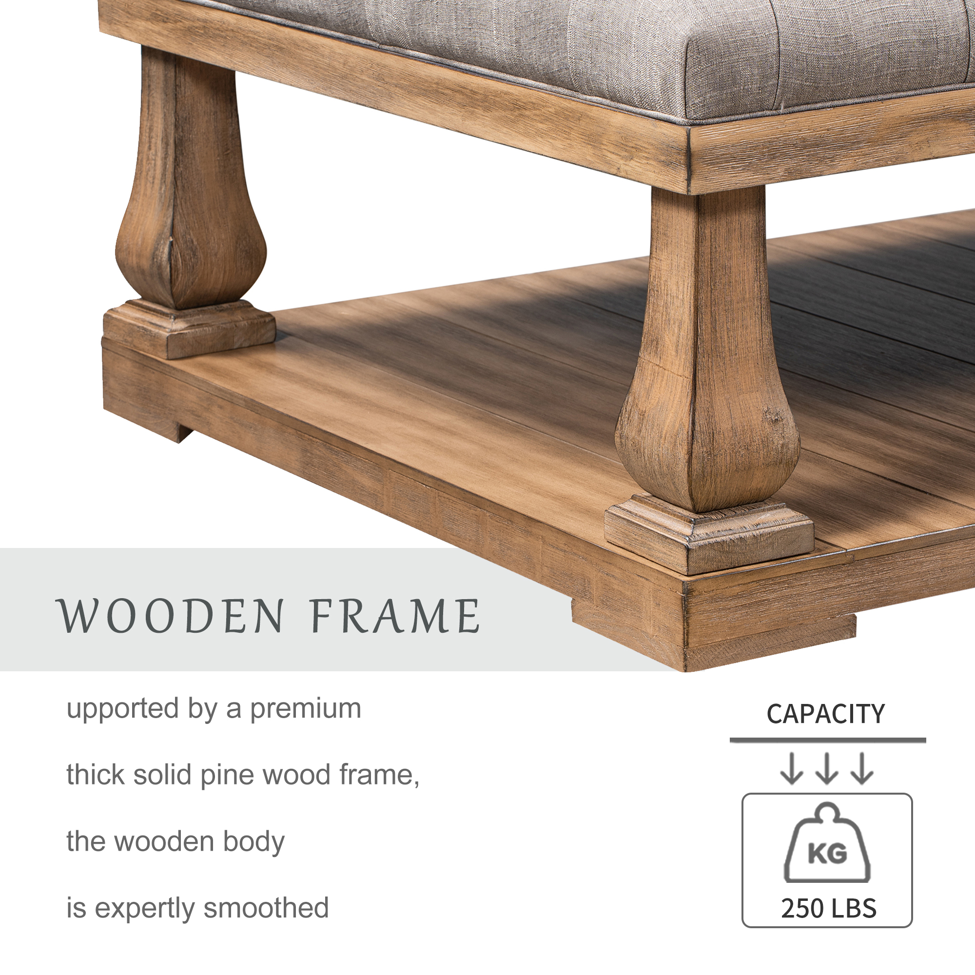 Supported by a premium thick solid pine wood frame, the wooden body is expertly smoothed and stained in a rich ocher finish that pairs perfectly with the neutral toned cushioned upper. Eye-catching carved detailing is featured in each of the four support pillars for an elegant finishing touch to this piece that will effortlessly complete your space. Maximum weight capacity: 120kg