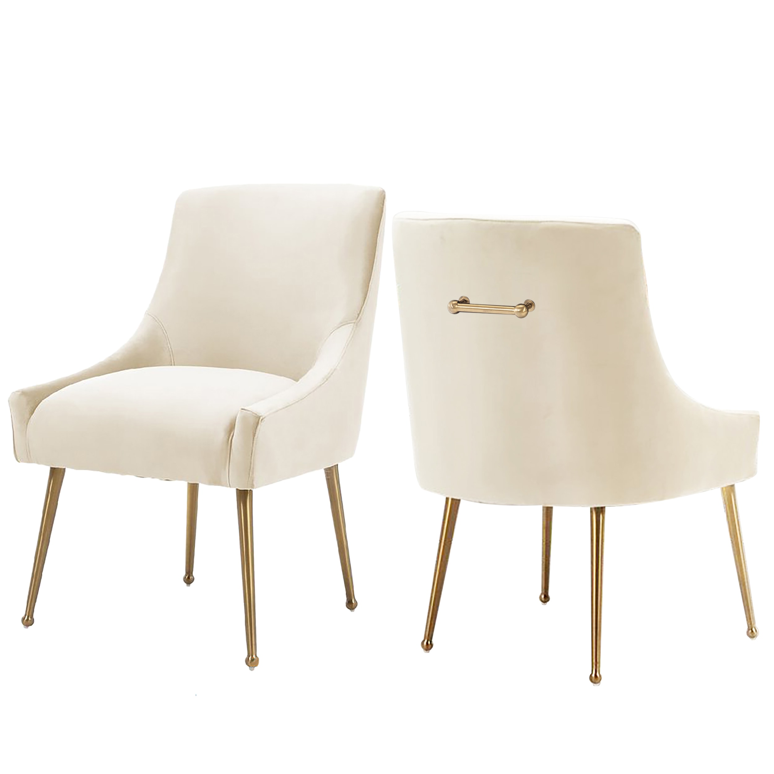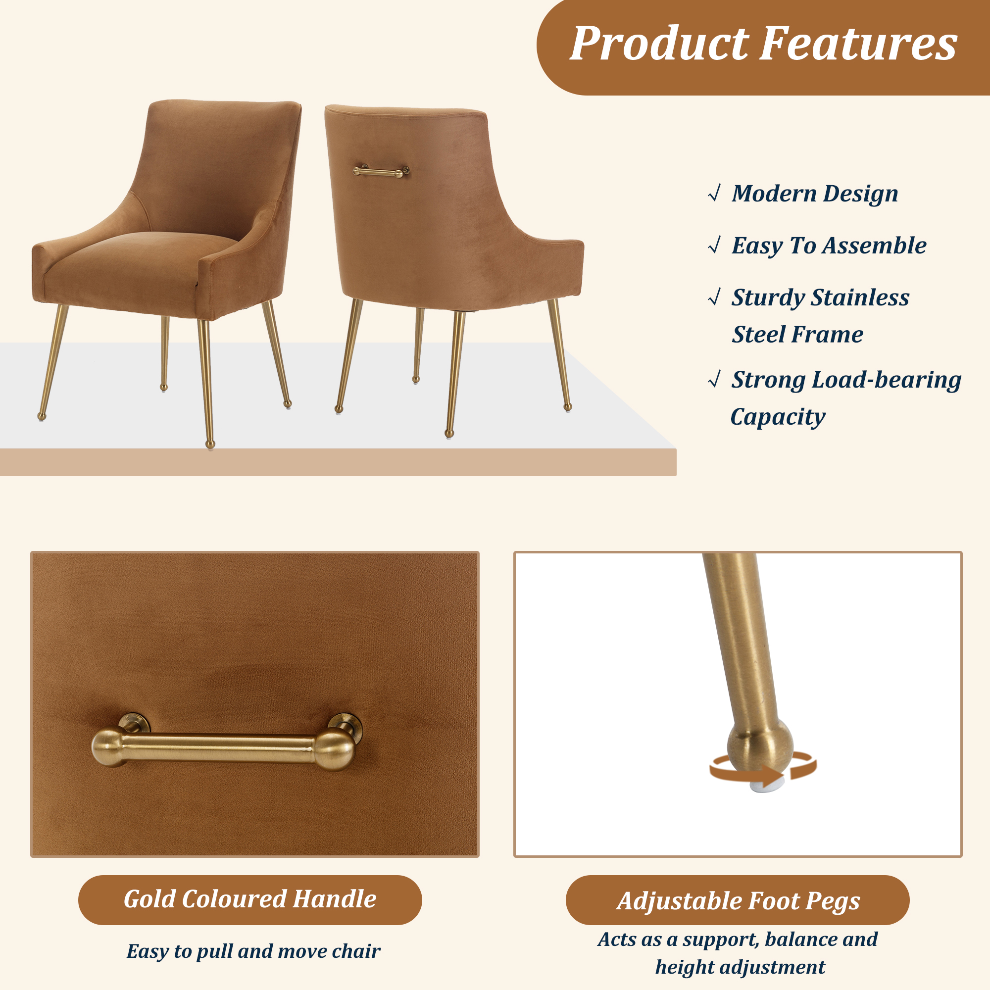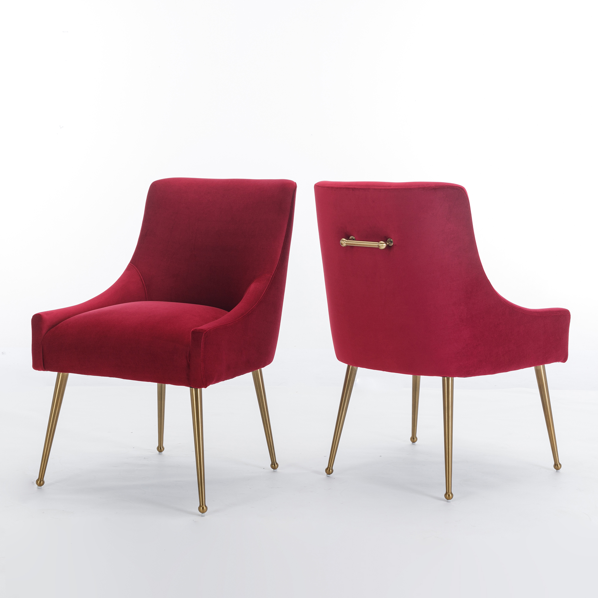 - These chairs are beautifully covered with classic velvet upholstery that adds luster to their comfort. The streamlined chair body, the rounded chair leg bottom, the metallic brass legs of the chair, and the fashionable color combination, every detail add a luxurious style to this piece.