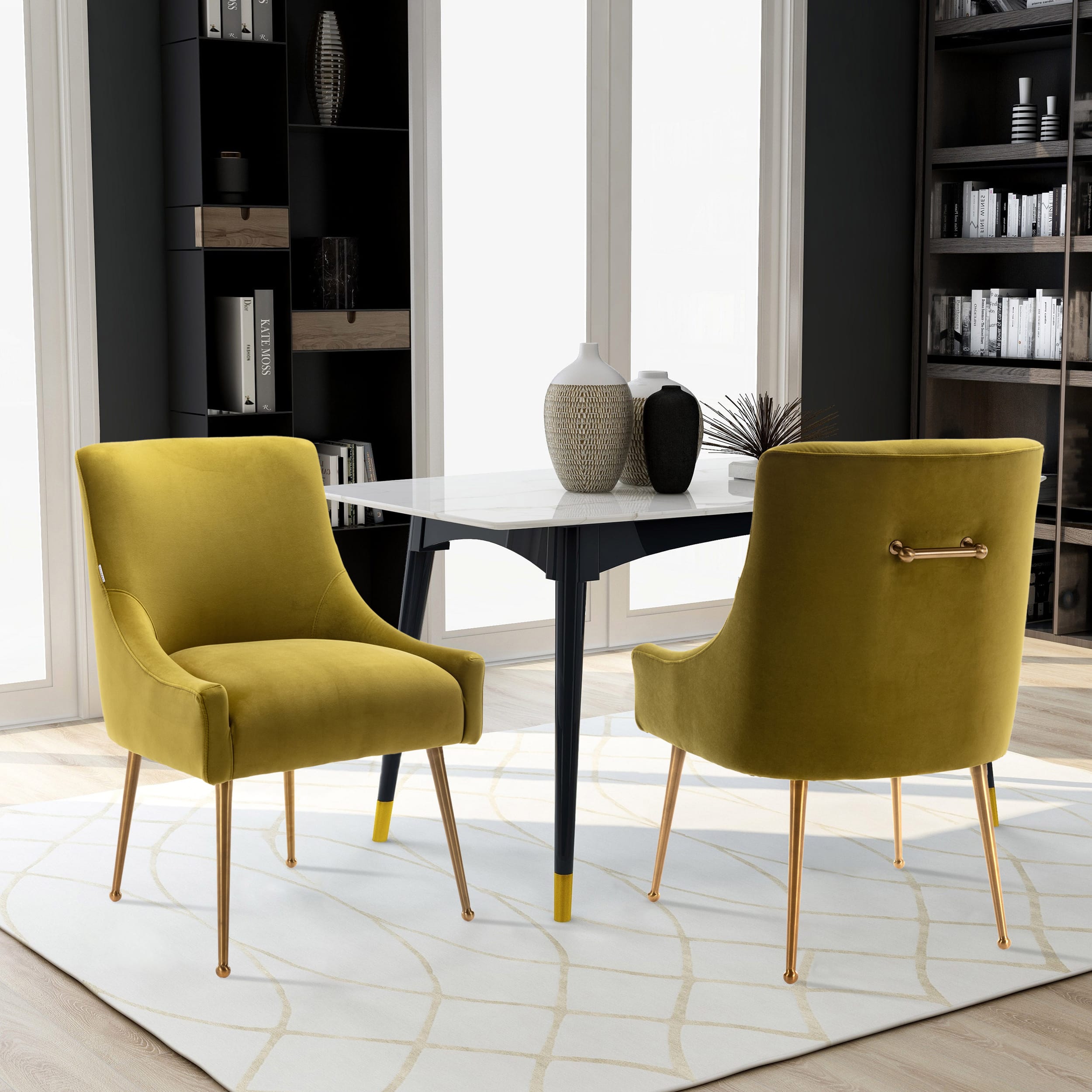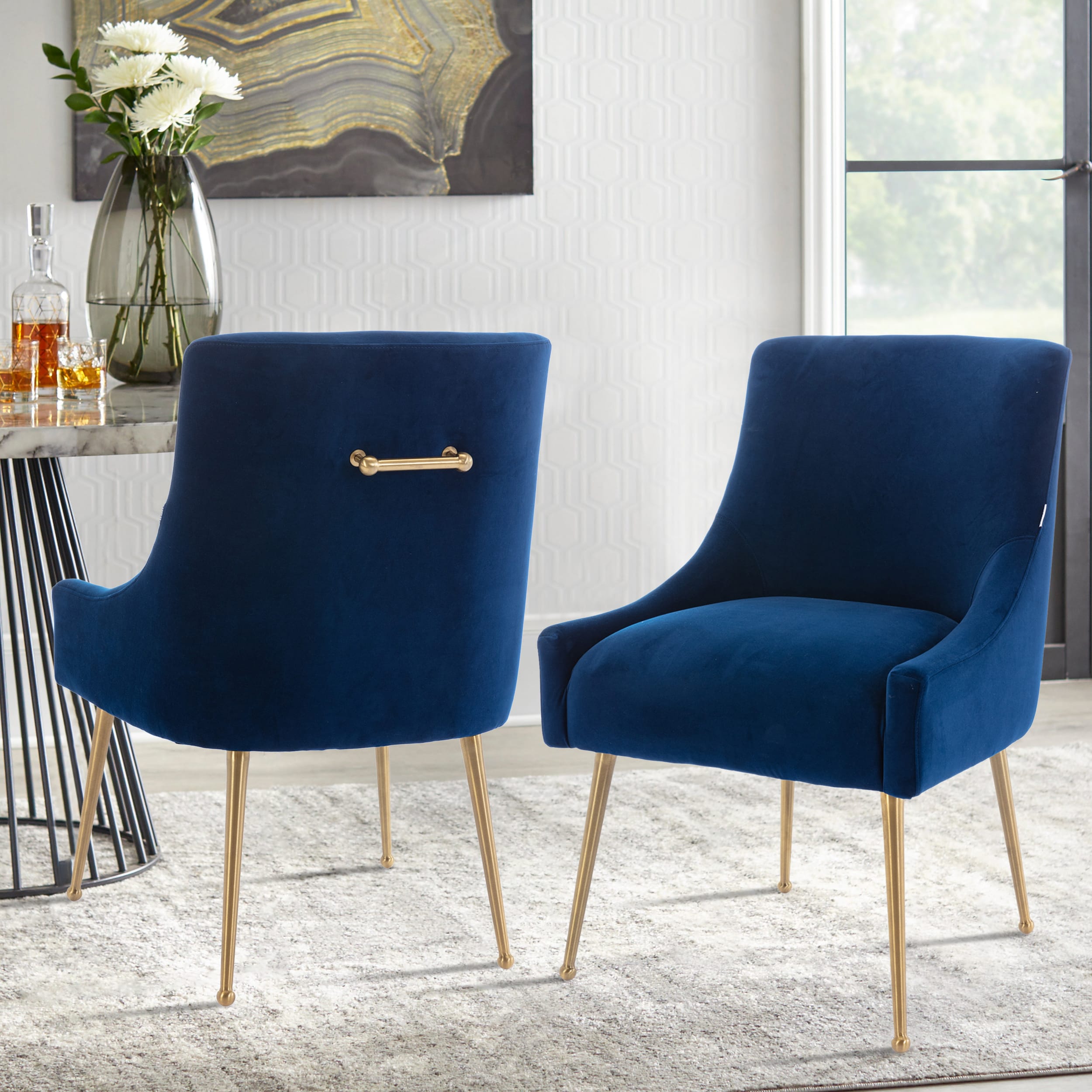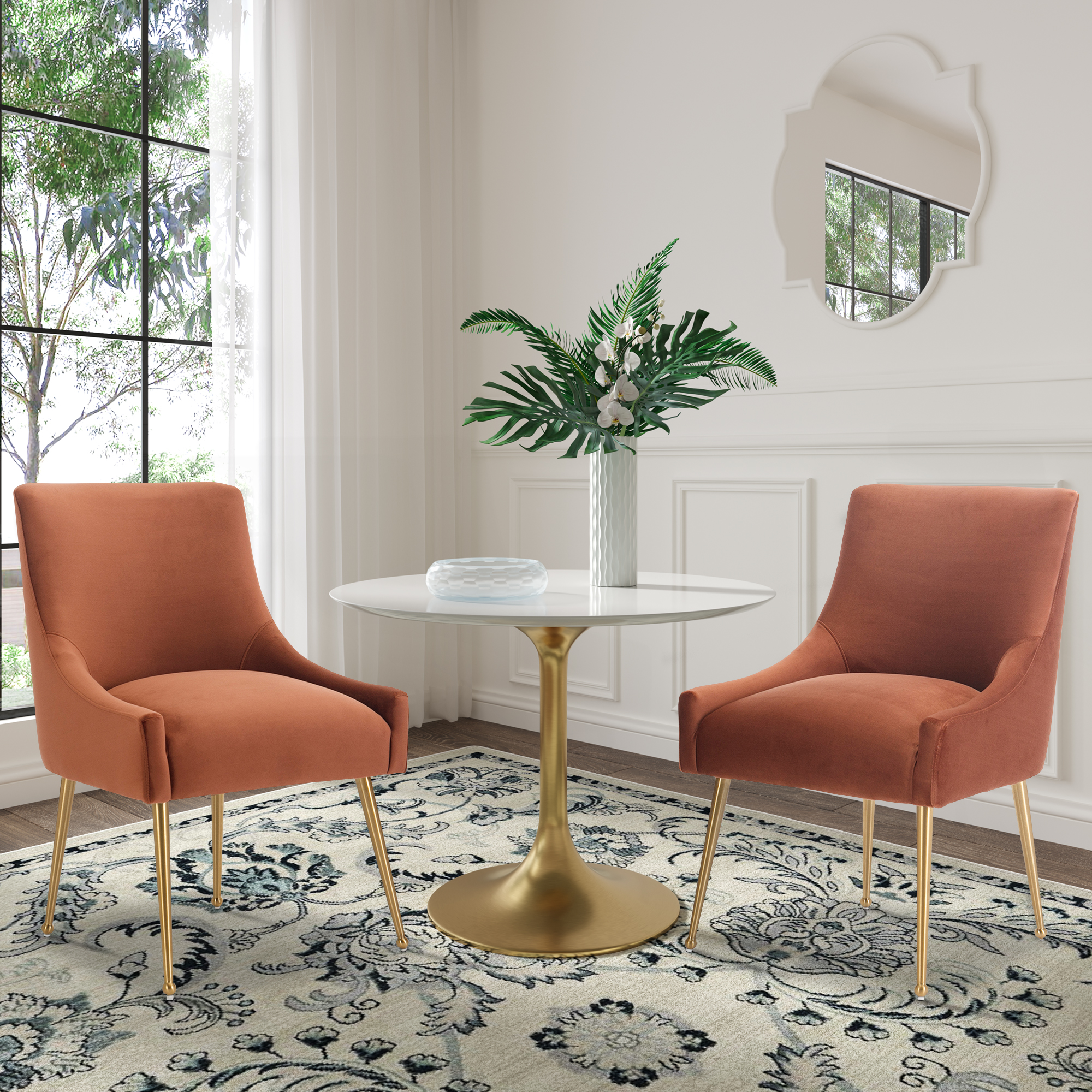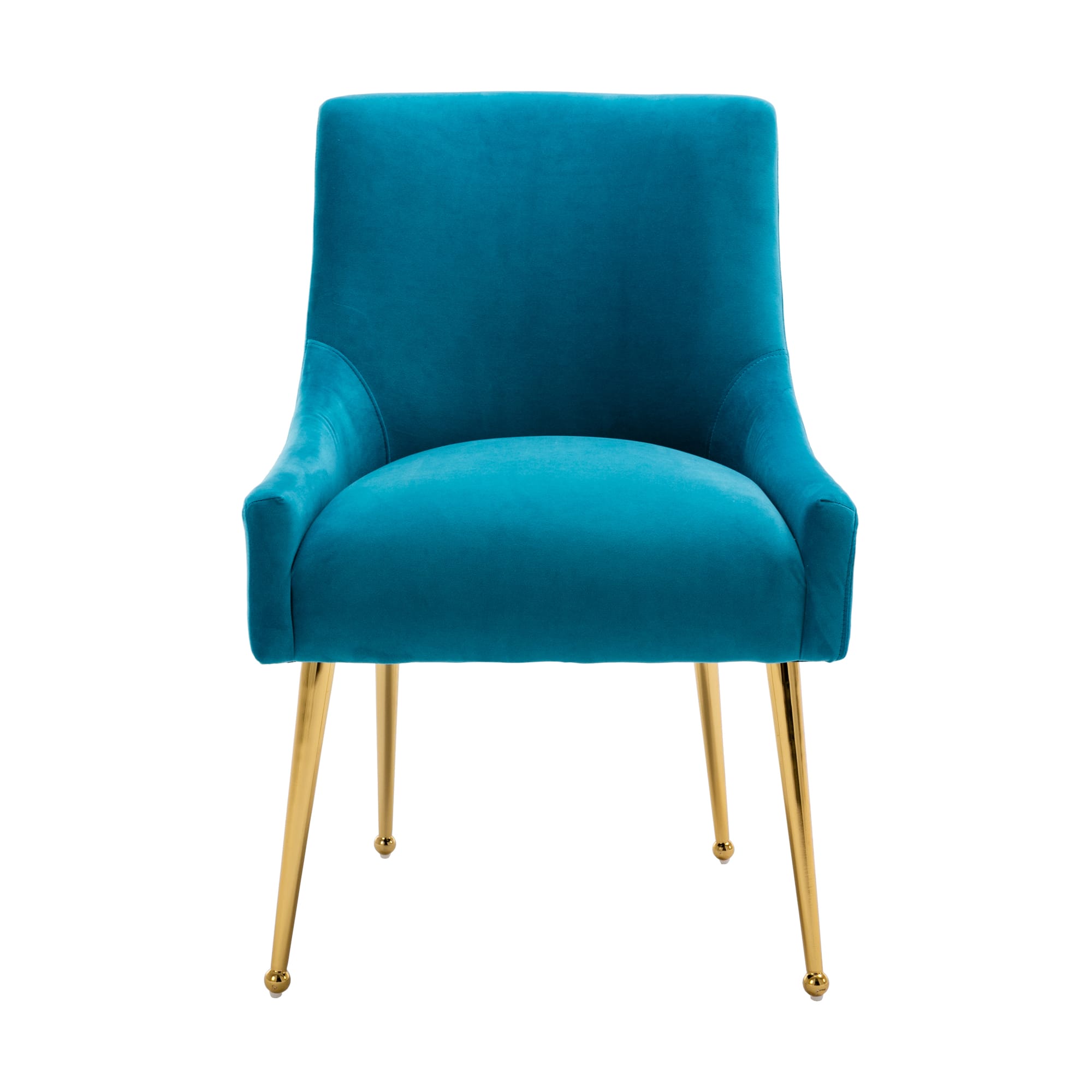 - These chairs are beautifully covered with classic velvet upholstery that adds luster to their comfort. The streamlined chair body, the rounded chair leg bottom, the metallic brass legs of the chair, and the fashionable color combination, every detail add a luxurious style to this piece.