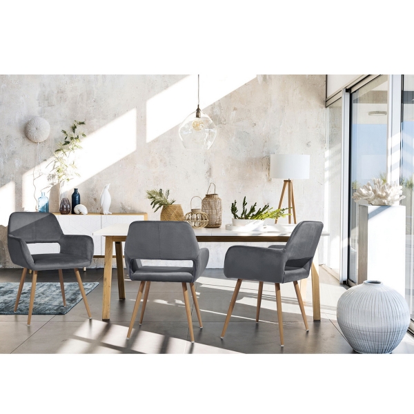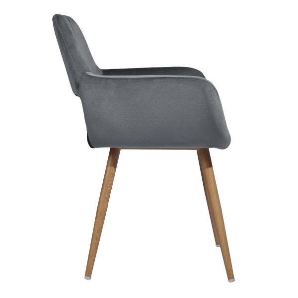 This modern armchair is the perfect piece to pull up around your dining room table, to your home office desk, or to keep in the corner of your living room. It's made with an engineered wood and plastic frame and showcases an open back cutout for retro appeal and flared arms. It's upholstered with foam and fabric, which is available in a wide variety of colors to suit your space. Down below, four splayed metal legs round out the look.