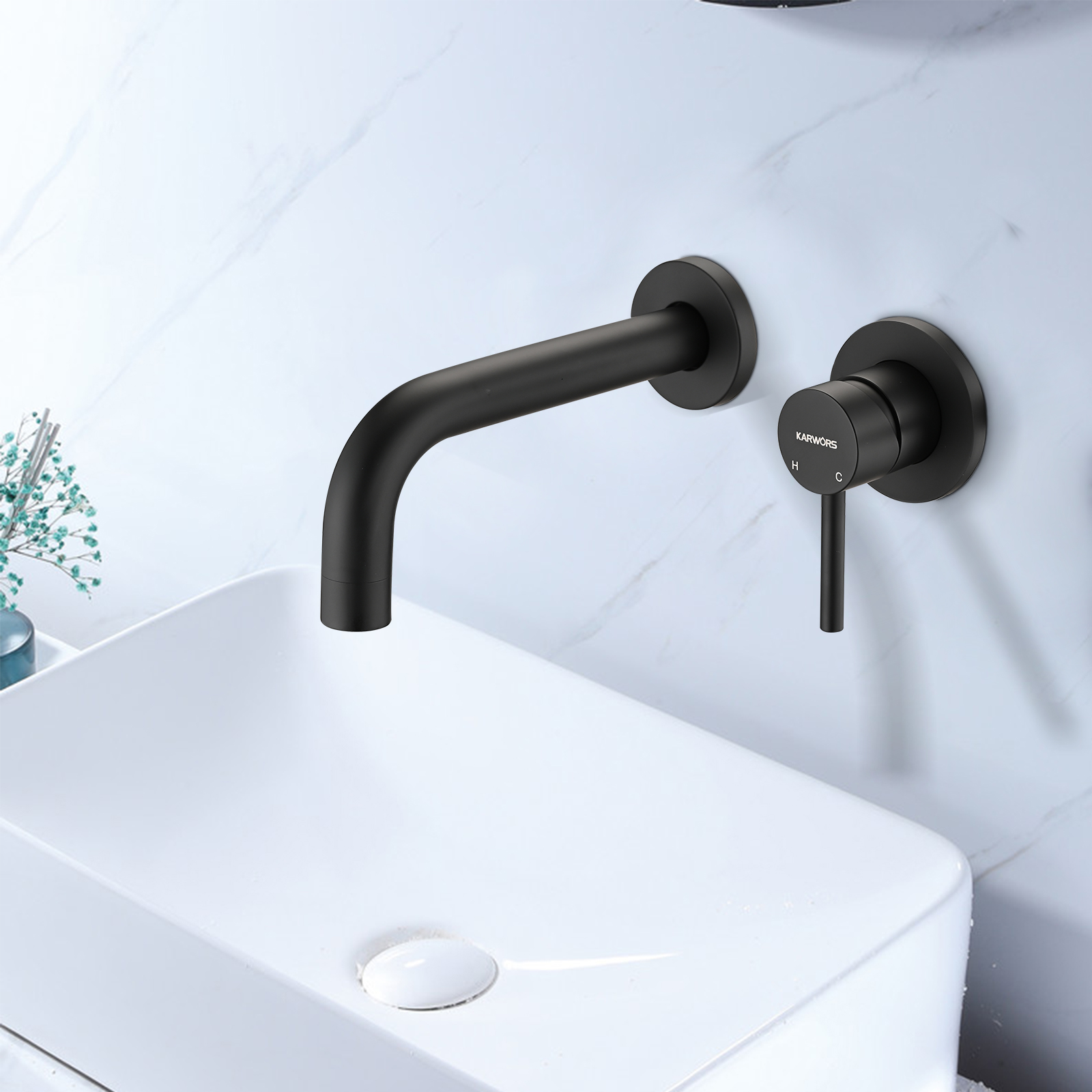 One handles help with temperature and water flow control. A bold Matte black finish enhances the look and fits into your bathroom décor with ease, while the wall-mount installation frees up your countertop or sink. wall-mount bathroom faucet is a durable and stylish upgrade for your bathroom.