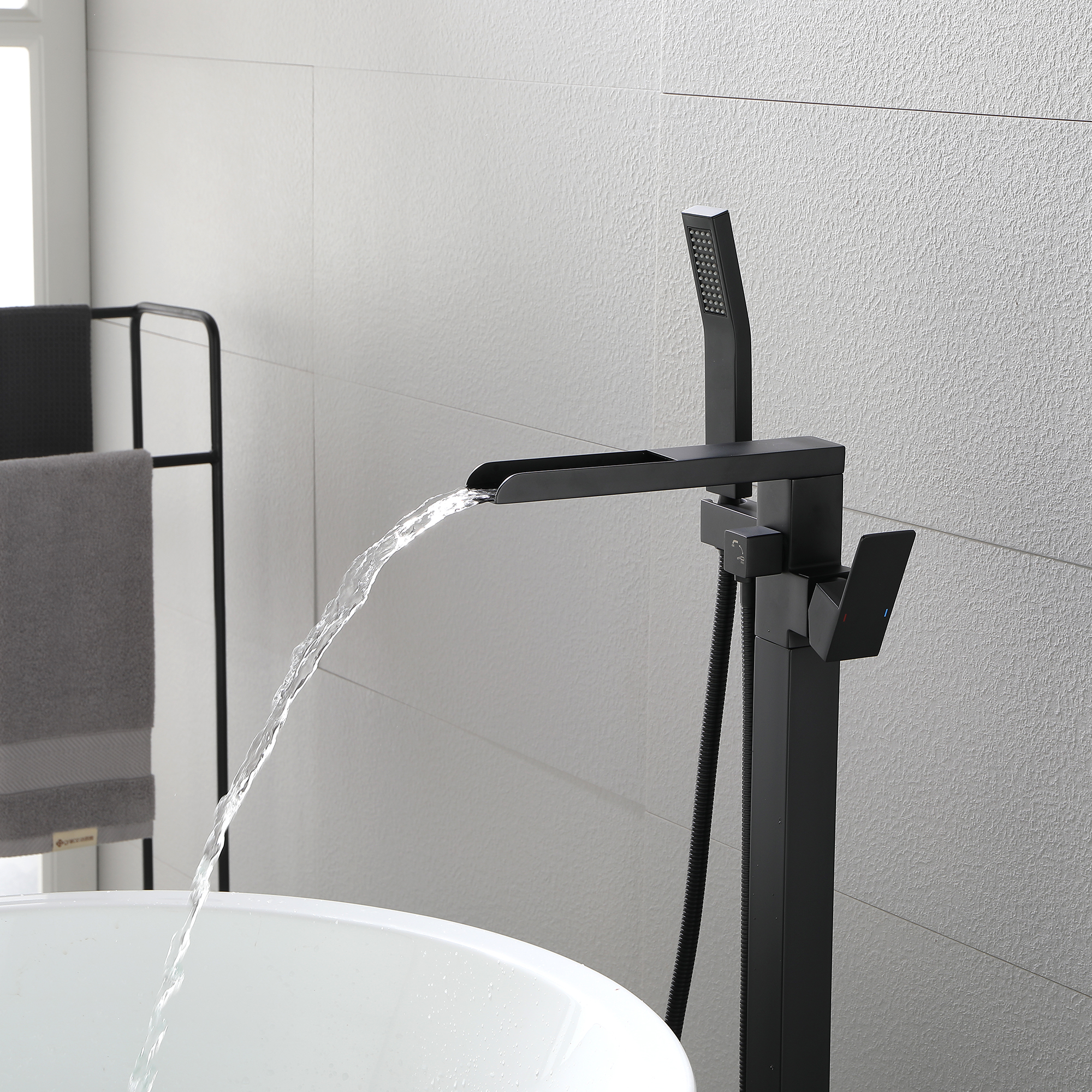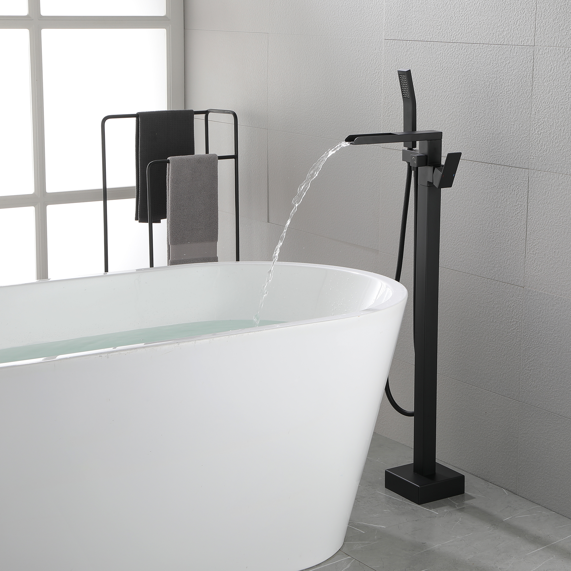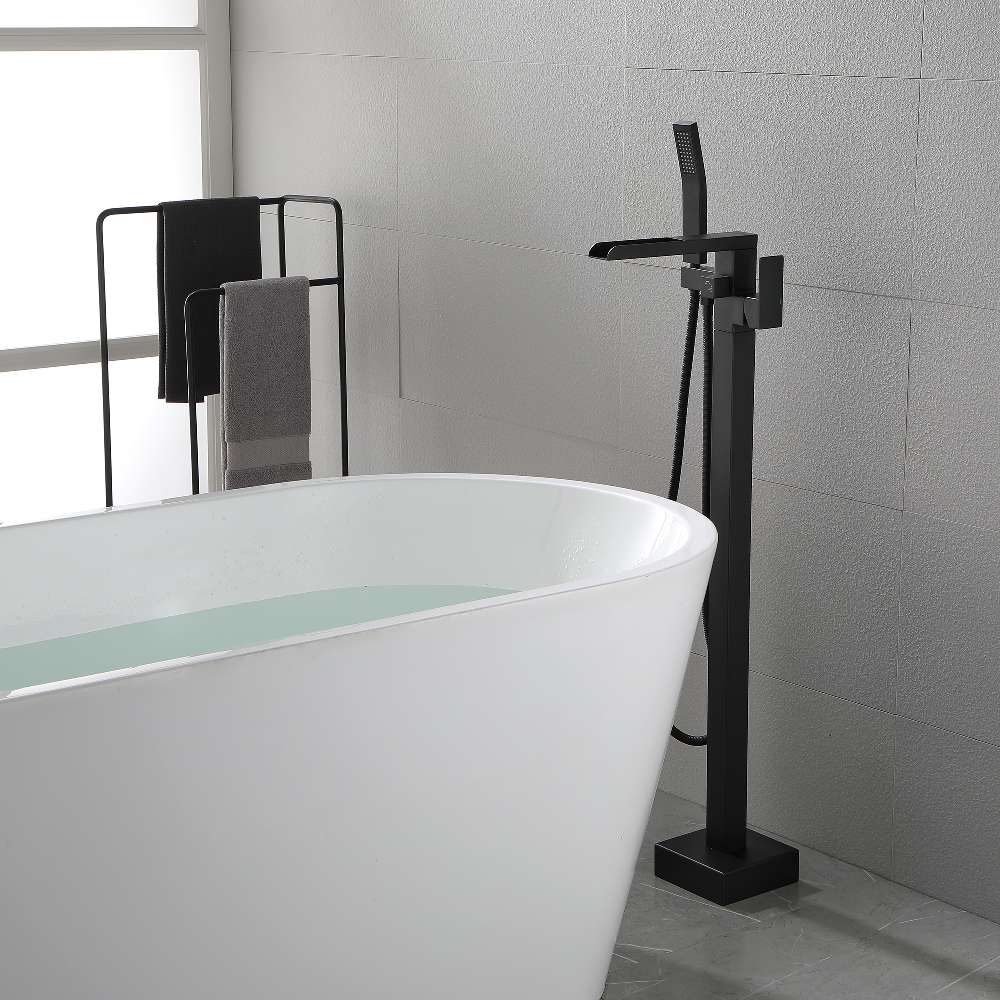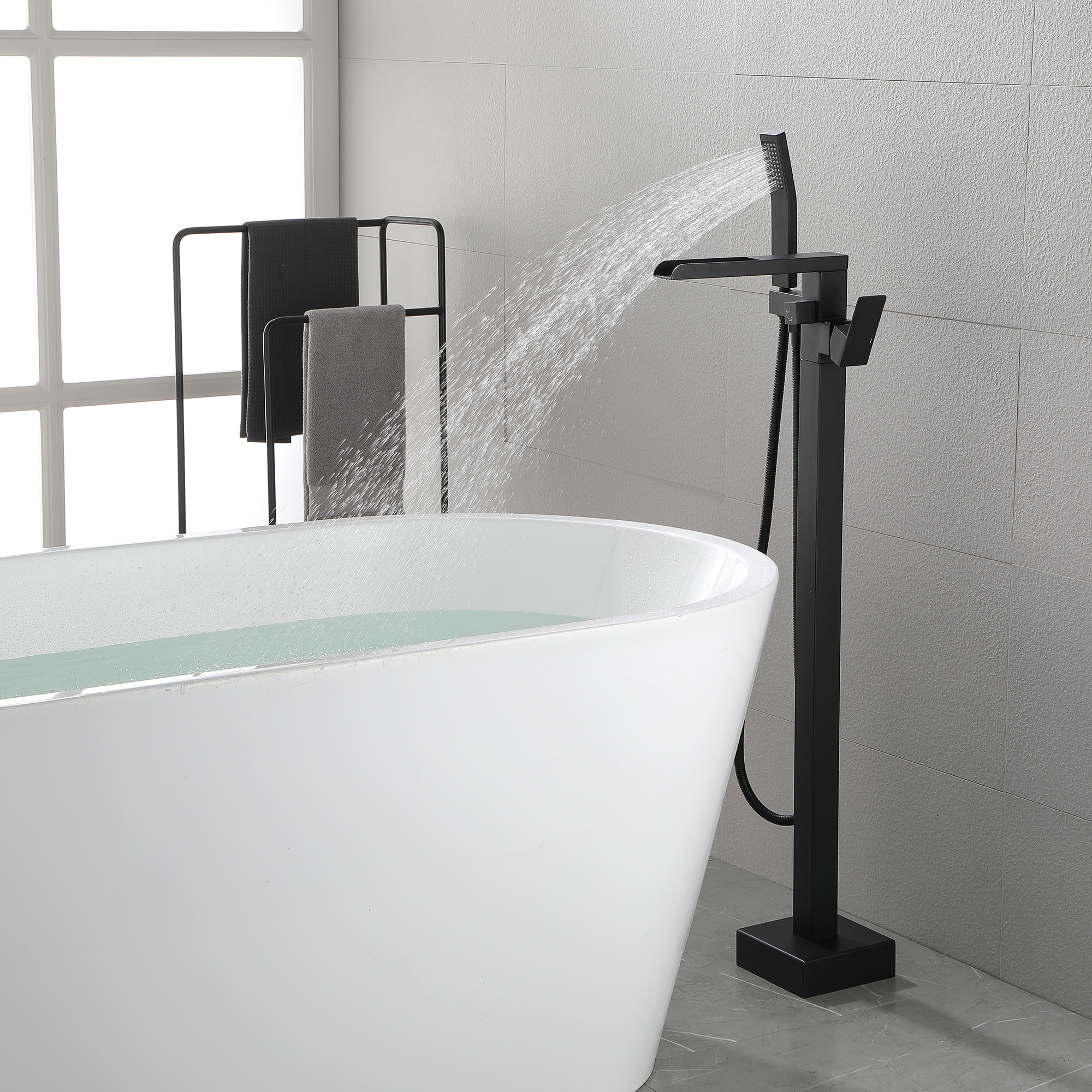 With an elegant waterfall spout design, this floor mounted tub filler faucet comes in premium brass construction with a matte black finish. Pretty and practical, this bathtub faucet pairs well with nearly all modern bathroom designs and brings a fashion statement. With its single handle water control, it provides for minimalist appearance and simple daily use.