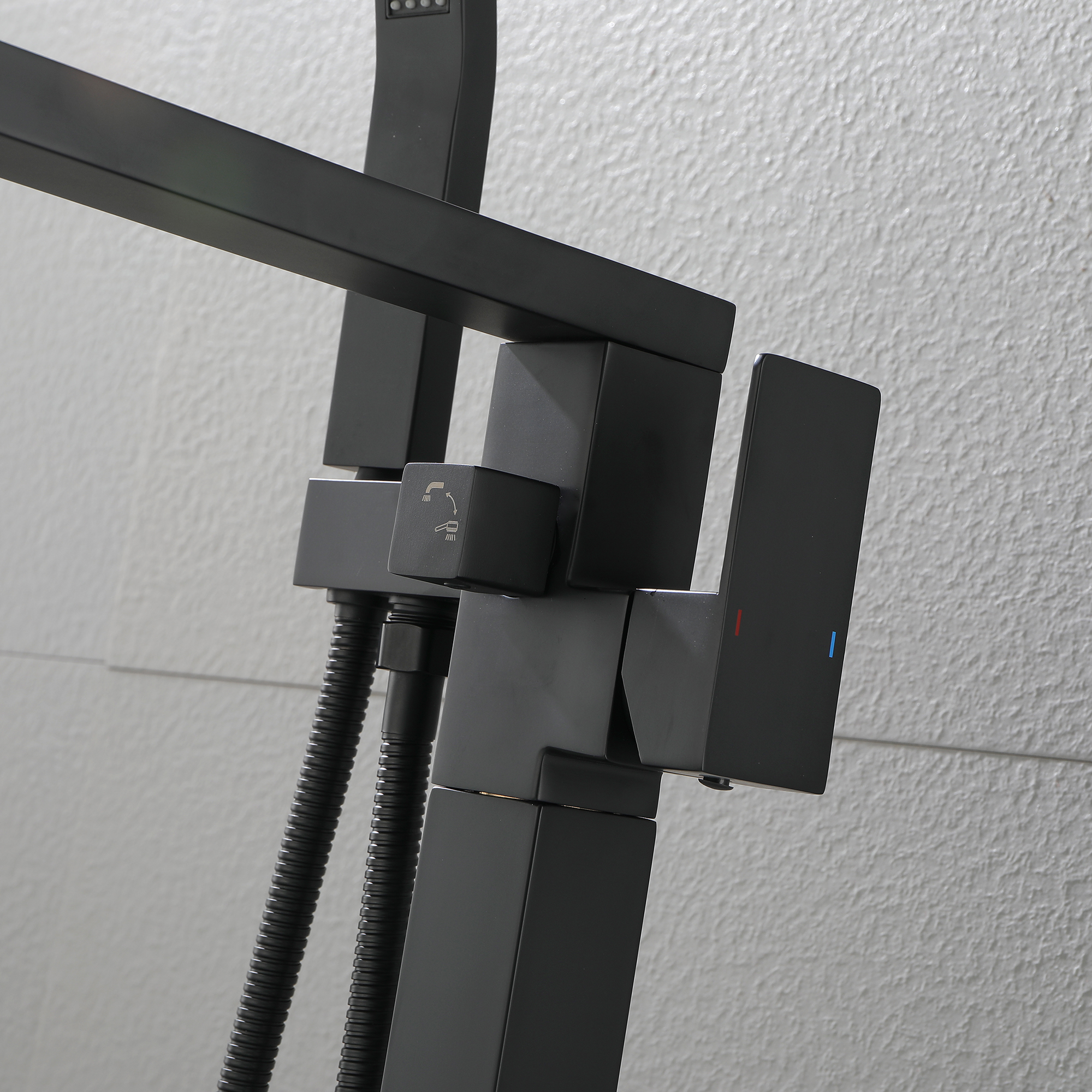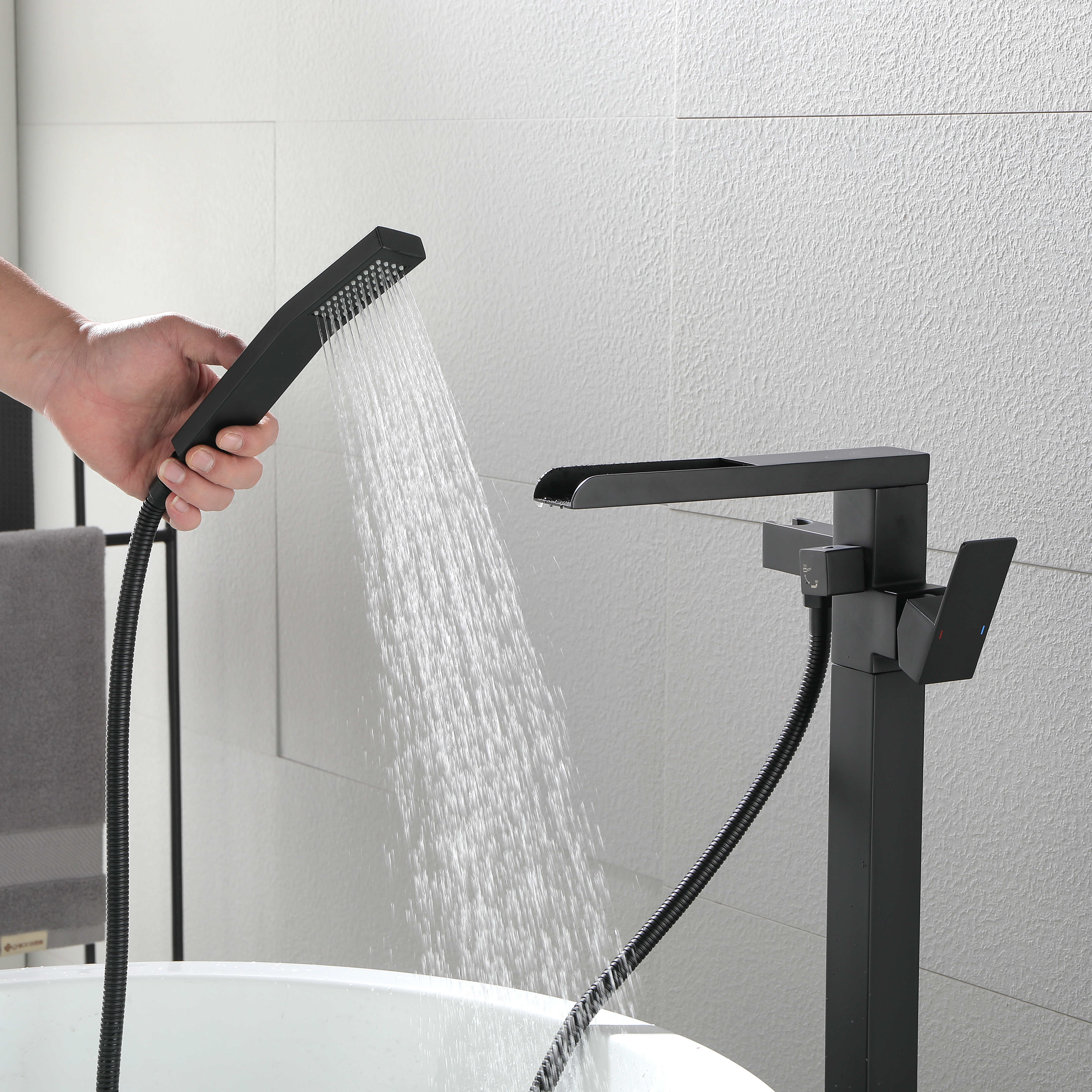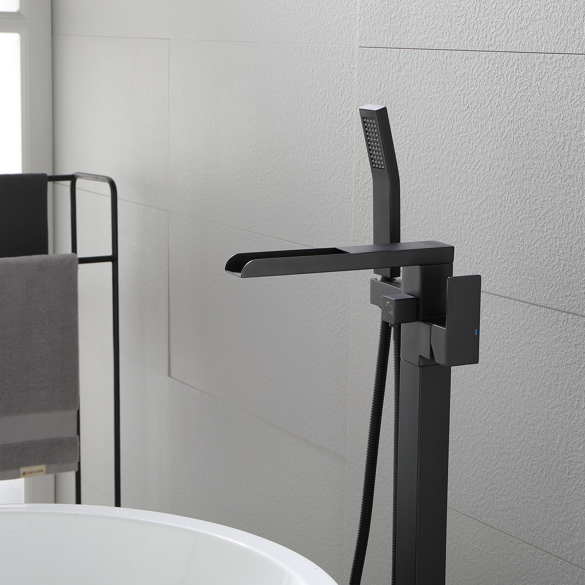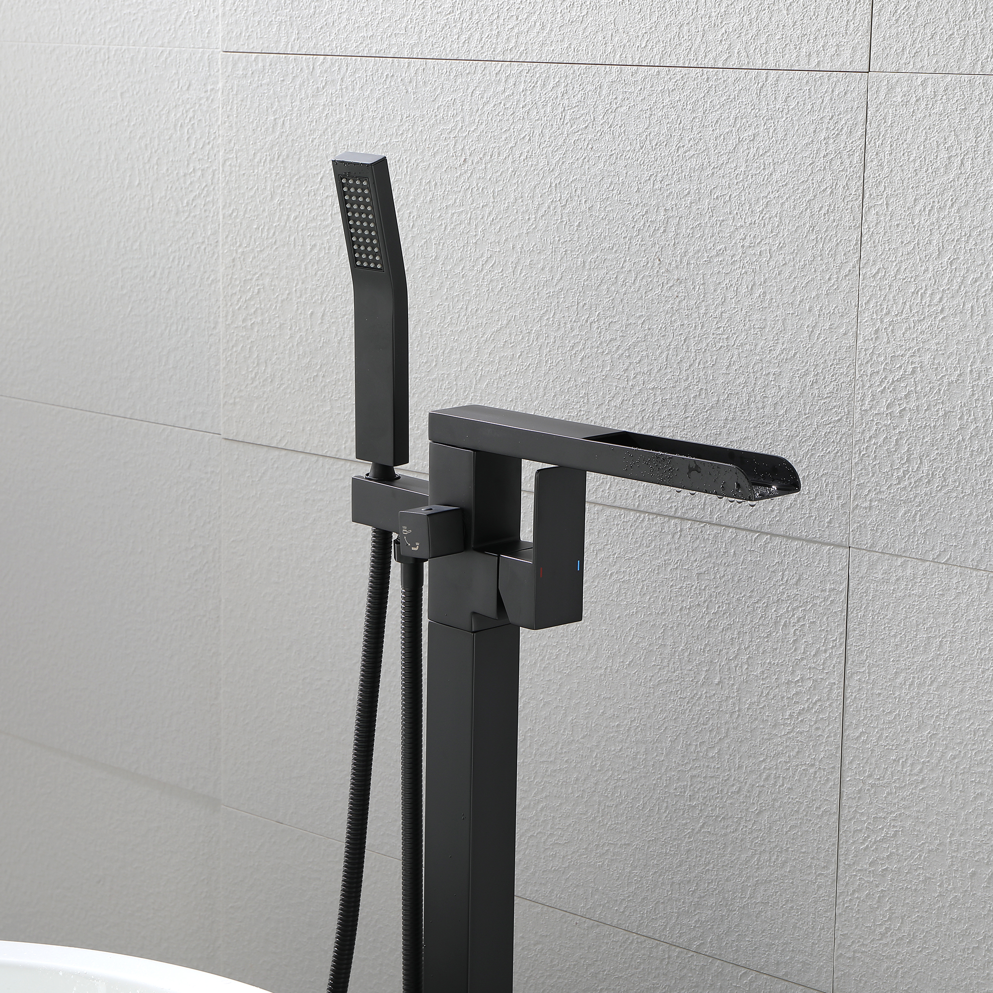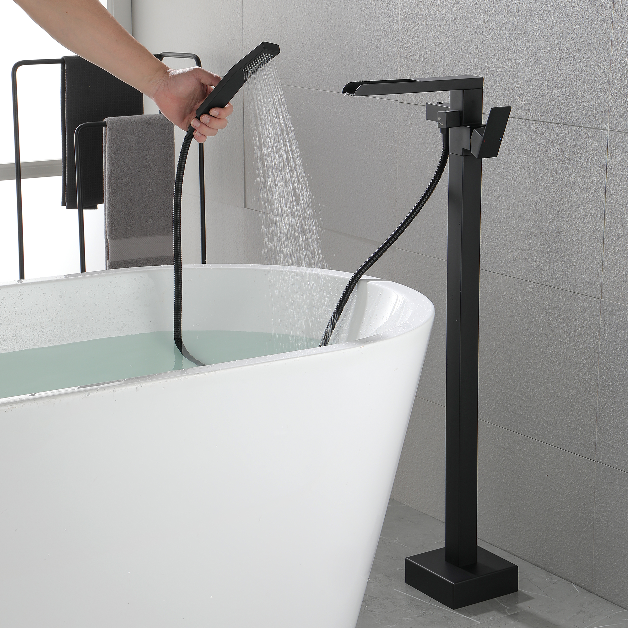 With an elegant waterfall spout design, this floor mounted tub filler faucet comes in premium brass construction with a matte black finish. Pretty and practical, this bathtub faucet pairs well with nearly all modern bathroom designs and brings a fashion statement. With its single handle water control, it provides for minimalist appearance and simple daily use.