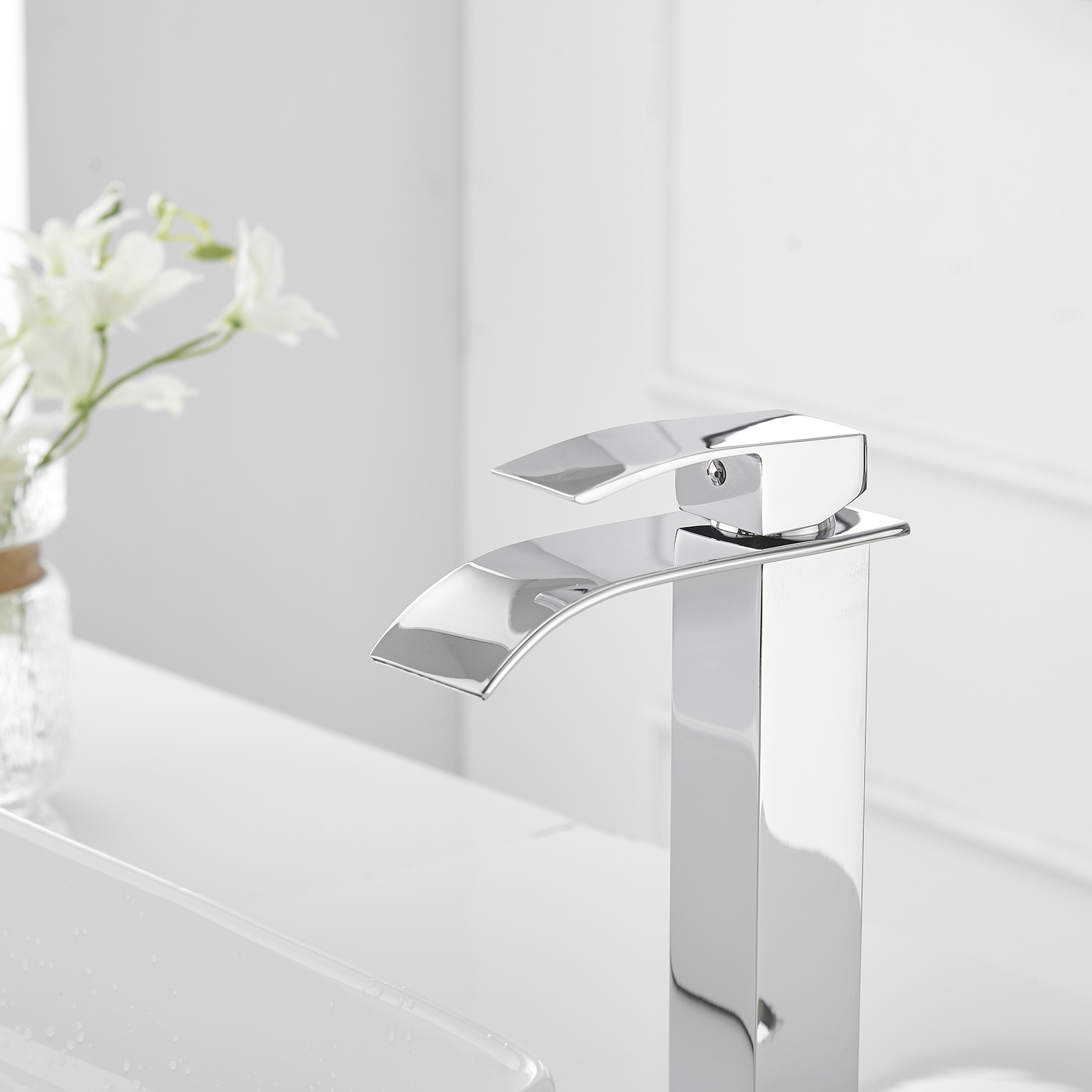 - Waterfall spout: the bathroom faucet provides a clear and steady laminar stream, that provides a beautiful water presentation, a single lever design for effortless flow and temperature control