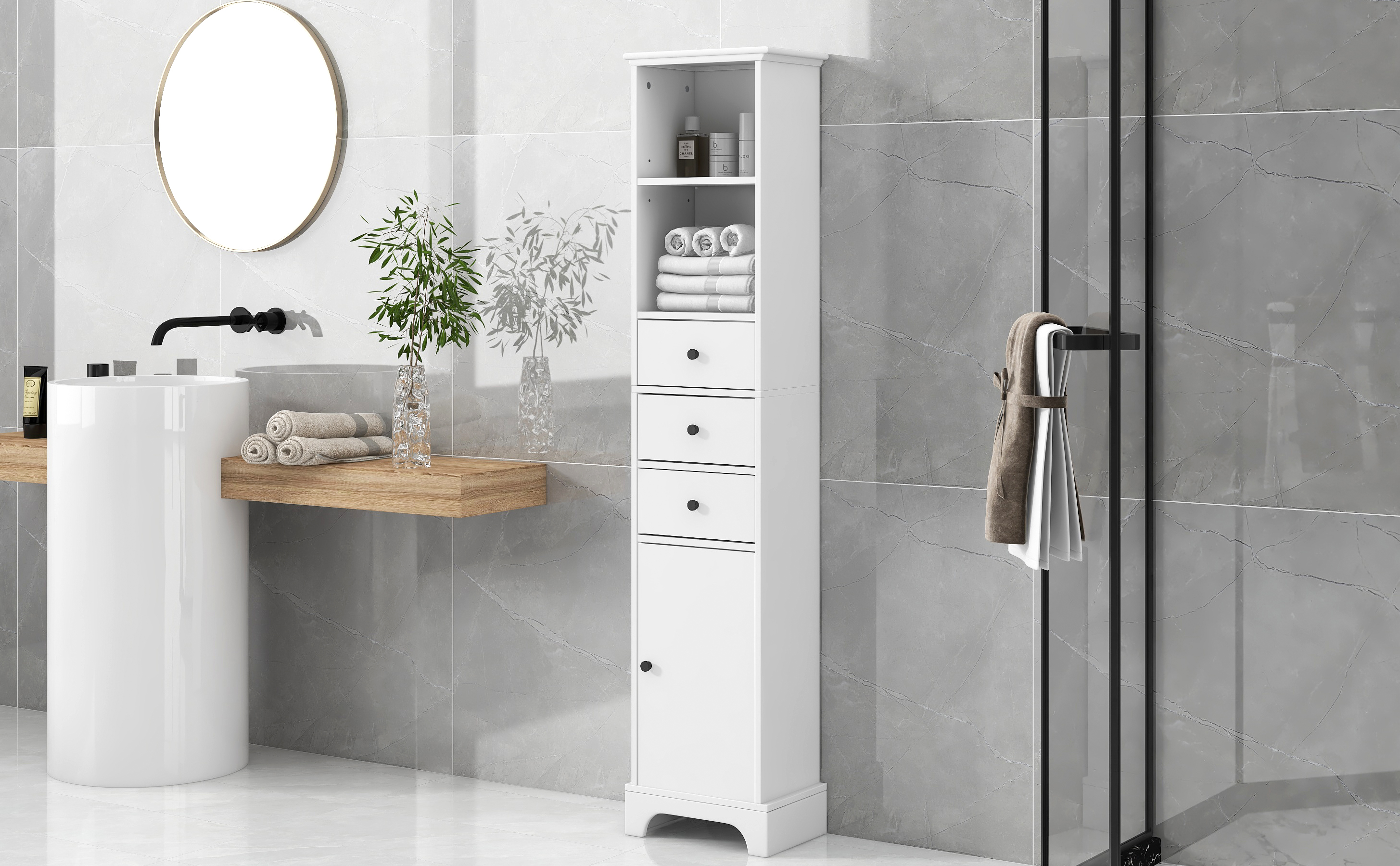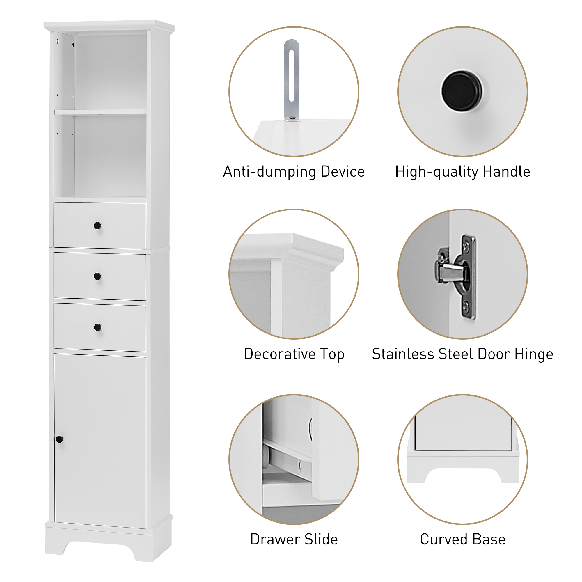 White Tall Bathroom Cabinet, Freestanding Storage Cabinet with 3 Drawers and Adjustable Shelf