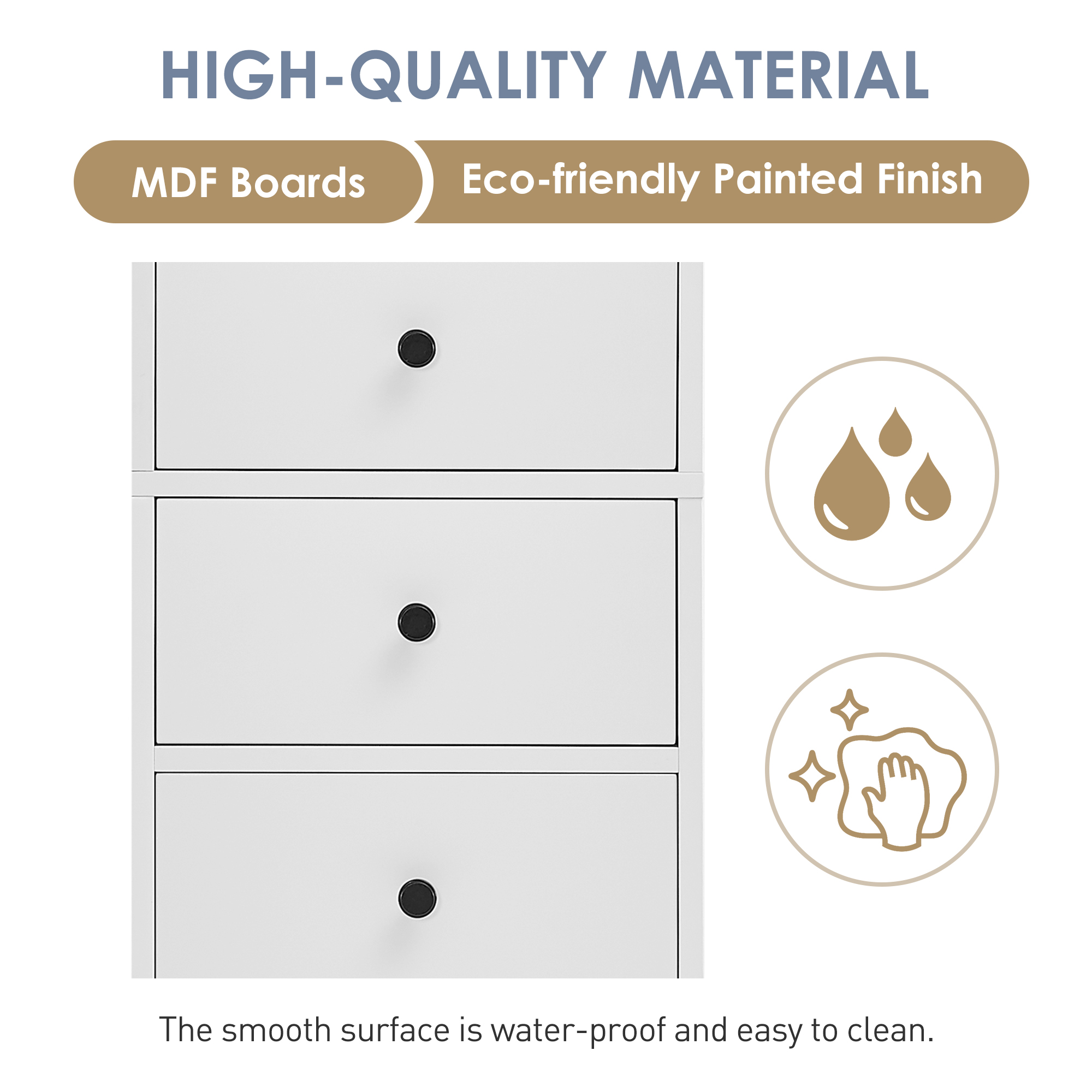 The cabinet is made of high-quality MDF boards with a painted finish. Thus, the surface is water-proof, smooth, and easy to clean. Metal black knobs are convenient to open or close the drawers and door.