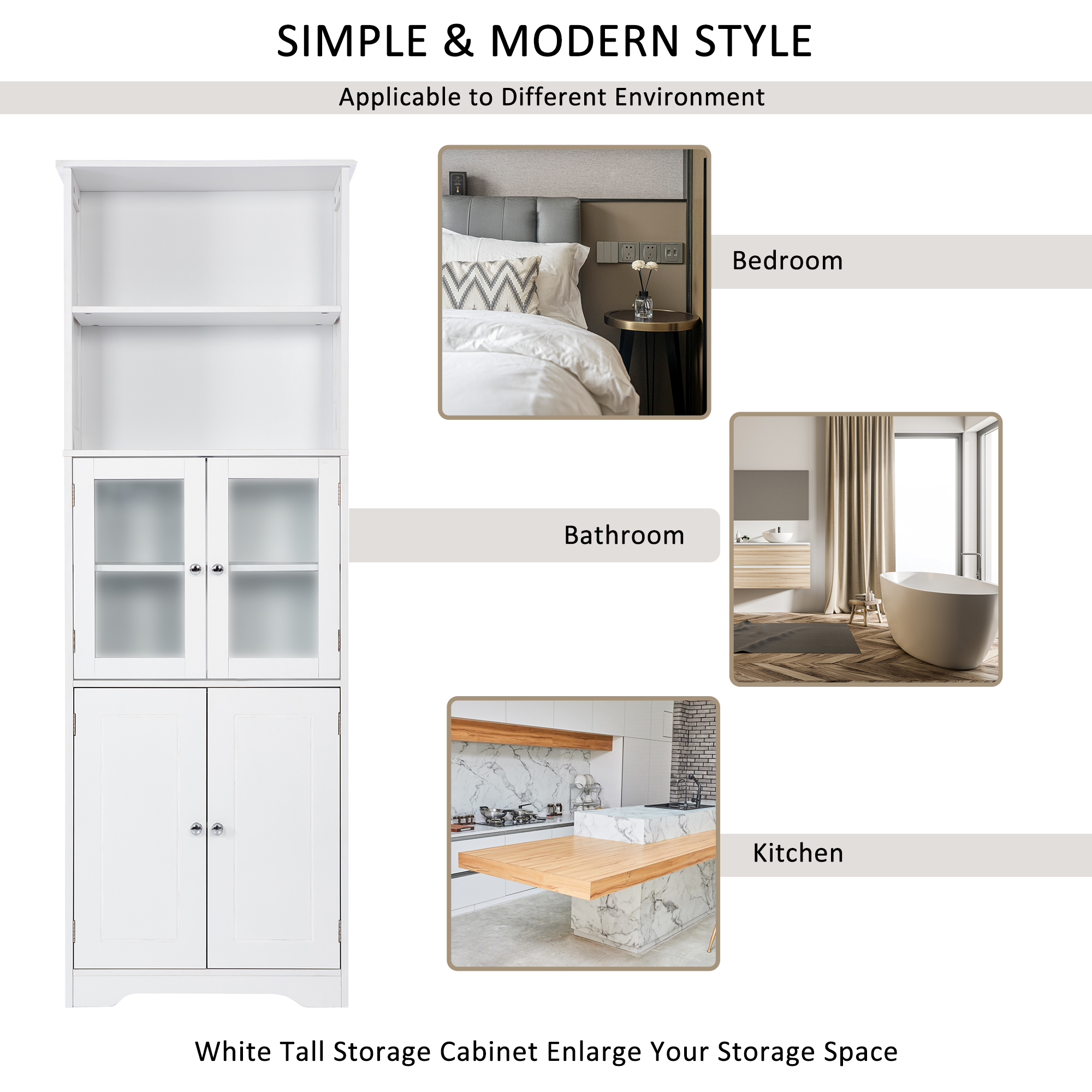 The design of this storage cabinet is simple and elegant, with a focus on functionality. The bottom of this cabinet has the extra design of arc and grooves on cabinet doors, these details reveal graceful temperament. It is suitable for various environments such as bathrooms, kitchens, dining rooms, living rooms, bedrooms, or studies.