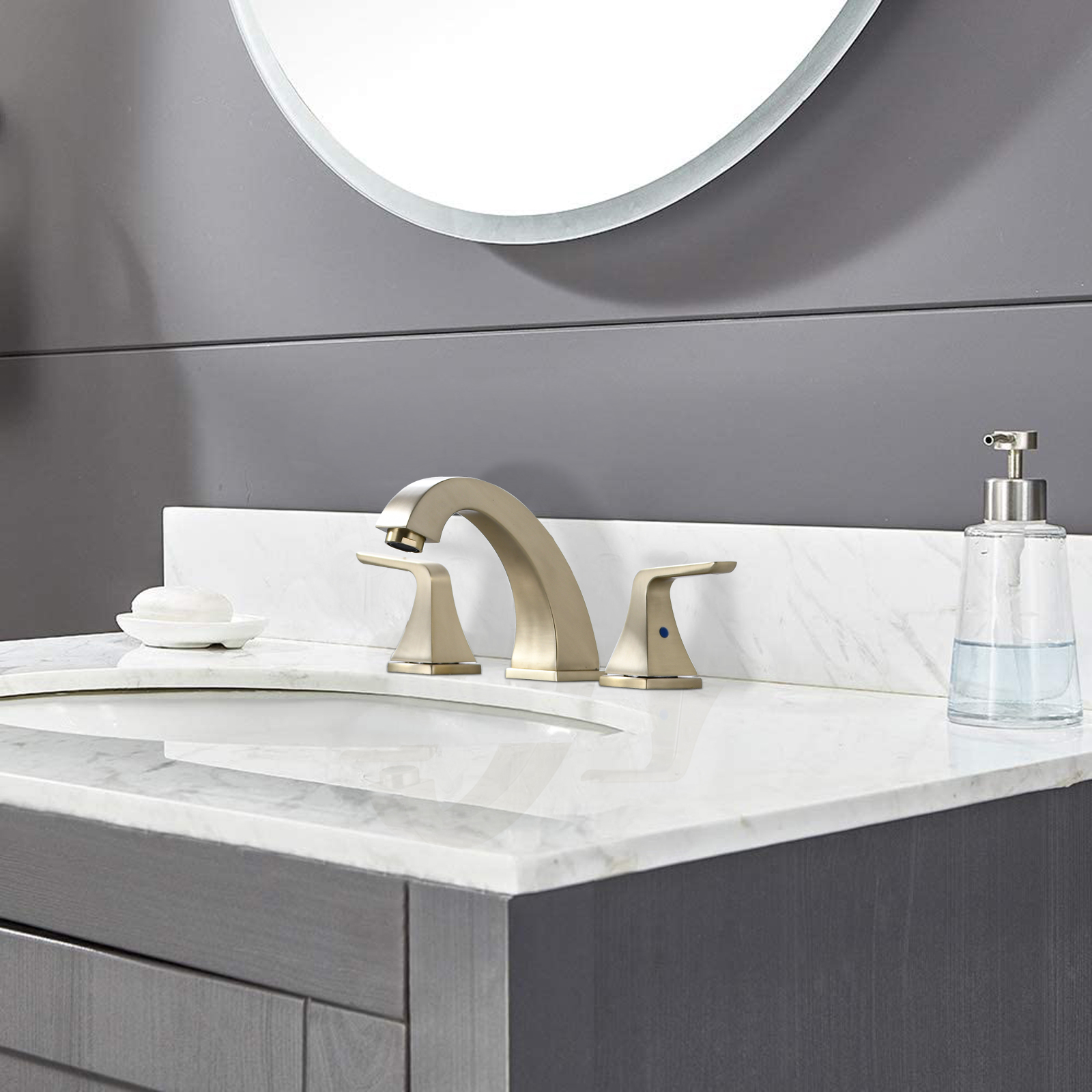 Durable Brushed Golden Finish: resists tarnish and corrosion from daily use and provides a pretty look.Included 9/16" IP female compression thread water supply lines. Max countertop thickness: 1.18".Simple, elegant lines, with traditional decoration. Metal handle, easy operation, and accurate temperature control.8" Widespread bathroom sink faucet with two-handle lever design for ease of use.Pop-up drain and water line are included.Features: