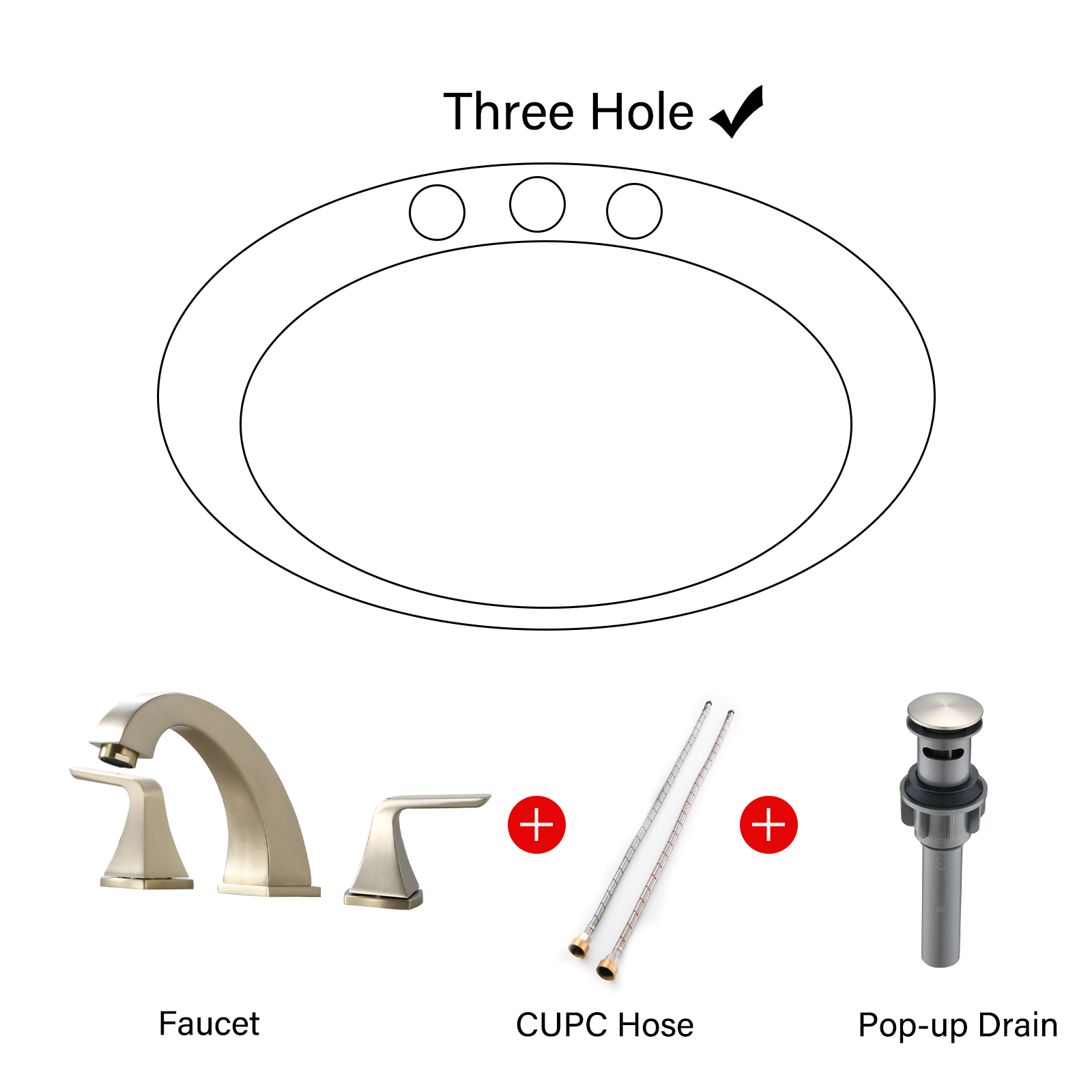 Installation Type: Widespread faucetFinish: Brushed GoldenMaterial: Stainless SteelHandle Included: YesNumber of Handles: 2 HandlesDeck Plate Included: NoDrain Assembly Included: YesDrain Type: Pop UpValve Included: NoAerator Included: YesHot/Cold Indicators Included: YesResistance Type: Spot Resistant FinishNumber of Installation Holes: 3Weights & Dimensions: