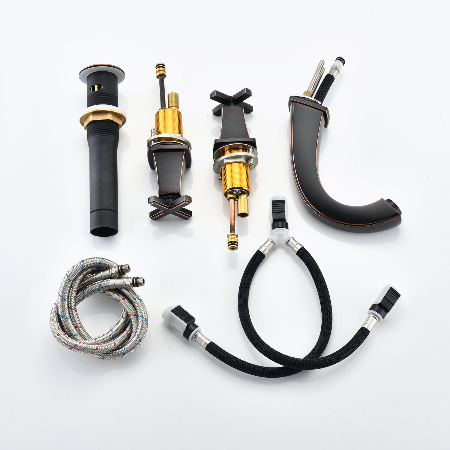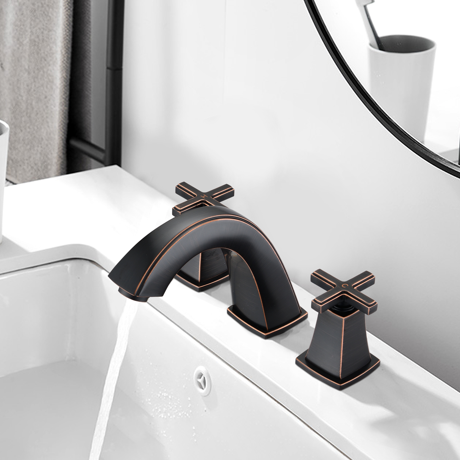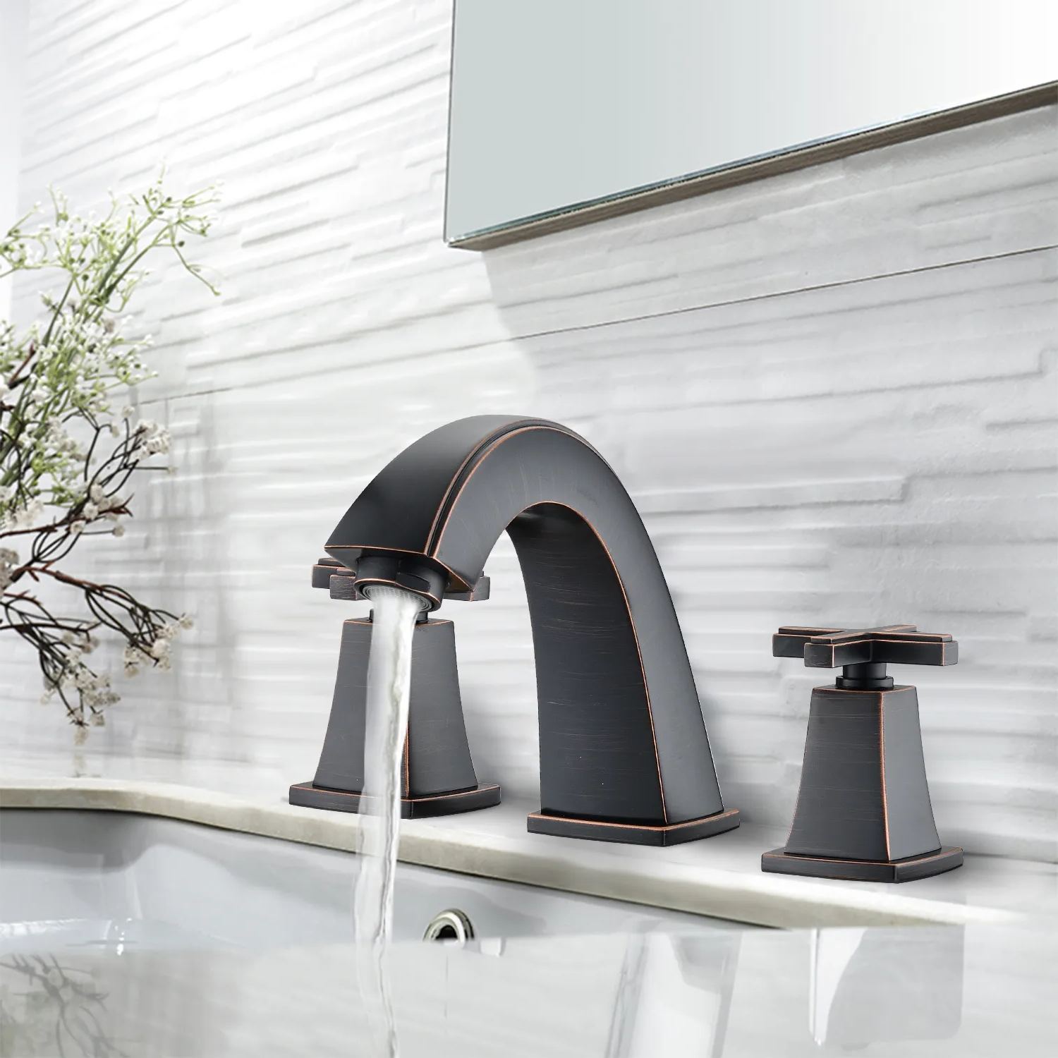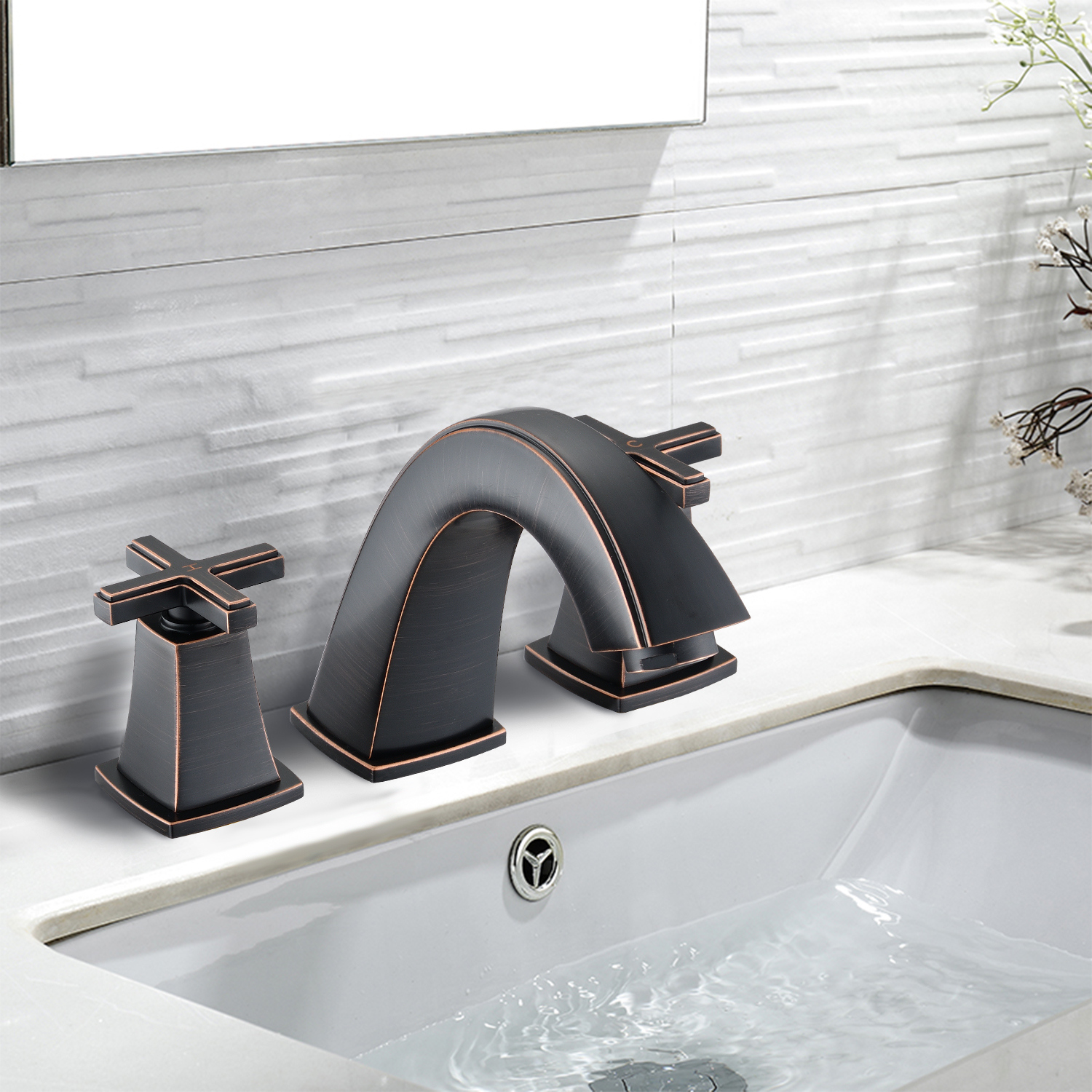 Installation Type: Widespread faucetNumber of Installation Holes: 3Swivel Spout: NoColor/Finish: Matte black, Brushed gold, Oil-Rubbed BronzePrimary Material: Brass, ZincResistance Type: Rust & Corrosion Resistant, Scratch Resistant, Tarnish Resistant, Stain ResistantFlow rate (gallons per minute): 1.5Number of Handles: 2 Handle Type: CrossHot/Cold Indicators: YesDeck Plate Included: NoDrain Assembly Included: YesAerator Included: YesSupply Lines Included: YesProduct Details
