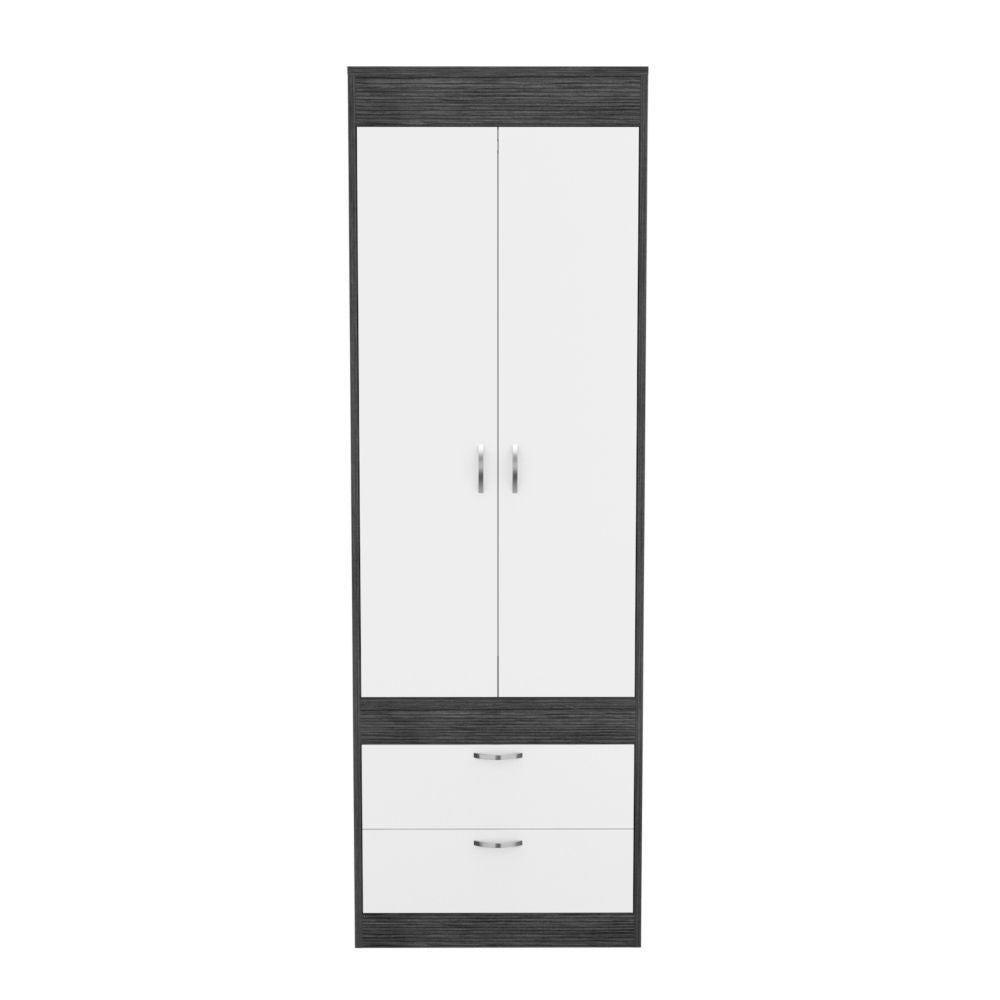 This beautiful closet is for you. Its ample space allows the storage of many supplements, it has a bar that holds the clothes to allow the storage of other accessories under this bar. In the two drawers, we can store underwear or other accessories that we need to keep organized and well stored. Its modern design allows it to adapt to any style you want to have in your home.Set includes: One (1) armoireDimensions: 70.4 inches high x 23.3 inches wide x 18.9 inches deepFinish Color: Smokey Oak and WhiteMaterials: Manufactured woodNumber of drawers: 2-DrawerNumber of shelves: 1-ShelfNumber of doors: 2-DoorDouble door cabinet (Interior space: 47.8" H x 20.8" W)Two bottom drawers (Each front: 6.9" H x 21.9" W)Hanging rod included