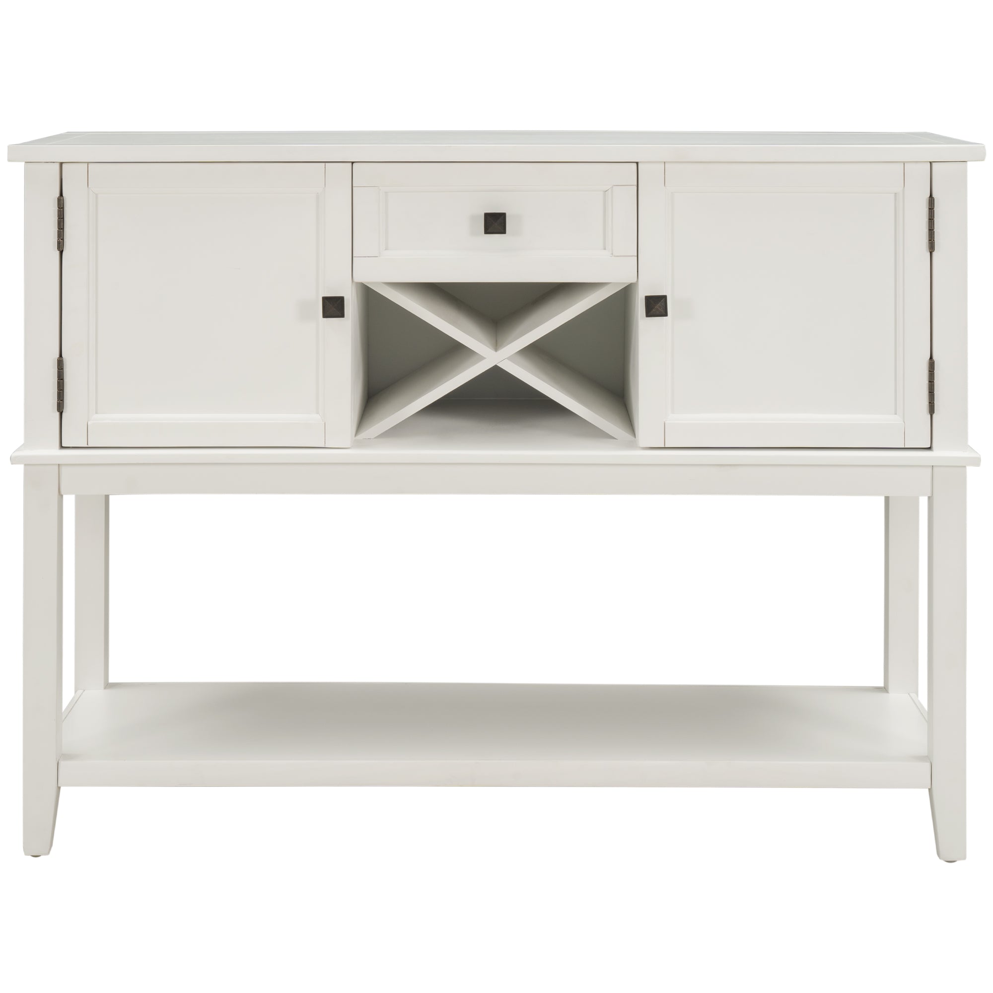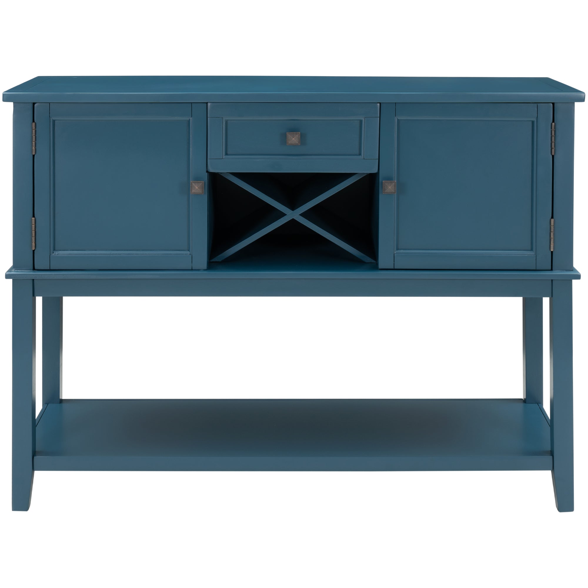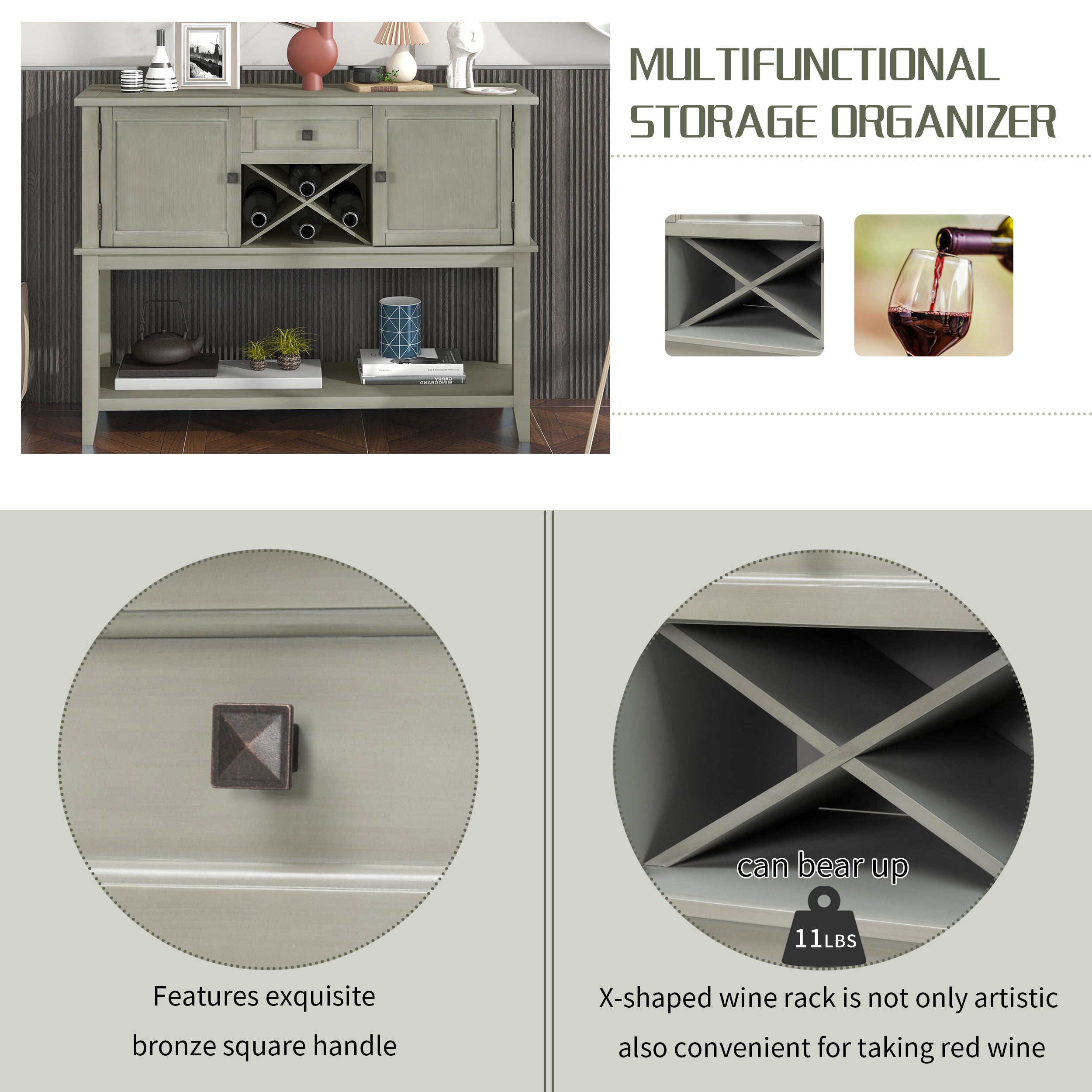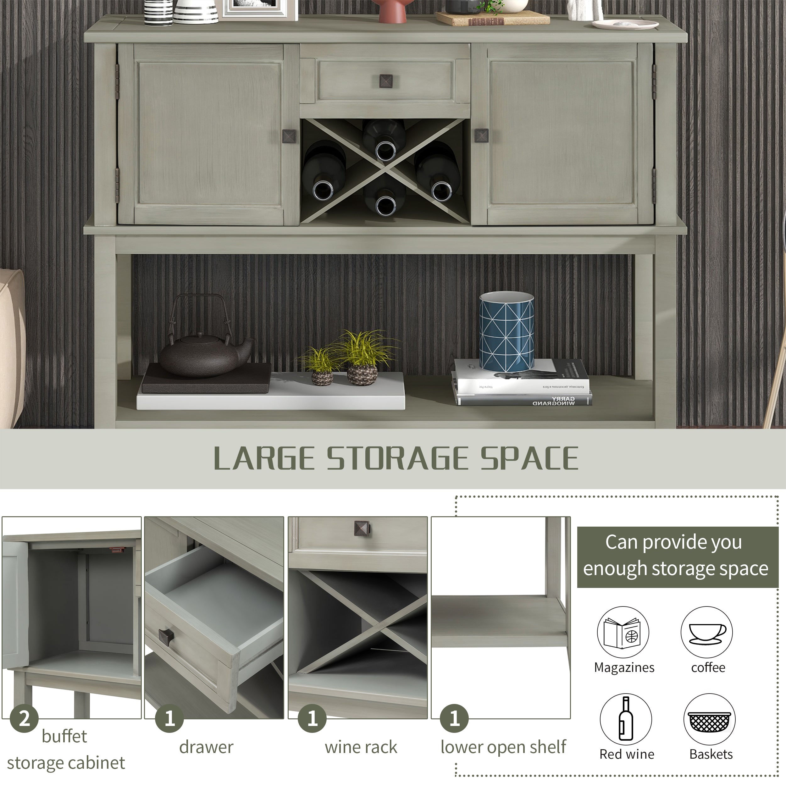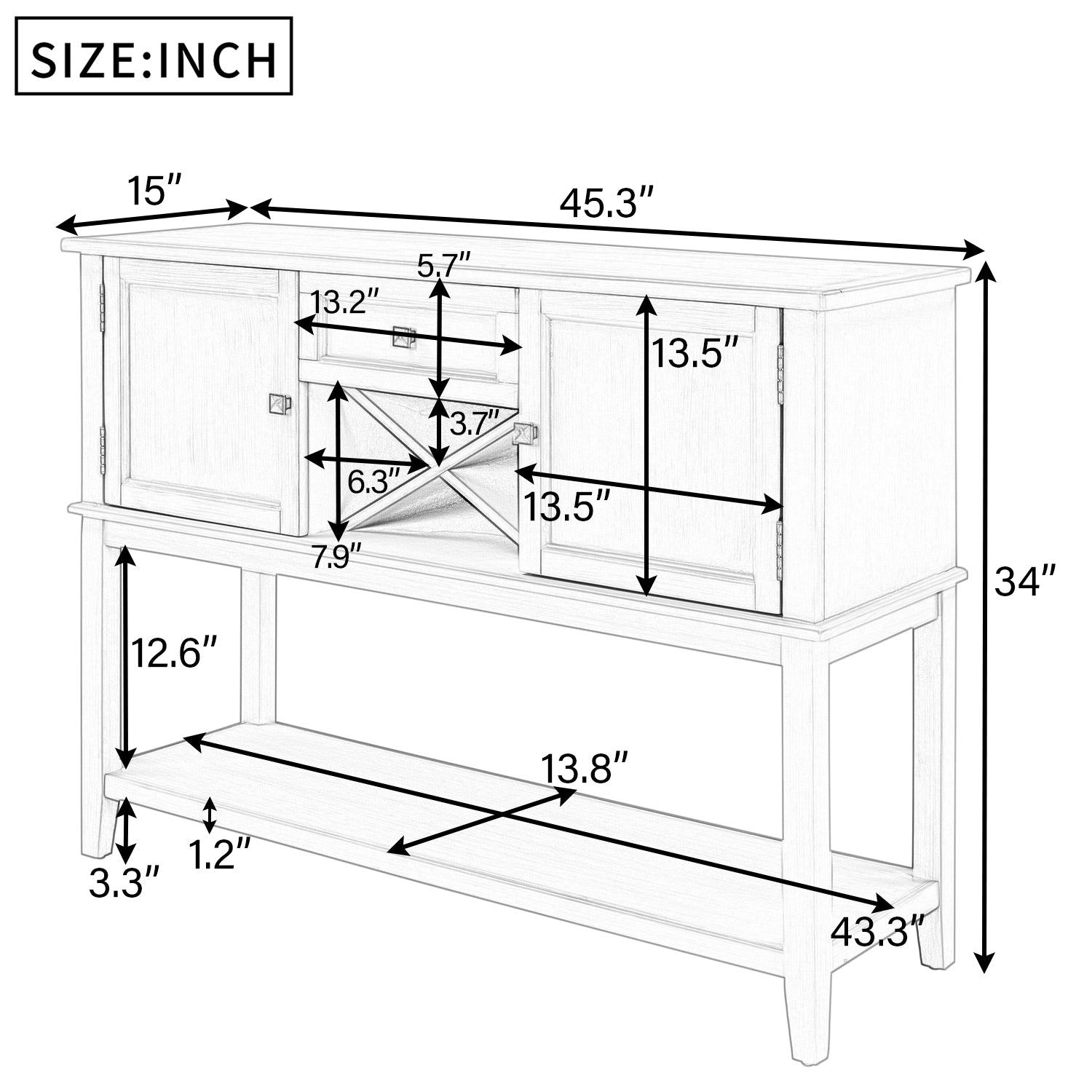 Large Storage Space: 45"L x15"W x 34"H. This sideboard with two buffet storage cabinet, one drawer, wine rack and lower open shelf can provide you enough storage space. Wine rack efficiently maximize storage space and prevent wine bottles scattered around.